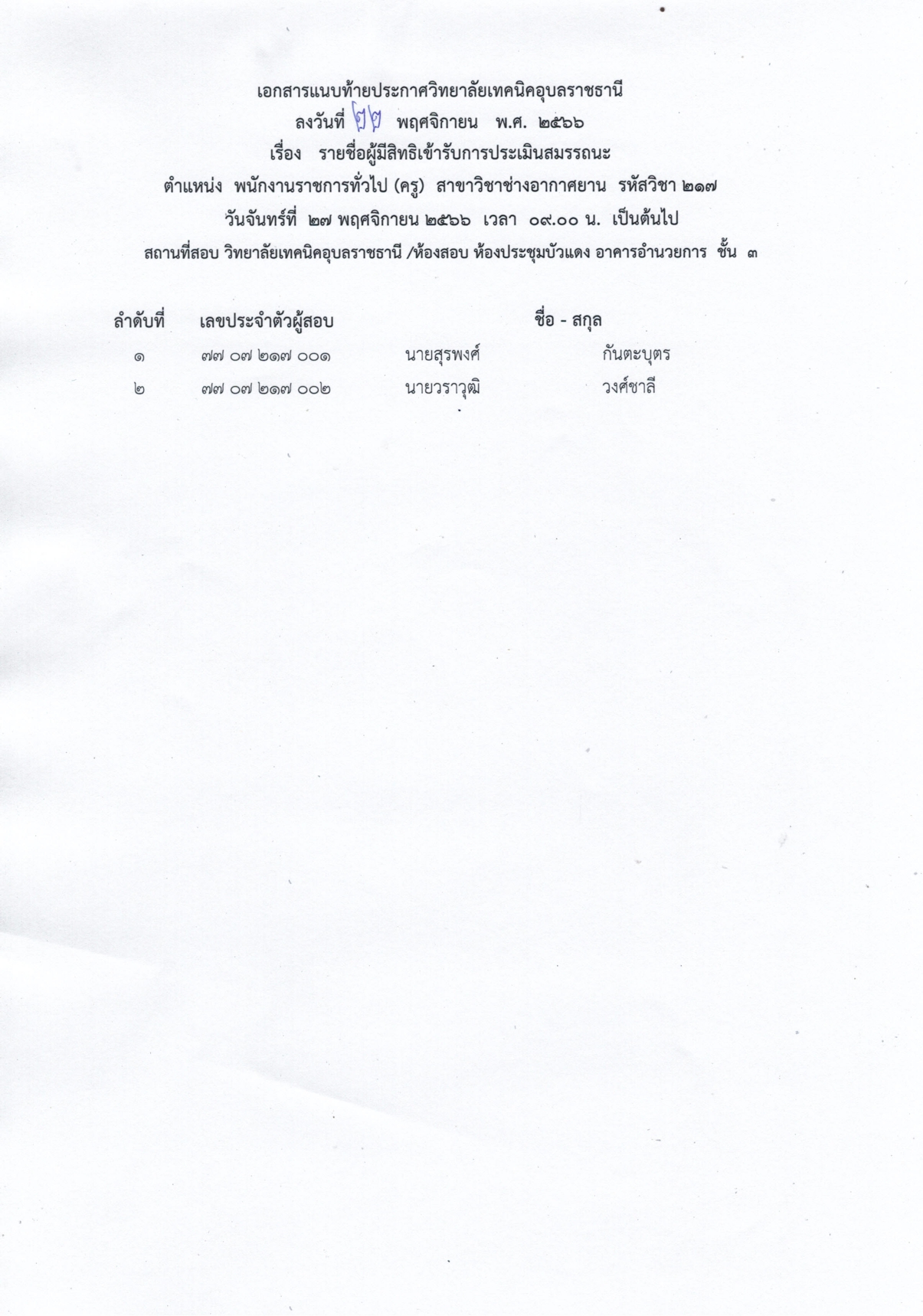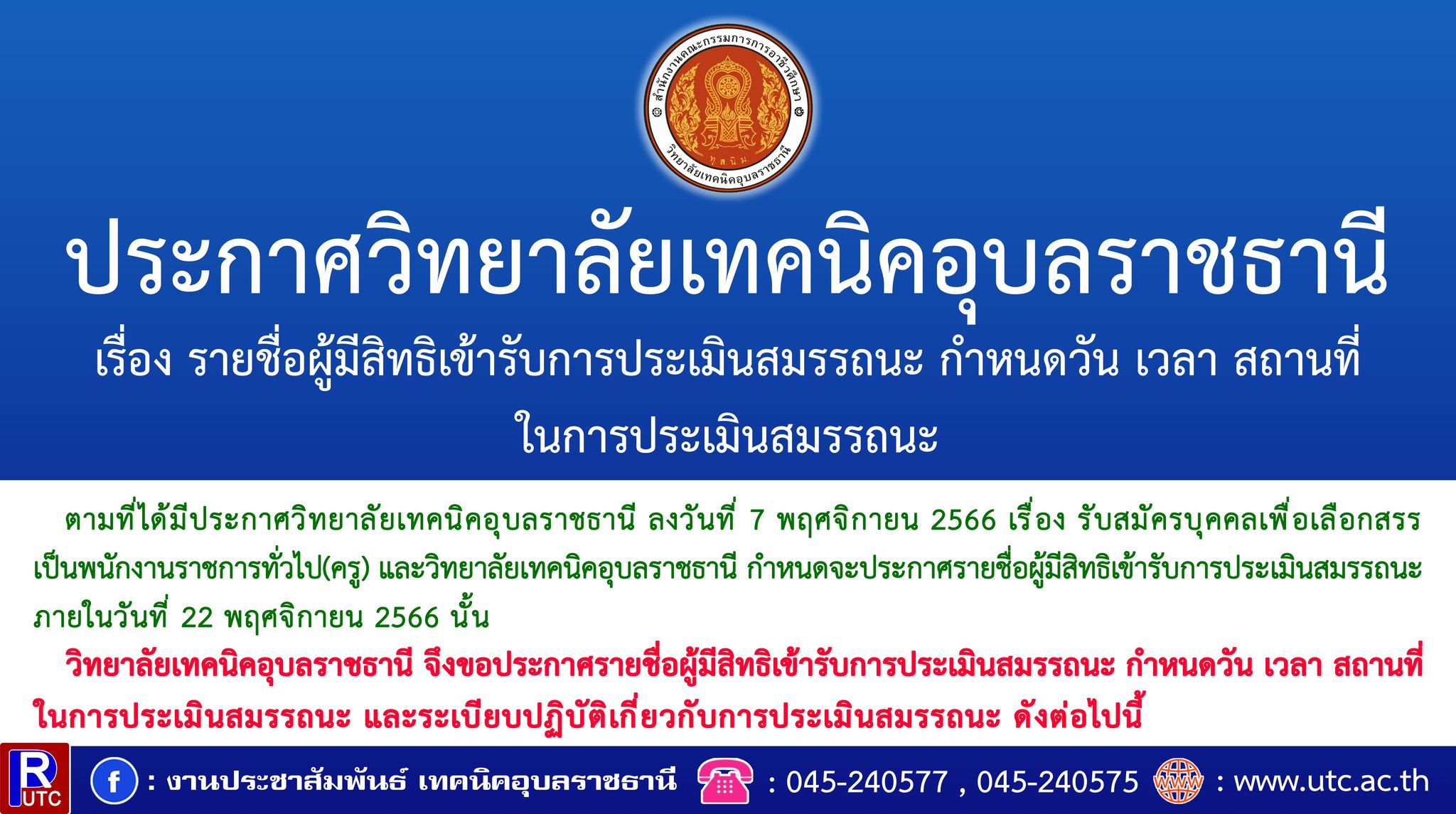ประกาศวิทยาลัยเทคนิคอุบลราชธานี เรื่อง รายชื่อผู้มีสิทธิเข้ารับการประเมินสมรรถนะ กำหนดวัน เวลา สถานที่ในการประเมินสมรรถนะ