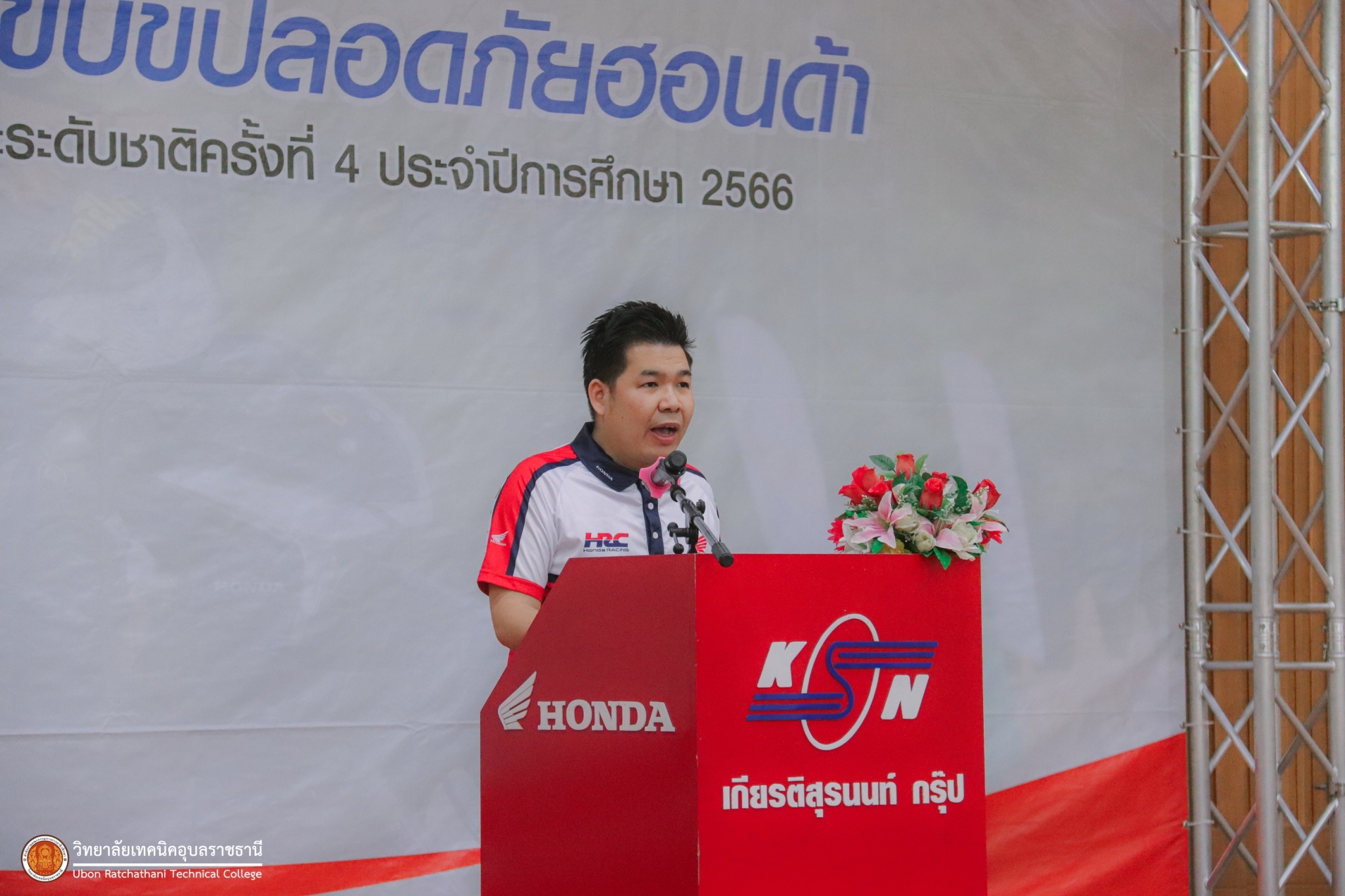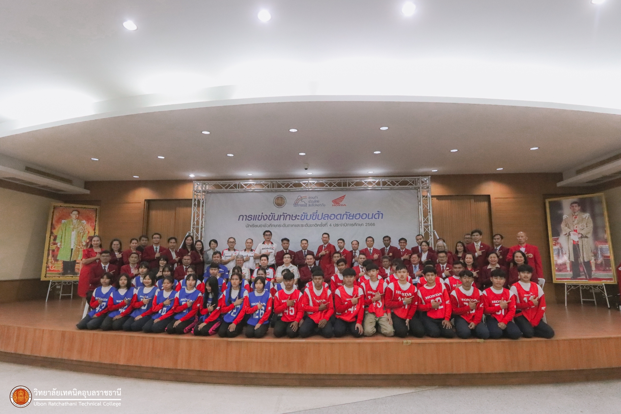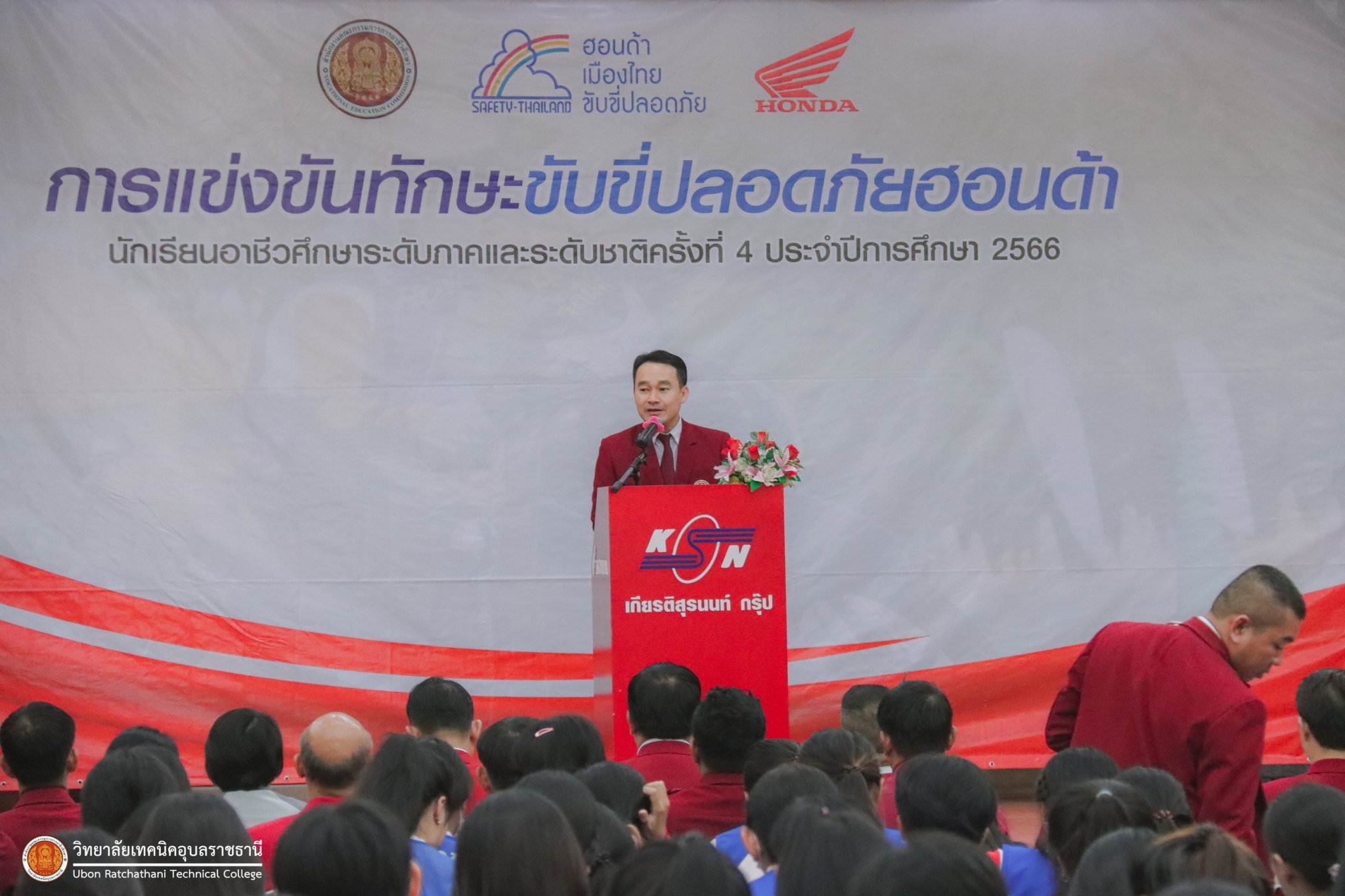 วันที่ ๒๓ พฤศจิกายน ๒๕๖๖ เวลา ๐๙.๐๐ น. นายธาตรี พิบูลมณฑา ผู้อำนวยการวิทยาลัยเทคนิคอุบลราชธานี ปฏิบัติหน้าที่ ผู้อำนวยการสำนักงานอาชีวศึกษาจังหวัดอุบลราชธานี มอบหมายให้ นายไวพจน์ ศรีธัญ รองผู้อำนวยการฝ่ายพัฒนากิจการนักเรียนนักศึกษา นางสาวสายฝน สาระผล รองผู้อำนวยการฝ่ายบริหารทรัพยากร นายกตนนท์ นาทัน หัวหน้าแผนกวิชาช่างยนต์/เครื่องกล เข้าร่วมพิธีเปิดการแข่งขันทักษะขับขี่ปลอดภัยฮอนด้า ครั้งที่ ๔ ประจำปีการศึกษา ๒๕๖๖ (ภาคตะวันออกเฉียงเหนือ) ณ ศูนย์ฝึกขับขี่ปลอดภัยฮอนด้า เกียรติสุรนนท์อุบลราชธานี ในการนี้ได้รับเกียรติจาก นายสง่า แต่เชื้อสาย ผู้ช่วยเลขาธิการคณะกรรมการการอาชีวศึกษา เป็นประธานในพิธี โดยมี นายสมเกียรติ หงส์เทศากร หัวหน้าเจ้าหน้าที่บริหารกลุ่มงานส่งเสริมการขับขี่ปลอดภัย บริษัท ไทยฮอนด้า จำกัด นายกิตติพล เกียรติสุรนนท์ รองกรรมการผู้จัดการ เกียรติสุรนนท์ กรุ๊ป พร้อมด้วยคณะผู้บริหารสถานศึกษา ครู และบุคลากรทางการศึกษา ในสังกัดสำนักงานอาชีวศึกษาจังหวัดอุบลราชธานี เข้าร่วมพิธีอย่างพร้อมเพรียง ทั้งนี้เพื่อพัฒนาทักษะการขับขี่ รวมทั้งการแลกเปลี่ยนความรู้ซึ่งกันและกัน เพื่อที่จะได้เผยแพร่ความรู้การขับขี่ปลอดภัยสู่สังคมอย่างมีประสิทธิภาพสูงสุดและสืบไปอย่างยั่งยืน