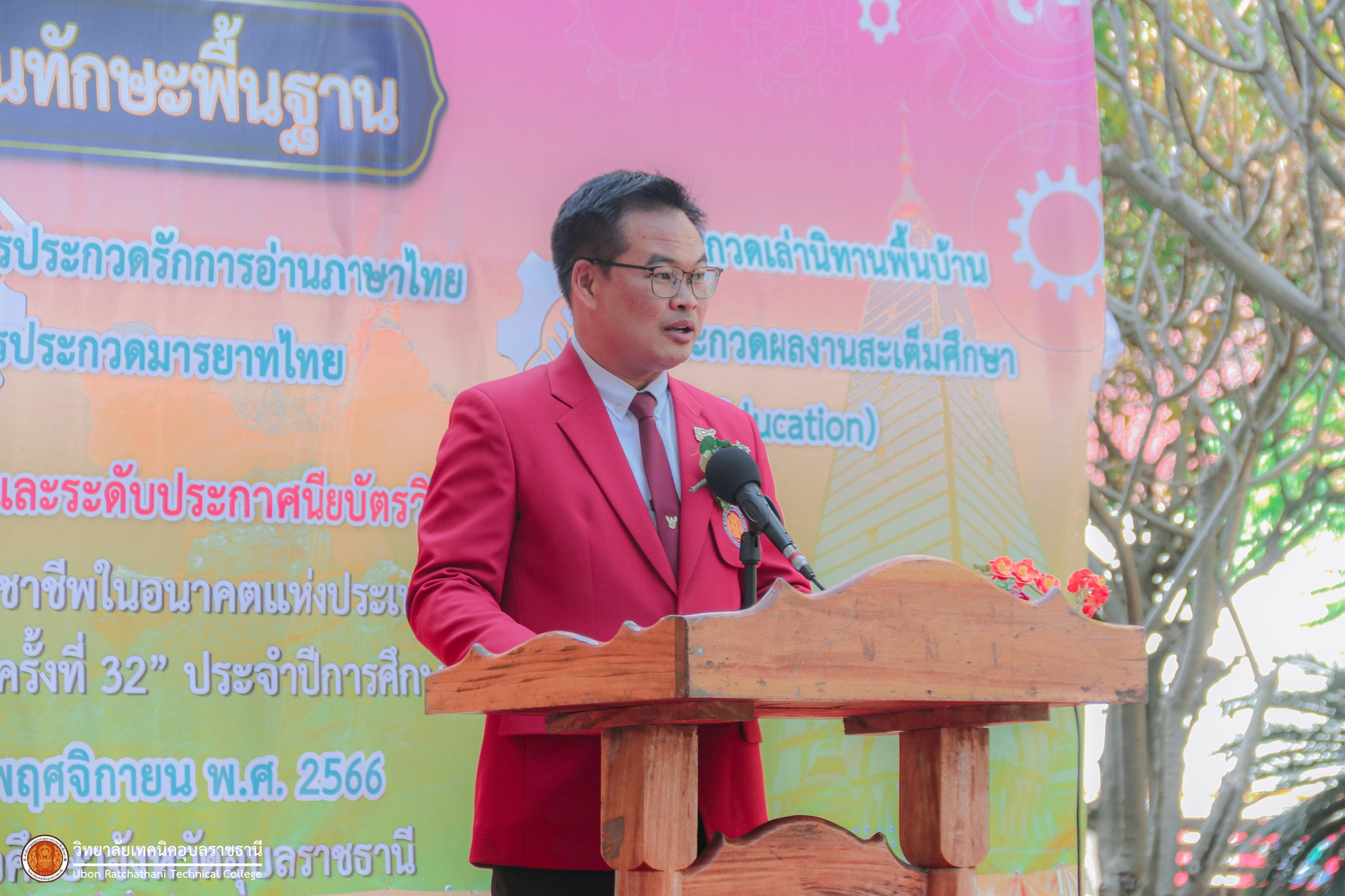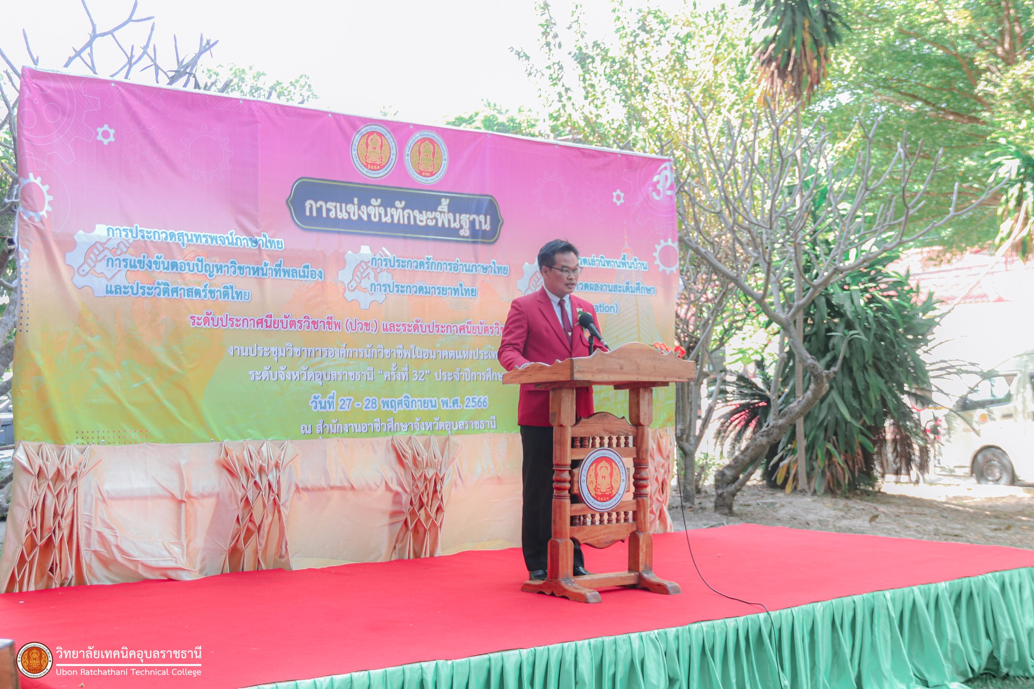 วันที่ ๒๗ พฤศจิกายน ๒๕๖๖ เวลา ๑๓.๐๐ น. นายธาตรีพิบูลมณฑา ผู้อำนวยการวิทยาลัยเทคนิคอุบลราชธานี ปฏิบัติหน้าที่ ผู้อำนวยการสำนักงานอาชีวศึกษาจังหวัดอุบลราชธานี มอบหมายให้ นายนิรันดร์ สมมุติ ผู้อำนวยการวิทยาลัยเทคนิคนครอุบลราชธานี เป็นประธานในพิธีเปิดงานประชุมวิชาการองค์การนักวิชาชีพในอนาคตแห่งประเทศไทย (อวท.) การแข่งขันทักษะพื้นฐาน ณ อาคาร ๕ แผนกวิชาสามัญสัมพันธ์ โดยมี นายไวพจน์ ศรีธัญ รองผู้อำนวยการฝ่ายพัฒนากิจการนักเรียนนักศึกษา นางสาวสายฝน สาระผล รองผู้อำนวยการฝ่ายบริหารทรัพยากร พร้อมด้วยคณะผู้บริหารสถานศึกษา ครู และนักเรียน นักศึกษา ในสังกัดสำนักงานอาชีวศึกษาจังหวัดอุบลราชธานี เข้าร่วมพิธีอย่างพร้อมเพรียง ทั้งนี้การแข่งขันทักษะทุกรายการนั้น มีวัตถุประสงค์ในการคัดเลือกตัวแทนนักเรียน นักศึกษา ระดับอาชีวศึกษาจังหวัดอุบลราชธานี เพื่อไปเข้าร่วมการแข่งขันทักษะวิชาพื้นฐาน ระดับภาคต่อไป