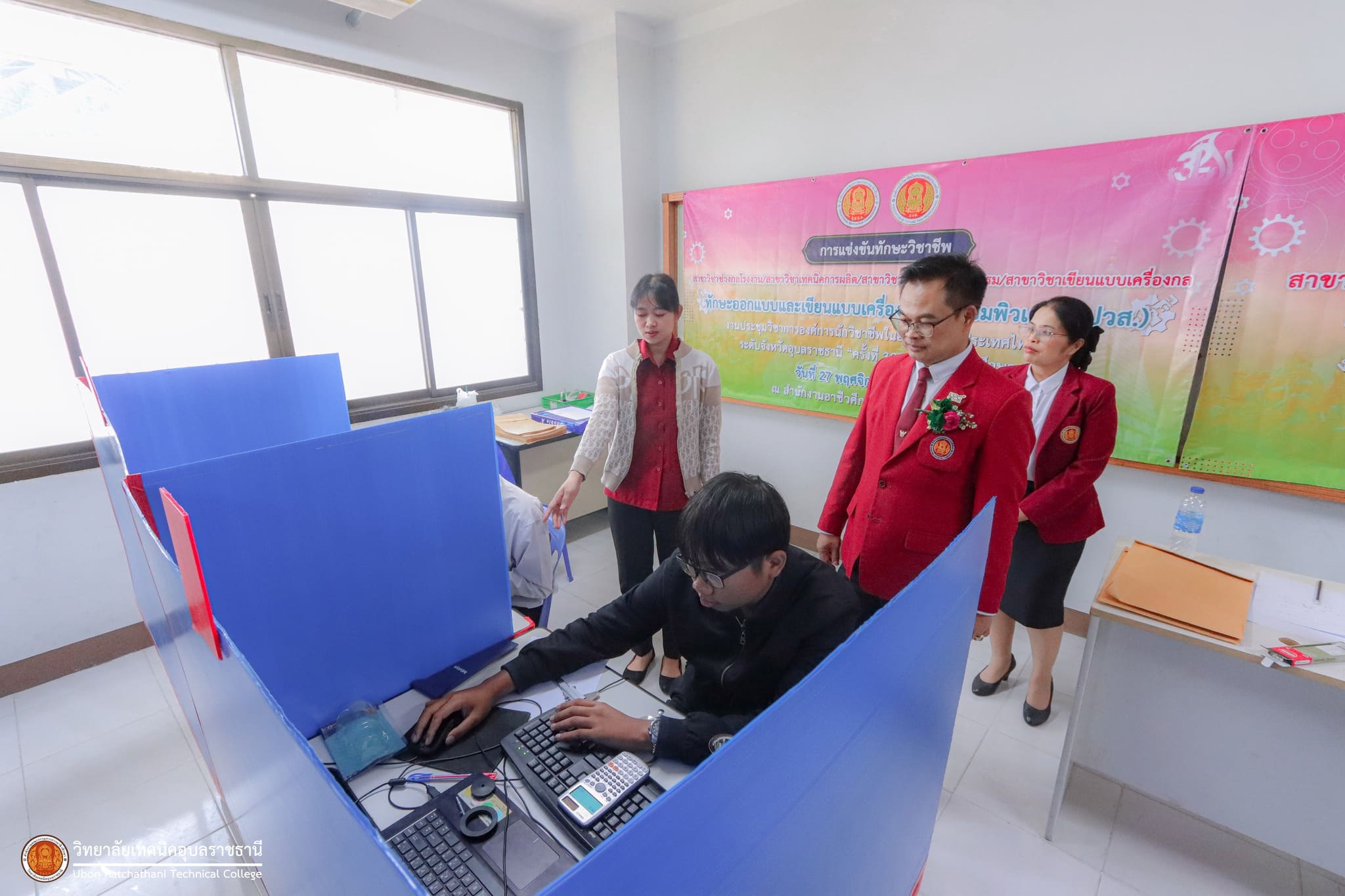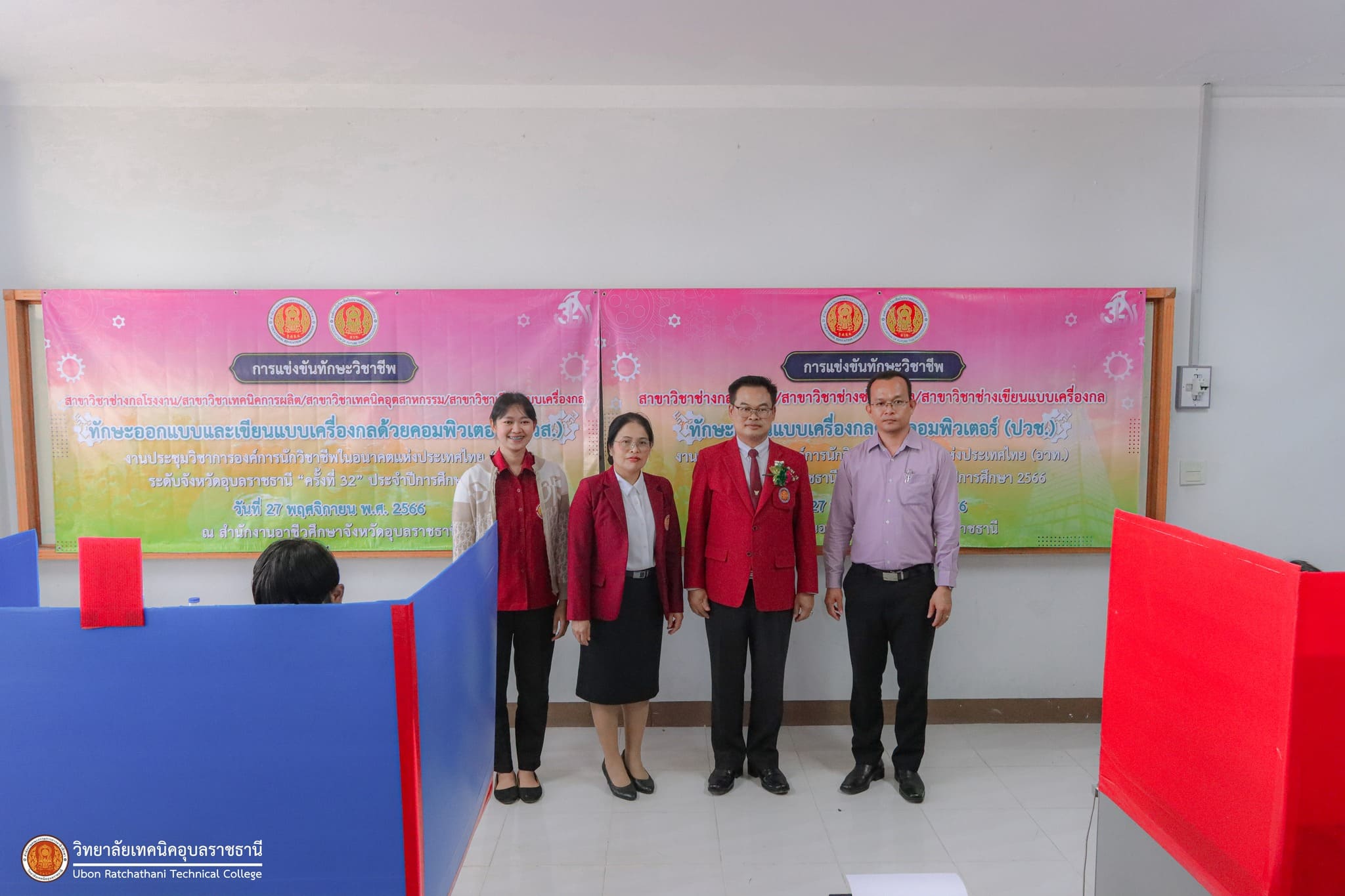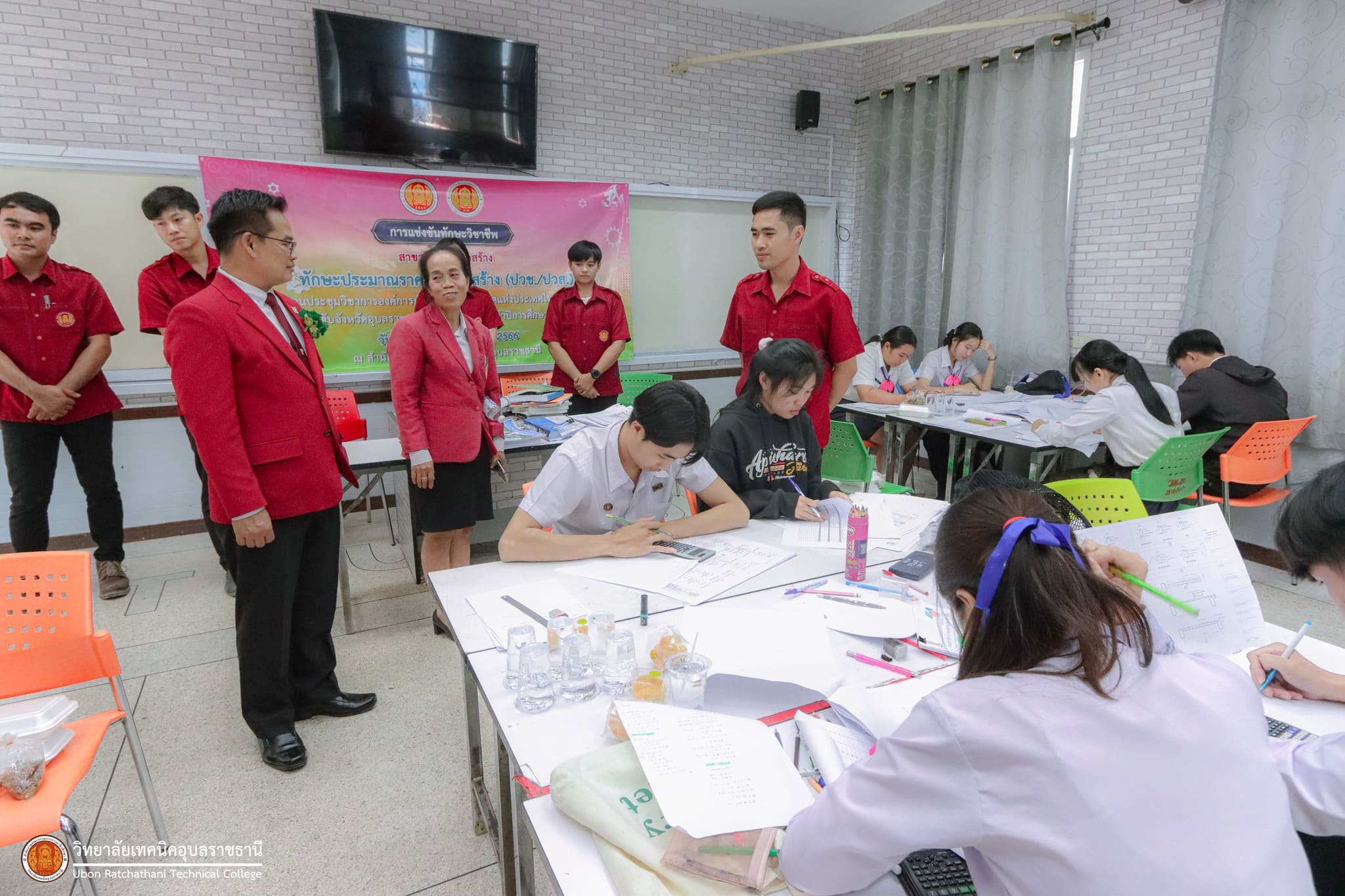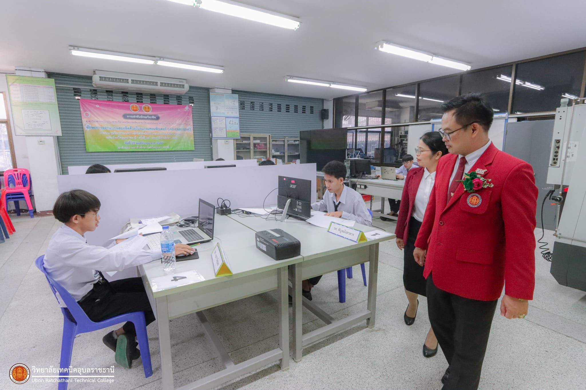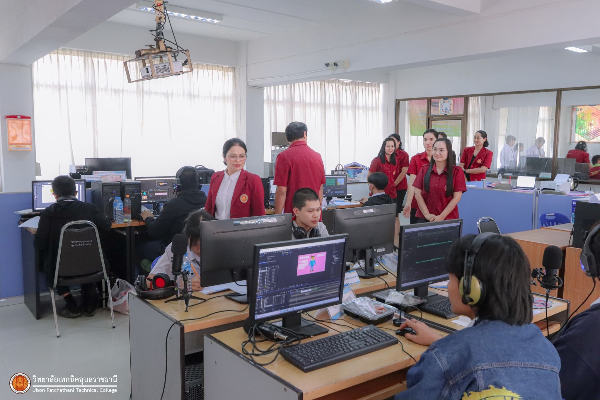 วันที่ ๒๗ พฤศจิกายน ๒๕๖๖ เวลา ๑๓.๓๐ น. นายธาตรี พิบูลมณฑา ผู้อำนวยการวิทยาลัยเทคนิคอุบลราชธานี ปฏิบัติหน้าที่ผู้อำนวยการสำนักงานอาชีวศึกษาจังหวัดอุบลราชธานี มอบหมายให้ นายนิรันดร์ สมมุติ ผู้อำนวยการวิทยาลัยเทคนิคนครอุบลราชธานี พร้อมด้วย นางสาวสายฝน สาระผล รองผู้อำนวยการฝ่ายบริหารทรัพยากร เข้าตรวจเยี่ยมคณะครูผู้ควบคุม และนักเรียน นักศึกษา ผู้เข้าร่วมการแข่งขันทักษะวิชาชีพ ซึ่งได้แก่ ๑.ทักษะงานปูน (ปวช.) ทักษะงานไม้และงานสี (ปวช.) และทักษะประมาณราคางานก่อสร้าง (ปวช./ปวส.) ณ แผนกวิชาโยธา ๒.ทักษะการออกแบบและผลิตด้วยโปรแกรมคอมพิวเตอร์ CAD-CAM (ปวส.) ทักษะเขียนแบบเครื่องกลด้วยคอมพิวเตอร์ (ปวช.) ทักษะออกแบบและเขียนแบบเครื่องกลด้วยคอมพิวเตอร์ (ปวส.) และทักษะมาตรวิทยามิติ (ปวส.) ณ แผนกวิชาช่างกลโรงงาน ๓.ทักษะงานกลึงชิ้นงาน (ปวช.) ทักษะการพัฒนานวัตกรรมธุรกิจดิจิทัล (ปวส.) และทักษะการพัฒนาสื่อประชาสัมพันธ์ โมชั่นกราฟิก (ปวช.) ณ วิทยาลัยเทคนิคนครอุบลราชธานี ทั้งนี้การแข่งขันทักษะทุกรายการนั้น มีวัตถุประสงค์ในการคัดเลือกตัวแทนนักเรียน นักศึกษา ระดับอาชีวศึกษาจังหวัดอุบลราชธานี เพื่อไปเข้าร่วมการแข่งขันทักษะวิชาชีพและทักษะพื้นฐาน ระดับภาคต่อไป