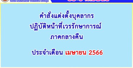 แต่งตั้งบุคคลากรในสังกัดปฏิบัติหน้าที่เวรรักษาการณ์ ภาคกลางคืน ประจำเดือนเมษายน 2566
