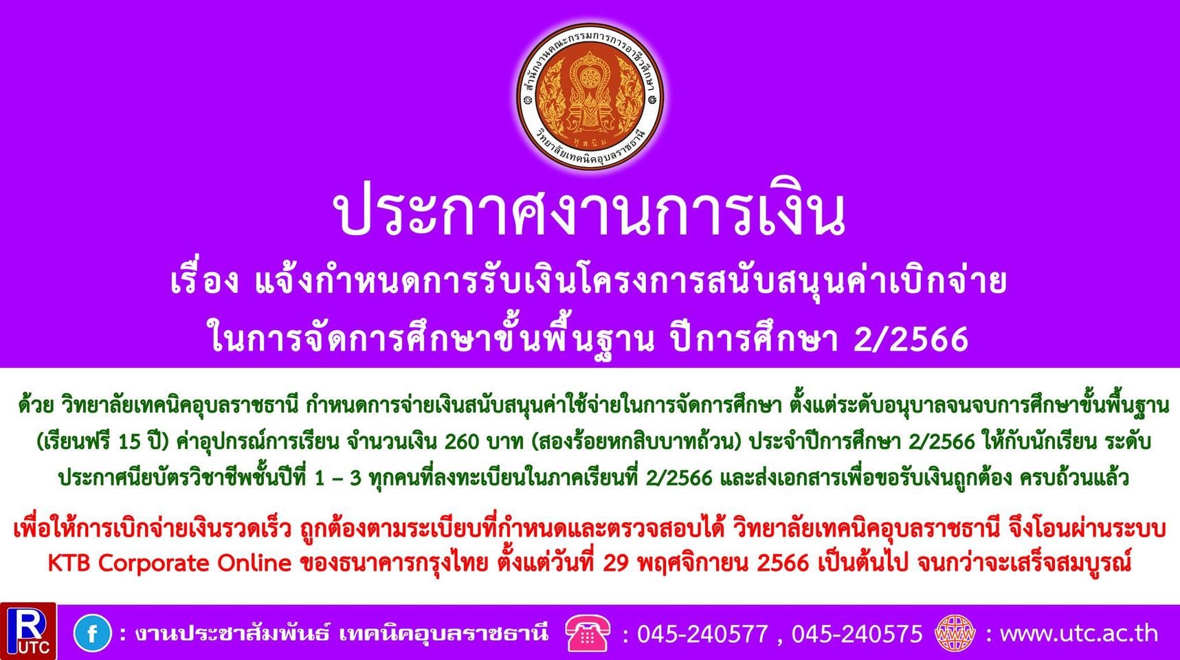 เพื่อให้การเบิกจ่ายเงินรวดเร็ว ถูกต้องตามระเบียบที่กำหนดและตรวจสอบได้ วิทยาลัยเทคนิคอุบลราชธานี จึงโอนผ่านระบบ KTB Corporate Online ของธนาคารกรุงไทย ตั้งแต่วันที่ 29 พฤศจิกายน 2566 เป็นต้นไป จนกว่าจะเสร็จสมบูรณ์