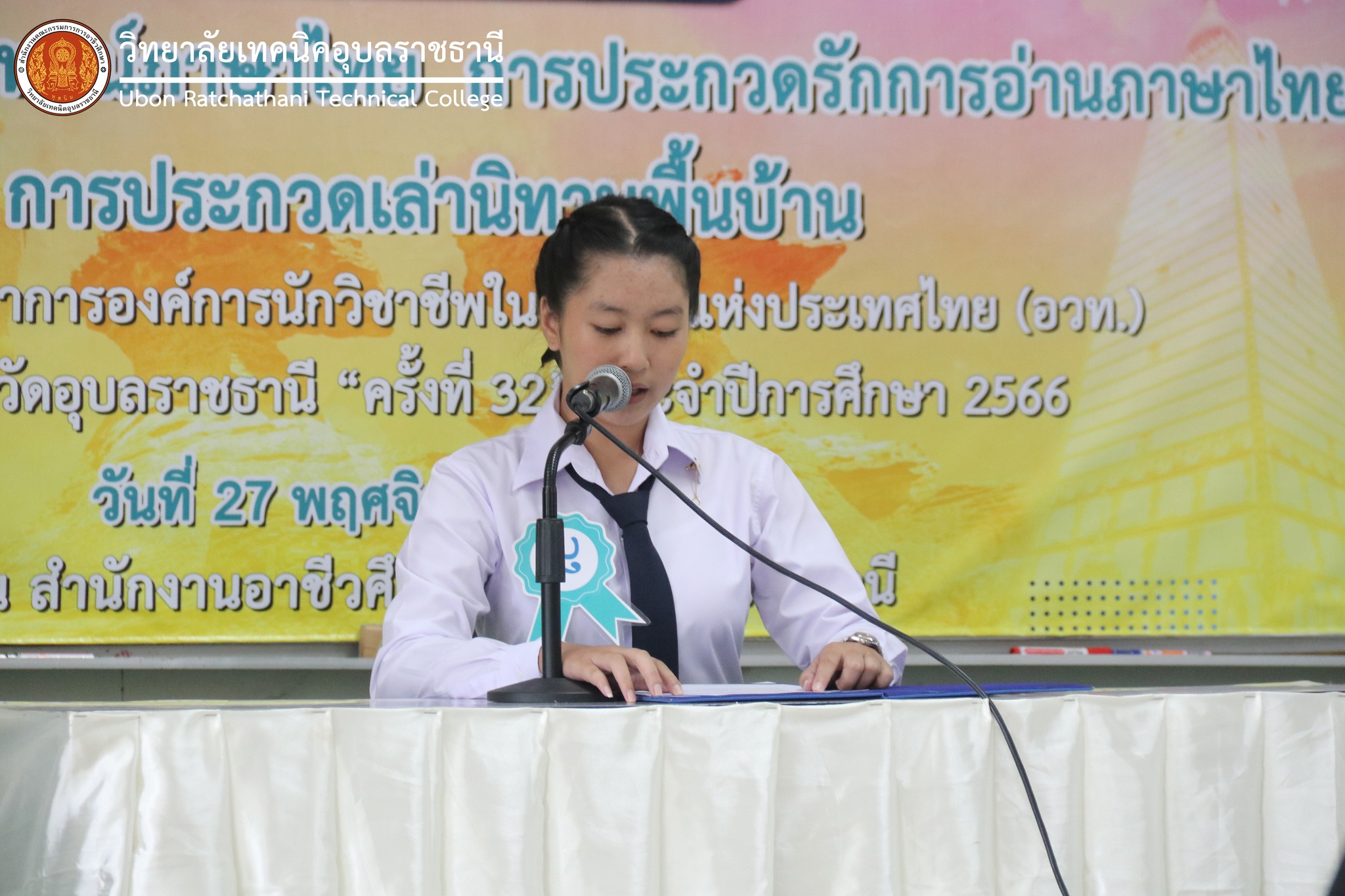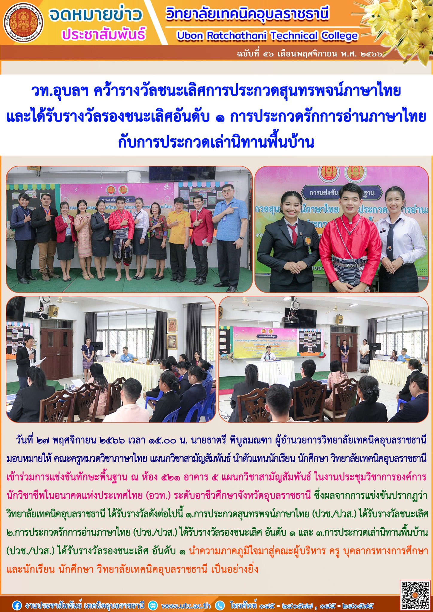 นที่ ๒๗ พฤศจิกายน ๒๕๖๖ เวลา ๑๕.๐๐ น. นายธาตรี พิบูลมณฑา ผู้อำนวยการวิทยาลัยเทคนิคอุบลราชธานี มอบหมายให้ คณะครูหมวดวิชาภาษาไทย แผนกวิชาสามัญสัมพันธ์ นำตัวแทนนักเรียน นักศึกษา วิทยาลัยเทคนิคอุบลราชธานี เข้าร่วมการแข่งขันทักษะพื้นฐาน ณ ห้อง ๕๒๑ อาคาร ๕ แผนกวิชาสามัญสัมพันธ์ ในงานประชุมวิชาการองค์การนักวิชาชีพในอนาคตแห่งประเทศไทย (อวท.) ระดับอาชีวศึกษาจังหวัดอุบลราชธานี ซึ่งผลจากการแข่งขันปรากฏว่า วิทยาลัยเทคนิคอุบลราชธานี ได้รับรางวัลดังต่อไปนี้ ๑.การประกวดสุนทรพจน์ภาษาไทย (ปวช./ปวส.) ได้รับรางวัลชนะเลิศ ๒.การประกวดรักการอ่านภาษาไทย (ปวช./ปวส.) ได้รับรางวัลรองชนะเลิศ อันดับ ๑ และ ๓.การประกวดเล่านิทานพื้นบ้าน (ปวช./ปวส.) ได้รับรางวัลรองชนะเลิศ อันดับ ๑ นำความภาคภูมิใจมาสู่คณะผู้บริหาร ครู บุคลากรทางการศึกษา และนักเรียน นักศึกษา วิทยาลัยเทคนิคอุบลราชธานี เป็นอย่างยิ่ง