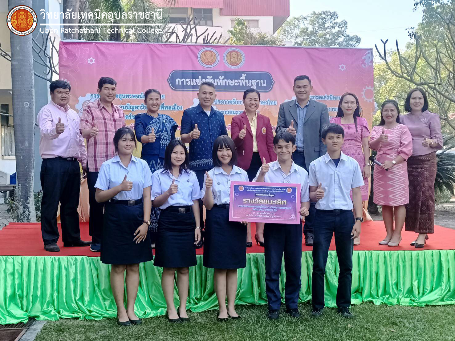 วันที่ ๒๘ พฤศจิกายน ๒๕๖๖ เวลา ๑๖.๐๐ น. นายธาตรี พิบูลมณฑา ผู้อำนวยการวิทยาลัยเทคนิคอุบลราชธานี ปฏิบัติหน้าที่ ผู้อำนวยการสำนักงานอาชีวศึกษาจังหวัดอุบลราชธานี มอบหมายให้ นางชัญญณัท จันเทพา ผู้อำนวยการวิทยาลัยเทคนิคเขมราฐ เป็นประธานในพิธีปิดและแสดงความยินดีกับนักเรียน นักศึกษา ที่ได้รับรางวัลในงานประชุมวิชาการองค์การนักวิชาชีพในอนาคตแห่งประเทศไทย (อวท.) การแข่งขันทักษะพื้นฐาน ณ แผนกวิชาสามัญสัมพันธ์ ซึ่งผลจากการแข่งขันปรากฏว่า วิทยาลัยเทคนิคอุบลราชธานี ได้รับรางวัลชนะเลิศ การประกวดผลงานสะเต็มศึกษา (STEM Education) ในระดับประกาศนียบัตรวิชาชีพ (ปวช.) โดยมีคณะครู หมวดวิชาวิทยาศาสตร์และหมวดวิชาคณิตศาสตร์ แผนกวิชาสามัญสัมพันธ์ เป็นครูผู้ควบคุม นำความภาคภูมิใจมาสู่คณะผู้บริหาร ครู บุคลากรทางการศึกษา และนักเรียน นักศึกษา วิทยาลัยเทคนิคอุบลราชธานี เป็นอย่างยิ่ง ทั้งนี้มีนายไวพจน์ ศรีธัญ รองผู้อำนวยการฝ่ายพัฒนากิจการนักเรียนนักศึกษา พร้อมด้วยคณะผู้บริหารสถานศึกษา ครู และนักเรียน นักศึกษา ในสังกัดสำนักงานอาชีวศึกษาจังหวัดอุบลราชธานี ร่วมแสดงความยินดีอย่างพร้อมเพรียง