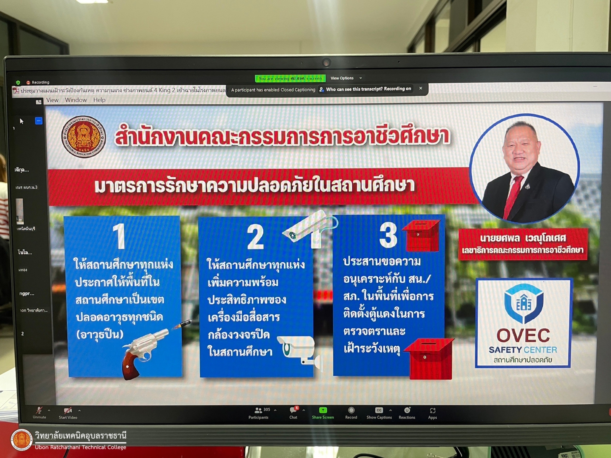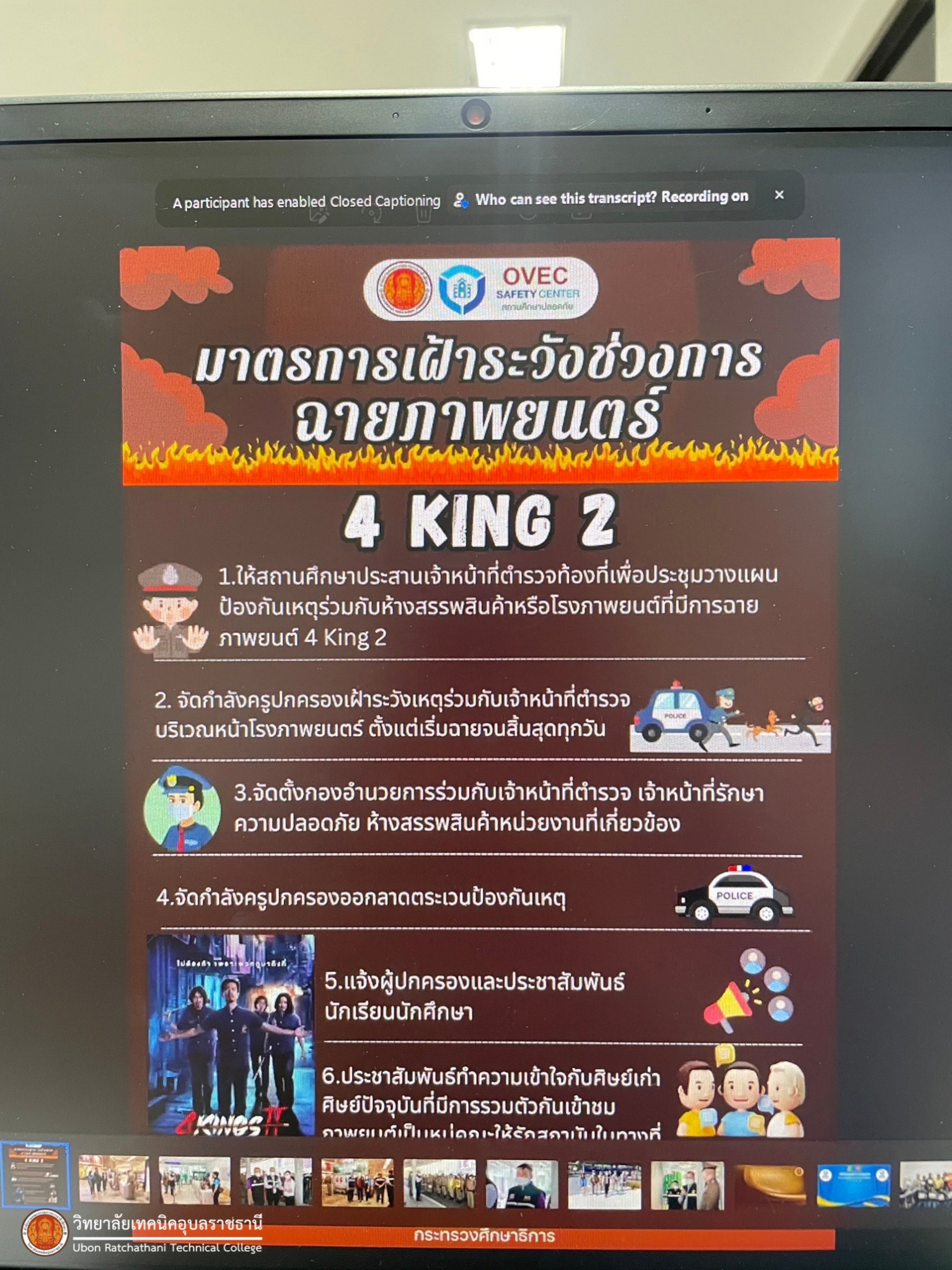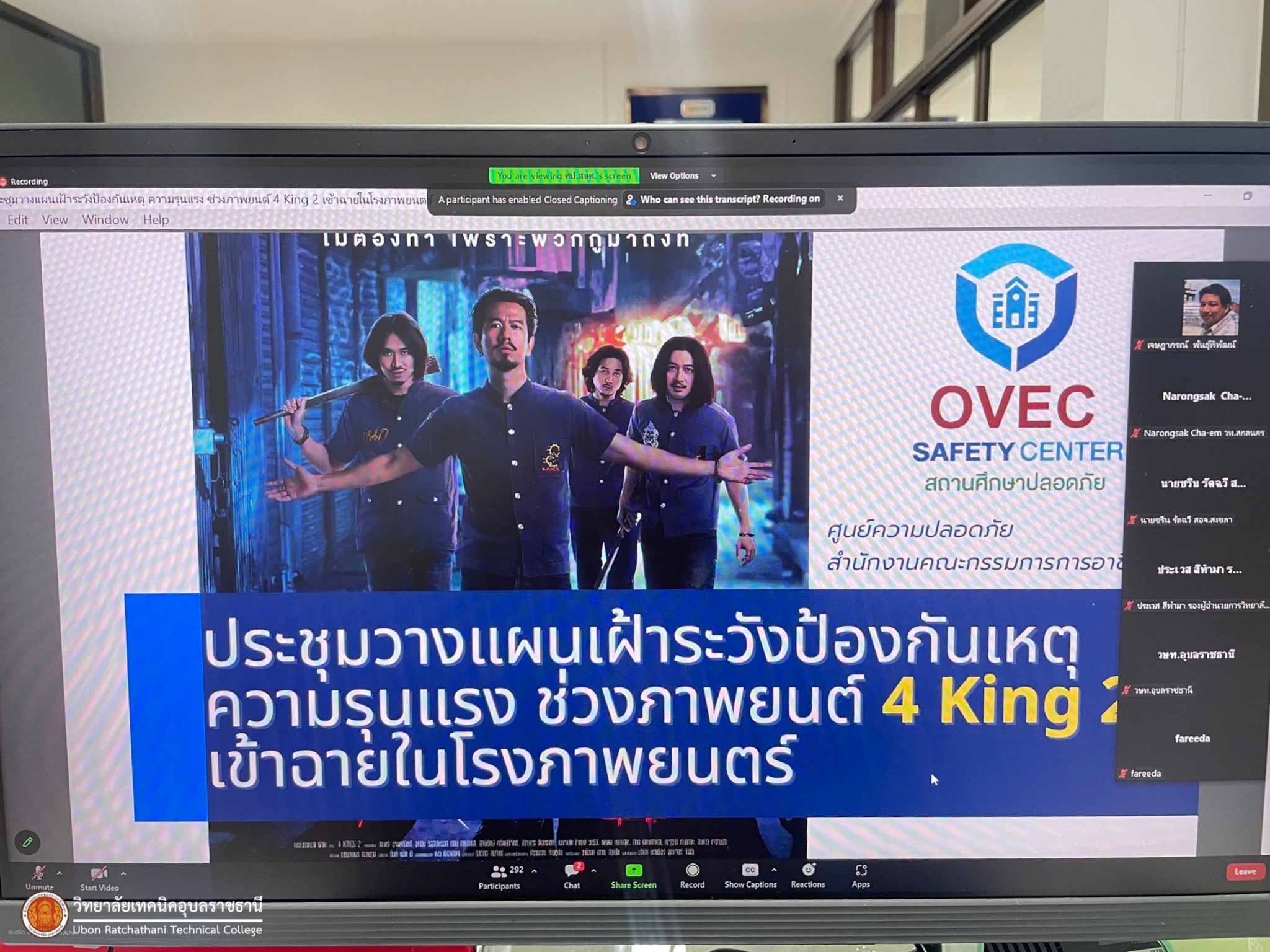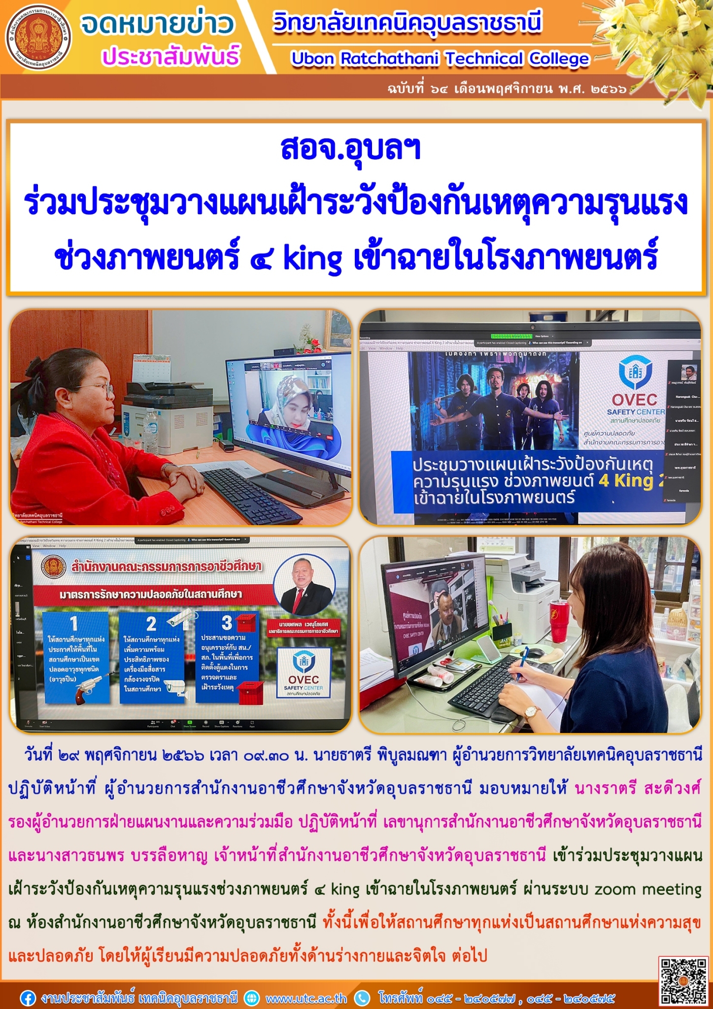 วันที่ ๒๙ พฤศจิกายน ๒๕๖๖ เวลา ๐๙.๓๐ น. นายธาตรี พิบูลมณฑา ผู้อำนวยการวิทยาลัยเทคนิคอุบลราชธานี ปฏิบัติหน้าที่ ผู้อำนวยการสำนักงานอาชีวศึกษาจังหวัดอุบลราชธานี มอบหมายให้ นางราตรี สะดีวงศ์ รองผู้อำนวยการฝ่ายแผนงานและความร่วมมือ ปฏิบัติหน้าที่ เลขานุการสำนักงานอาชีวศึกษาจังหวัดอุบลราชธานี และนางสาวธนพร บรรลือหาญ เจ้าหน้าที่สำนักงานอาชีวศึกษาจังหวัดอุบลราชธานี เข้าร่วมประชุมวางแผนเฝ้าระวังป้องกันเหตุความรุนแรงช่วงภาพยนตร์ ๔ king เข้าฉายในโรงภาพยนตร์ ผ่านระบบ zoom meeting ณ ห้องสำนักงานอาชีวศึกษาจังหวัดอุบลราชธานี ทั้งนี้เพื่อให้สถานศึกษาทุกแห่งเป็นสถานศึกษาแห่งความสุขและปลอดภัย โดยให้ผู้เรียนมีความปลอดภัยทั้งด้านร่างกายและจิตใจ ต่อไป