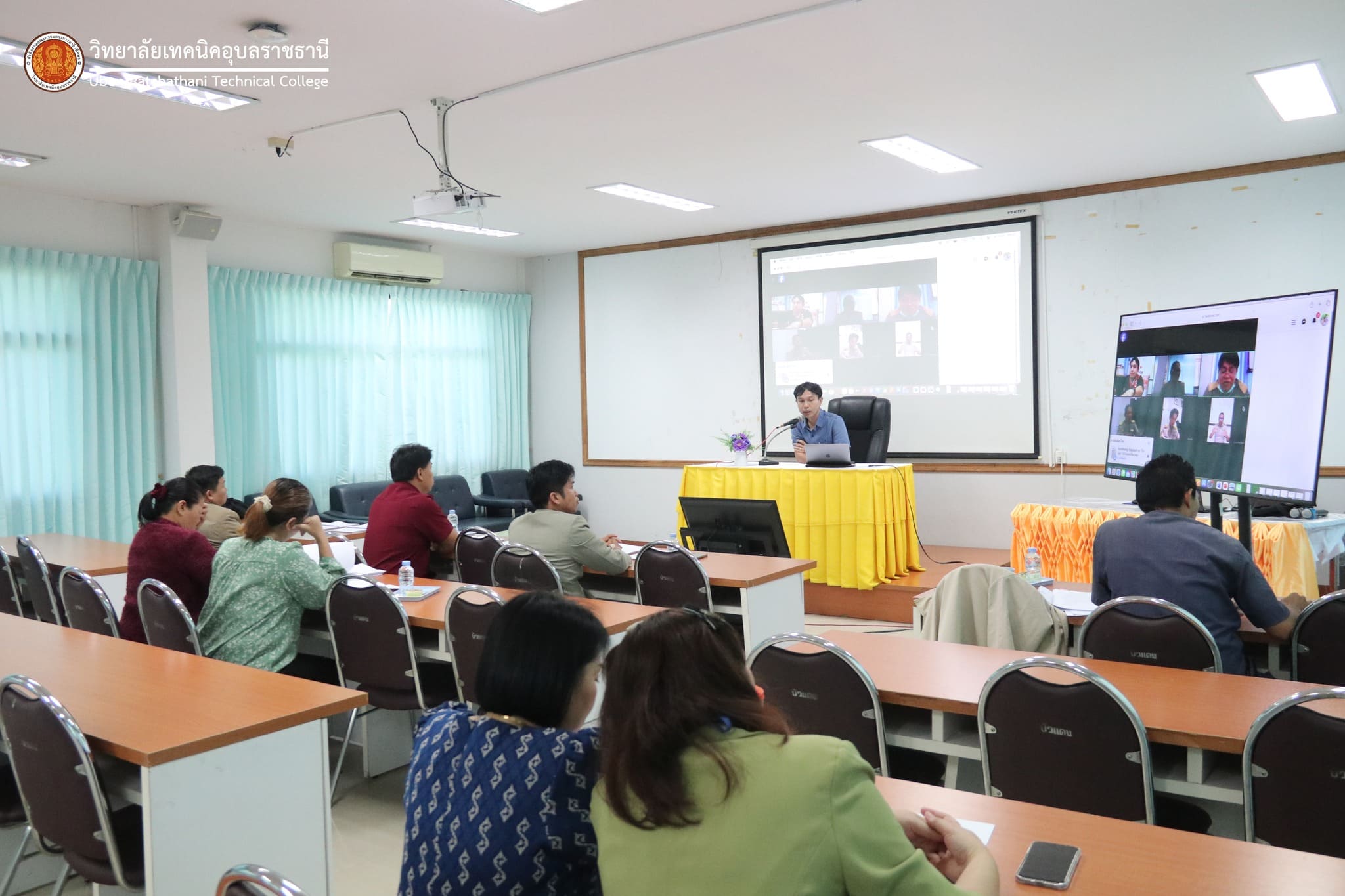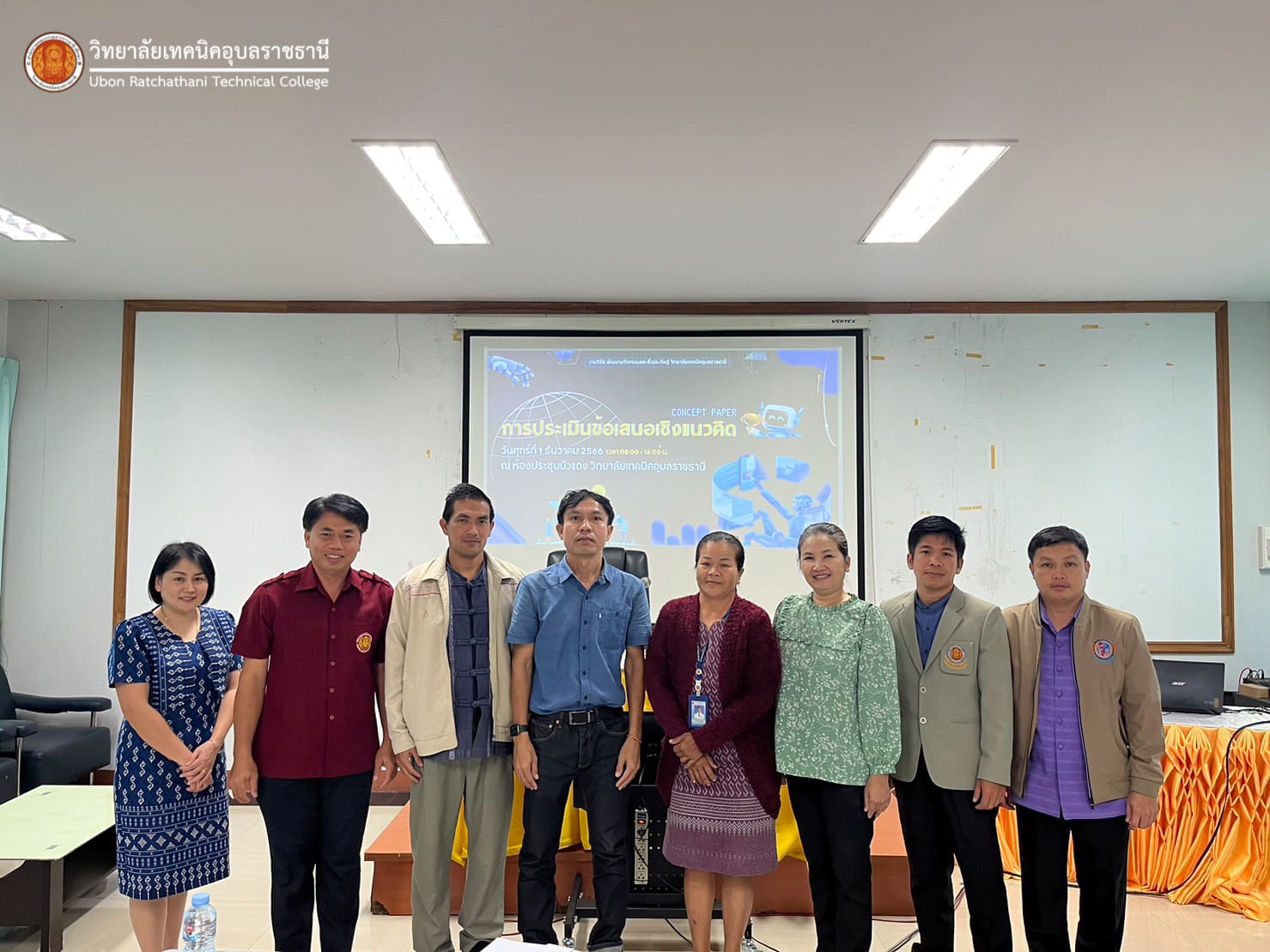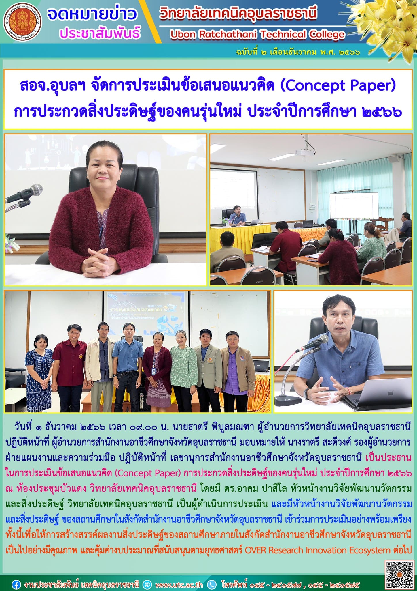 วันที่ ๑ ธันวาคม ๒๕๖๖ เวลา ๐๙.๐๐ น. นายธาตรี พิบูลมณฑา ผู้อำนวยการวิทยาลัยเทคนิคอุบลราชธานี ปฏิบัติหน้าที่ ผู้อำนวยการสำนักงานอาชีวศึกษาจังหวัดอุบลราชธานี มอบหมายให้ นางราตรี สะดีวงศ์ รองผู้อำนวยการฝ่ายแผนงานและความร่วมมือ ปฏิบัติหน้าที่ เลขานุการสำนักงานอาชีวศึกษาจังหวัดอุบลราชธานี เป็นประธานในการประเมินข้อเสนอแนวคิด (Concept Paper) การประกวดสิ่งประดิษฐ์ของคนรุ่นใหม่ ประจำปีการศึกษา ๒๕๖๖ ณ ห้องประชุมบัวแดง วิทยาลัยเทคนิคอุบลราชธานี โดยมี ดร.อาคม ปาสีโล หัวหน้างานวิจัยพัฒนานวัตกรรมและสิ่งประดิษฐ์ วิทยาลัยเทคนิคอุบลราชธานี เป็นผู้ดำเนินการประเมิน และมีหัวหน้างานวิจัยพัฒนานวัตกรรมและสิ่งประดิษฐ์ ของสถานศึกษาในสังกัดสำนักงานอาชีวศึกษาจังหวัดอุบลราชธานี เข้าร่วมการประเมินอย่างพร้อมเพรียง ทั้งนี้เพื่อให้การสร้างสรรค์ผลงานสิ่งประดิษฐ์ของสถานศึกษาภายในสังกัดสำนักงานอาชีวศึกษาจังหวัดอุบลราชธานีเป็นไปอย่างมีคุณภาพ และคุ้มค่างบประมาณที่สนับสนุนตามยุทธศาสตร์ OVER Research Innovation Ecosystem ต่อไป