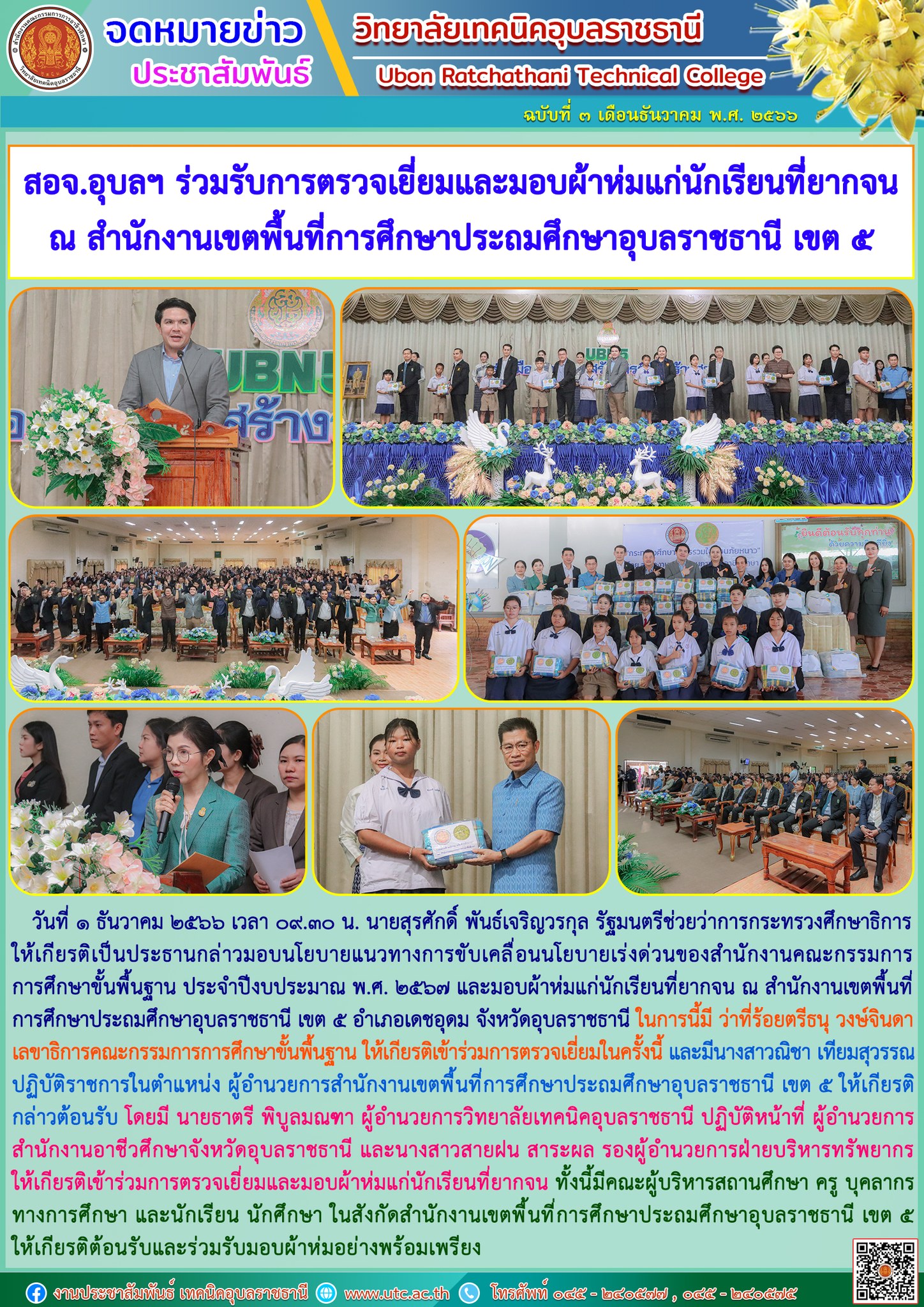 วันที่ ๑ ธันวาคม ๒๕๖๖ เวลา ๐๙.๓๐ น. นายสุรศักดิ์ พันธ์เจริญวรกุล รัฐมนตรีช่วยว่าการกระทรวงศึกษาธิการ ให้เกียรติเป็นประธานกล่าวมอบนโยบายแนวทางการขับเคลื่อนนโยบายเร่งด่วนของสำนักงานคณะกรรมการการศึกษาขั้นพื้นฐาน ประจำปีงบประมาณ พ.ศ. ๒๕๖๗ และมอบผ้าห่มแก่นักเรียนที่ยากจน ณ สำนักงานเขตพื้นที่การศึกษาประถมศึกษาอุบลราชธานี เขต ๕ อำเภอเดชอุดม จังหวัดอุบลราชธานี ในการนี้มี ว่าที่ร้อยตรีธนุ วงษ์จินดา เลขาธิการคณะกรรมการการศึกษาขั้นพื้นฐาน ให้เกียรติเข้าร่วมการตรวจเยี่ยมในครั้งนี้ และมีนางสาวณิชา เทียมสุวรรณ ปฏิบัติราชการในตำแหน่ง ผู้อำนวยการสำนักงานเขตพื้นที่การศึกษาประถมศึกษาอุบลราชธานี เขต ๕ ให้เกียรติกล่าวต้อนรับ โดยมี นายธาตรี พิบูลมณฑา ผู้อำนวยการวิทยาลัยเทคนิคอุบลราชธานี ปฏิบัติหน้าที่ ผู้อำนวยการสำนักงานอาชีวศึกษาจังหวัดอุบลราชธานี และนางสาวสายฝน สาระผล รองผู้อำนวยการฝ่ายบริหารทรัพยากร ให้เกียรติเข้าร่วมการตรวจเยี่ยมและมอบผ้าห่มแก่นักเรียนที่ยากจน ทั้งนี้มีคณะผู้บริหารสถานศึกษา ครู บุคลากรทางการศึกษา และนักเรียน นักศึกษา ในสังกัดสำนักงานเขตพื้นที่การศึกษาประถมศึกษาอุบลราชธานี เขต ๕ ให้เกียรติต้อนรับและร่วมรับมอบผ้าห่มอย่างพร้อมเพรียง