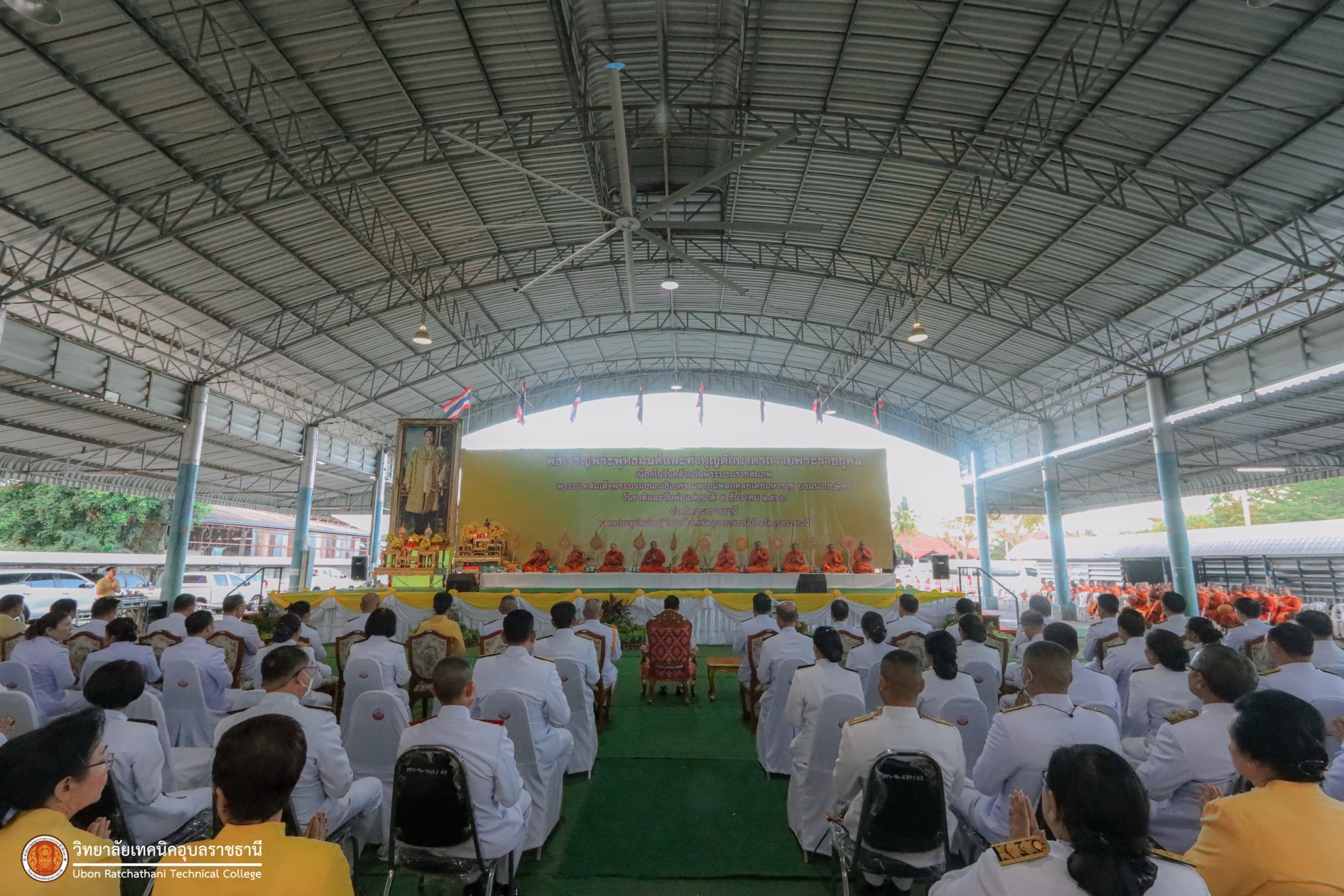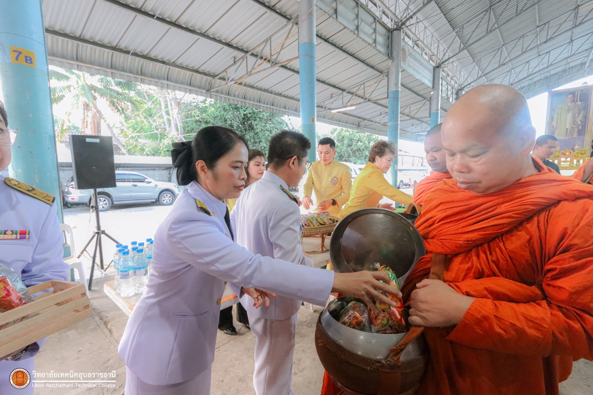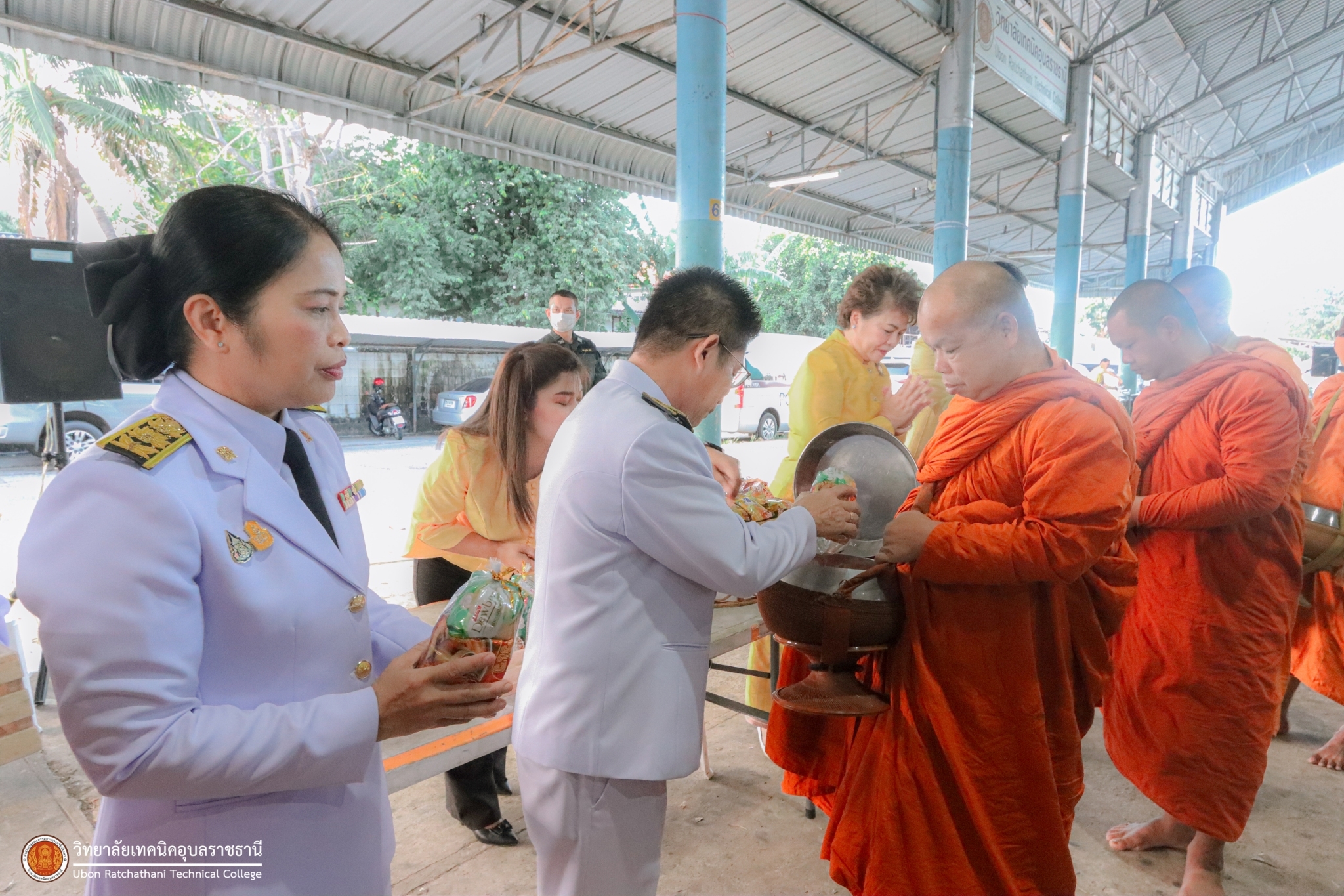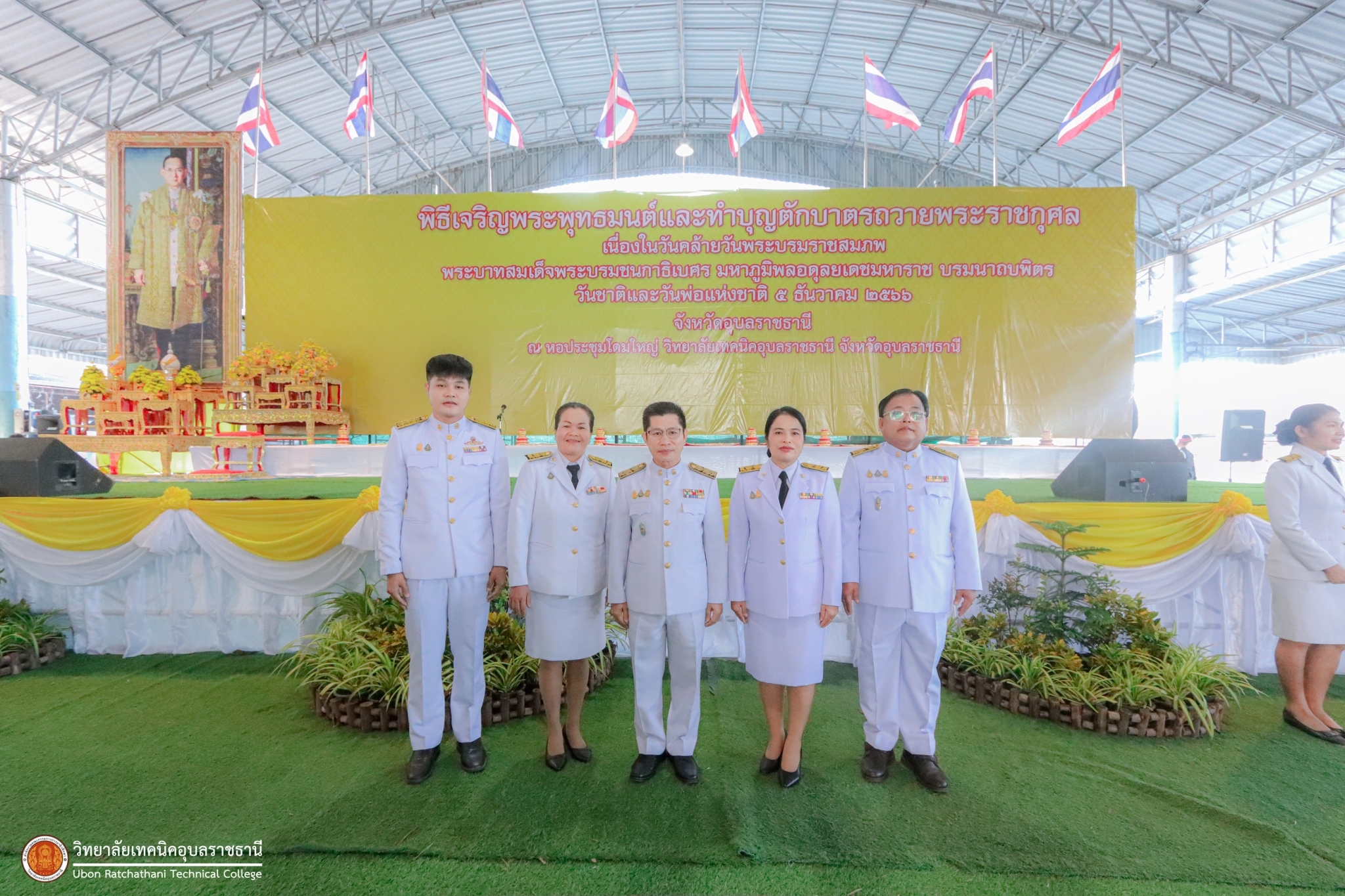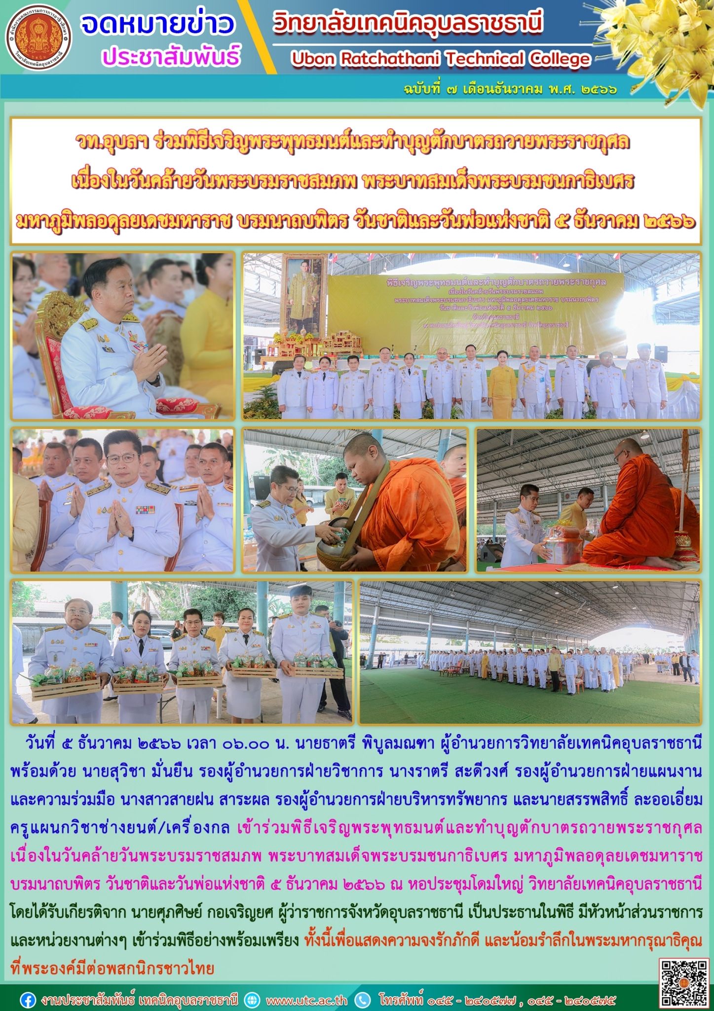 วันที่ ๕ ธันวาคม ๒๕๖๖ เวลา ๐๖.๐๐ น. นายธาตรี พิบูลมณฑา ผู้อำนวยการวิทยาลัยเทคนิคอุบลราชธานี พร้อมด้วย นายสุวิชา มั่นยืน รองผู้อำนวยการฝ่ายวิชาการ นางราตรี สะดีวงศ์ รองผู้อำนวยการฝ่ายแผนงานและความร่วมมือ นางสาวสายฝน สาระผล รองผู้อำนวยการฝ่ายบริหารทรัพยากร และนายสรรพสิทธิ์ ละออเอี่ยม ครูแผนกวิชาช่างยนต์/เครื่องกล เข้าร่วมพิธีเจริญพระพุทธมนต์และทำบุญตักบาตรถวายพระราชกุศล เนื่องในวันคล้ายวันพระบรมราชสมภพ พระบาทสมเด็จพระบรมชนกาธิเบศร มหาภูมิพลอดุลยเดชมหาราช บรมนาถบพิตร วันชาติและวันพ่อแห่งชาติ ๕ ธันวาคม ๒๕๖๖ ณ หอประชุมโดมใหญ่ วิทยาลัยเทคนิคอุบลราชธานี โดยได้รับเกียรติจาก นายศุภศิษย์ กอเจริญยศ ผู้ว่าราชการจังหวัดอุบลราชธานี เป็นประธานในพิธี มีหัวหน้าส่วนราชการ และหน่วยงานต่างๆ เข้าร่วมพิธีอย่างพร้อมเพรียง ทั้งนี้เพื่อแสดงความจงรักภักดี และน้อมรำลึกในพระมหากรุณาธิคุณที่พระองค์มีต่อพสกนิกรชาวไทย