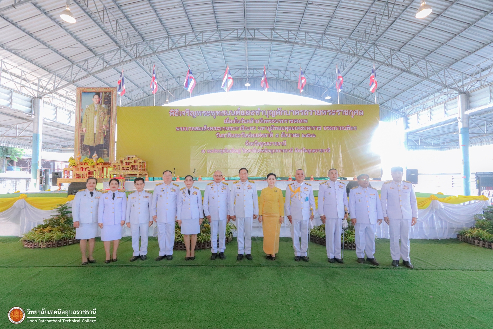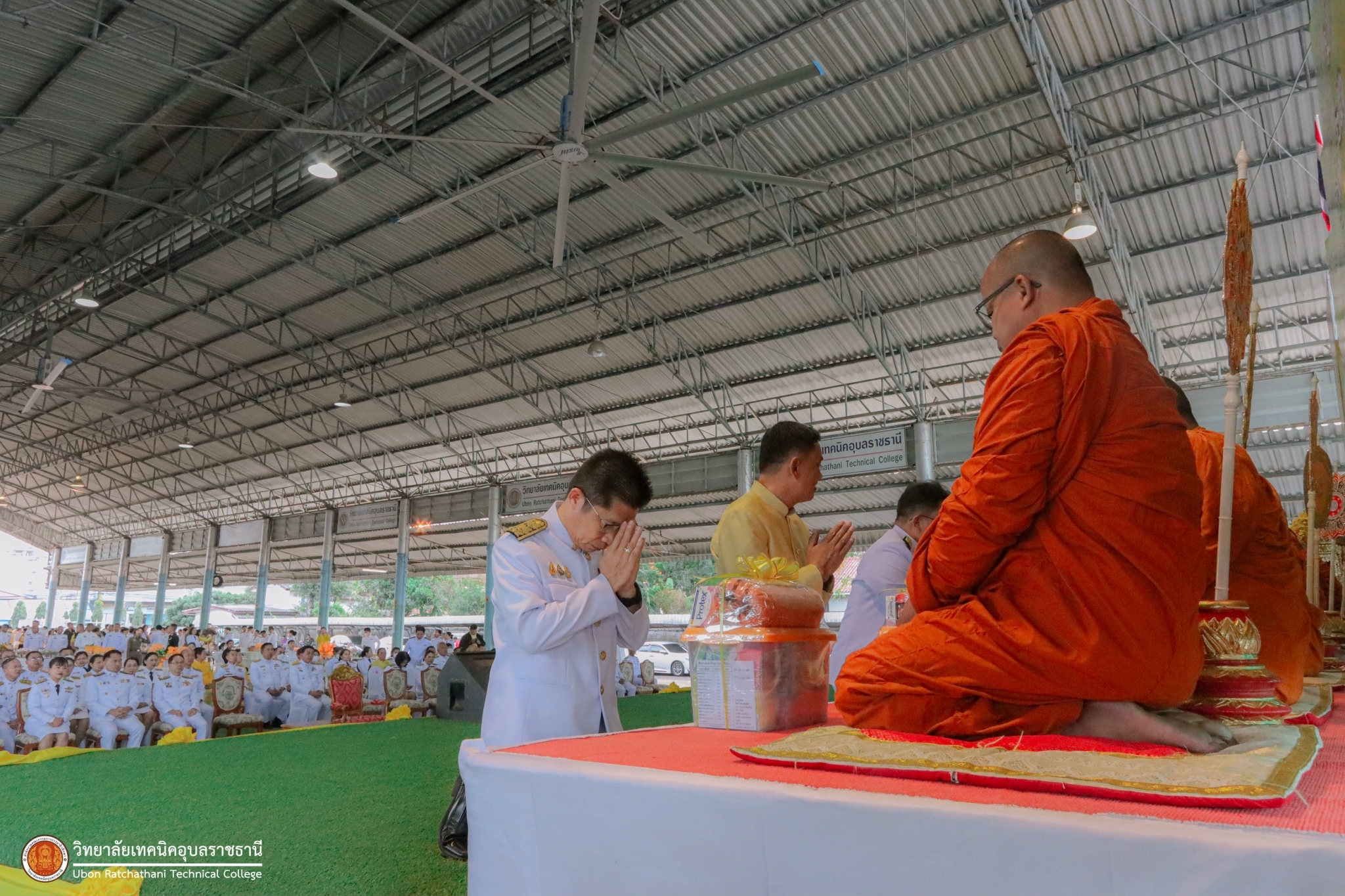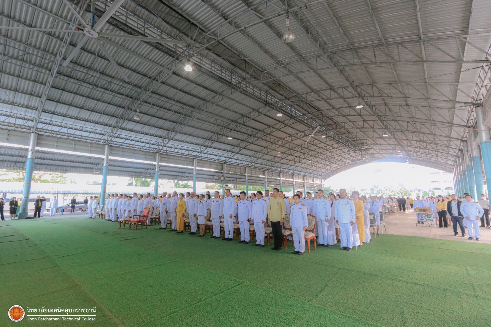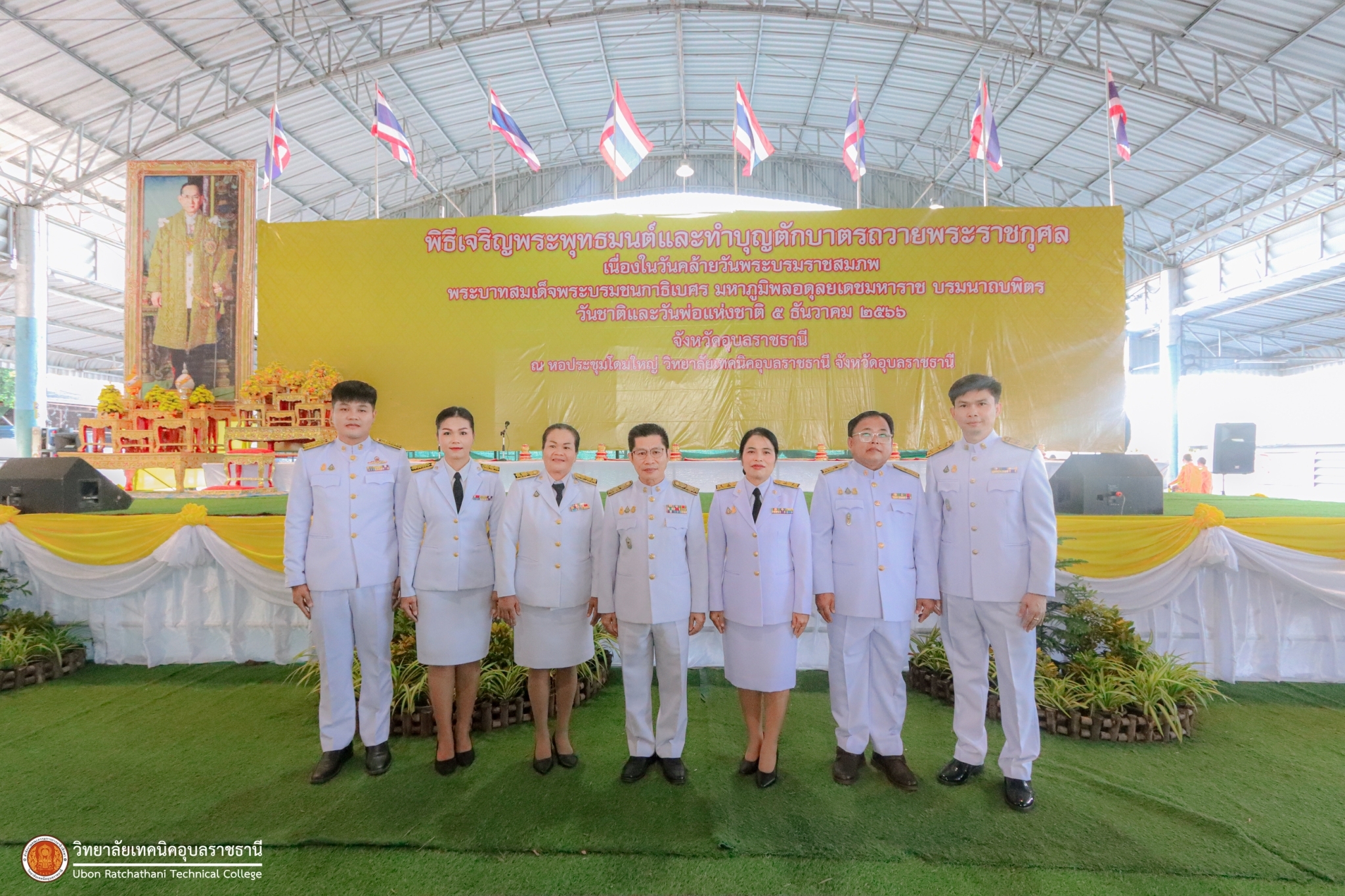 วันที่ ๕ ธันวาคม ๒๕๖๖ เวลา ๐๖.๐๐ น. นายธาตรี พิบูลมณฑา ผู้อำนวยการวิทยาลัยเทคนิคอุบลราชธานี พร้อมด้วย นายสุวิชา มั่นยืน รองผู้อำนวยการฝ่ายวิชาการ นางราตรี สะดีวงศ์ รองผู้อำนวยการฝ่ายแผนงานและความร่วมมือ นางสาวสายฝน สาระผล รองผู้อำนวยการฝ่ายบริหารทรัพยากร และนายสรรพสิทธิ์ ละออเอี่ยม ครูแผนกวิชาช่างยนต์/เครื่องกล เข้าร่วมพิธีเจริญพระพุทธมนต์และทำบุญตักบาตรถวายพระราชกุศล เนื่องในวันคล้ายวันพระบรมราชสมภพ พระบาทสมเด็จพระบรมชนกาธิเบศร มหาภูมิพลอดุลยเดชมหาราช บรมนาถบพิตร วันชาติและวันพ่อแห่งชาติ ๕ ธันวาคม ๒๕๖๖ ณ หอประชุมโดมใหญ่ วิทยาลัยเทคนิคอุบลราชธานี โดยได้รับเกียรติจาก นายศุภศิษย์ กอเจริญยศ ผู้ว่าราชการจังหวัดอุบลราชธานี เป็นประธานในพิธี มีหัวหน้าส่วนราชการ และหน่วยงานต่างๆ เข้าร่วมพิธีอย่างพร้อมเพรียง ทั้งนี้เพื่อแสดงความจงรักภักดี และน้อมรำลึกในพระมหากรุณาธิคุณที่พระองค์มีต่อพสกนิกรชาวไทย