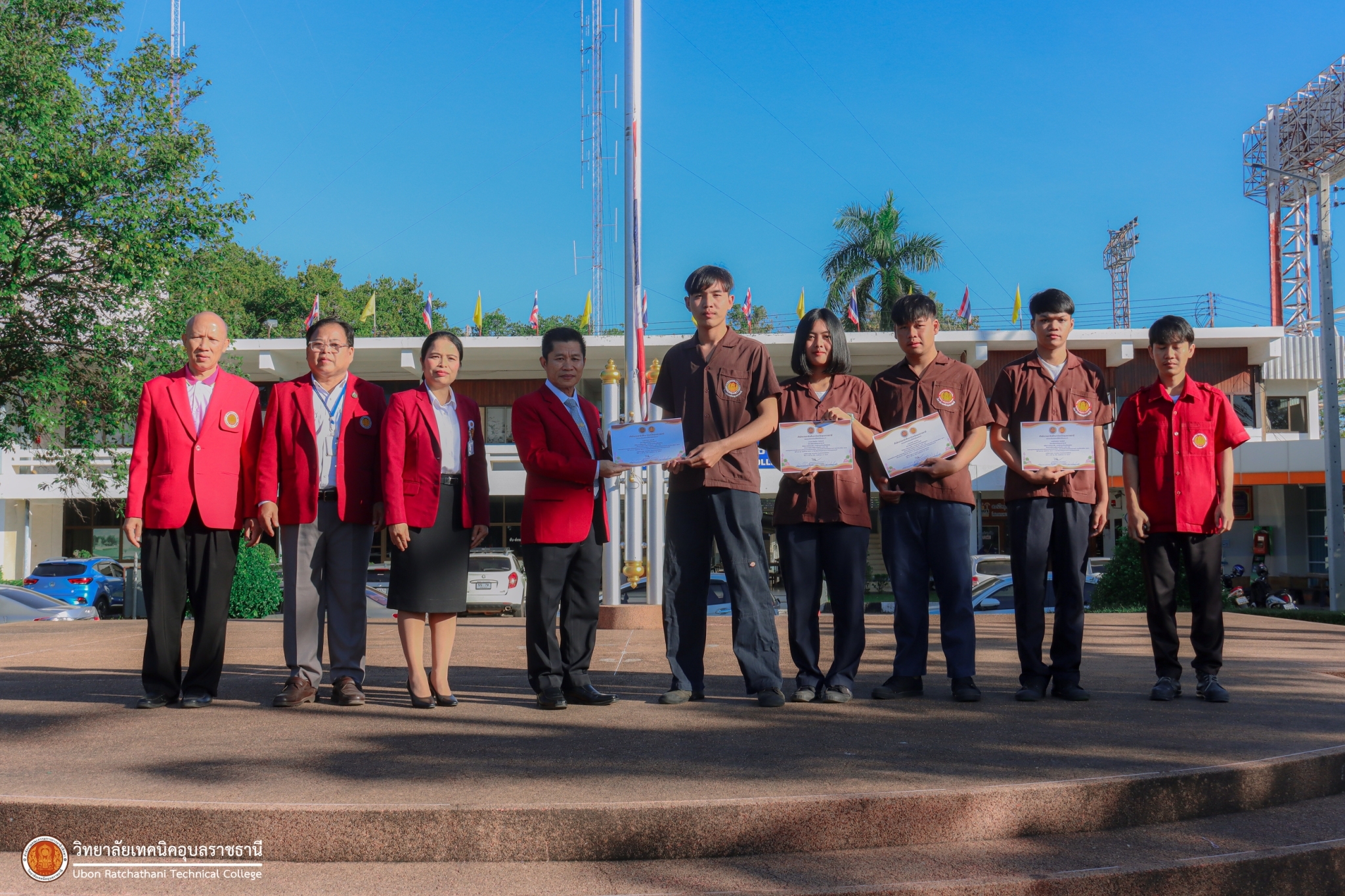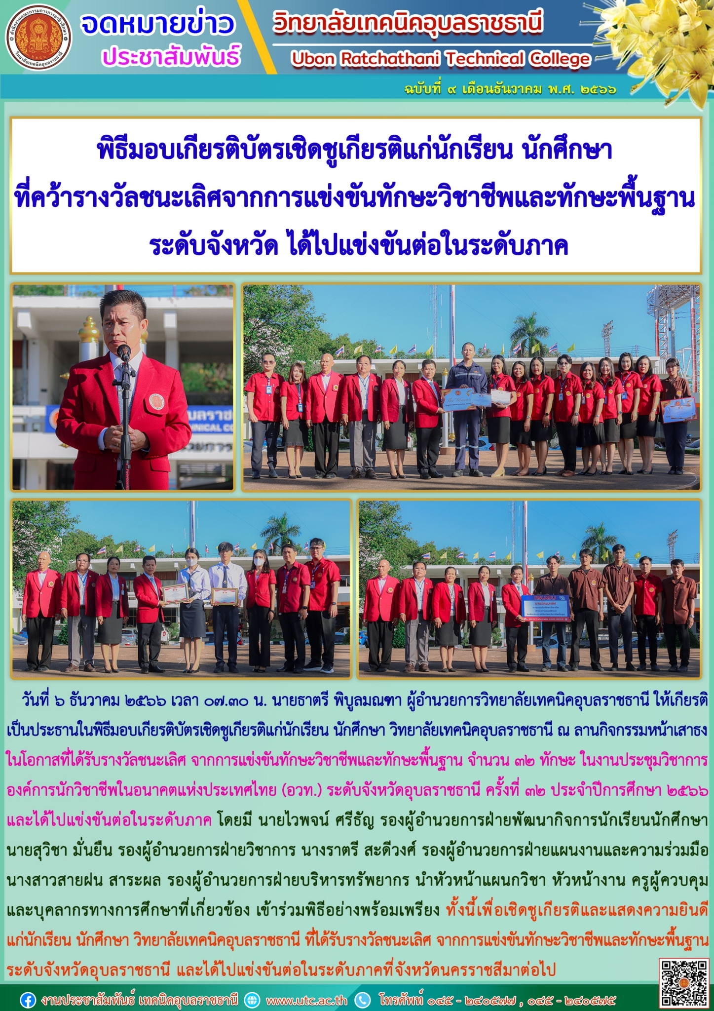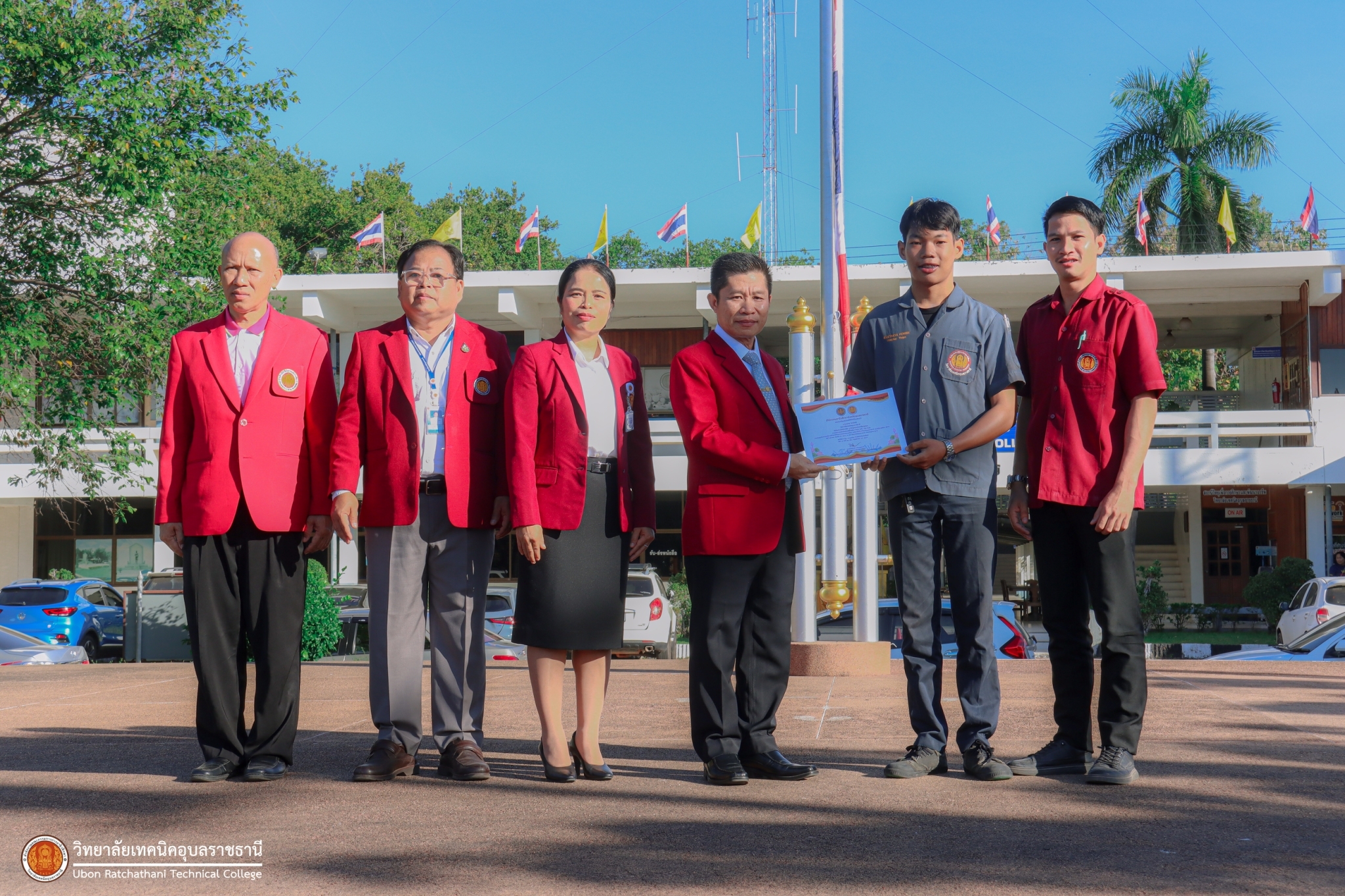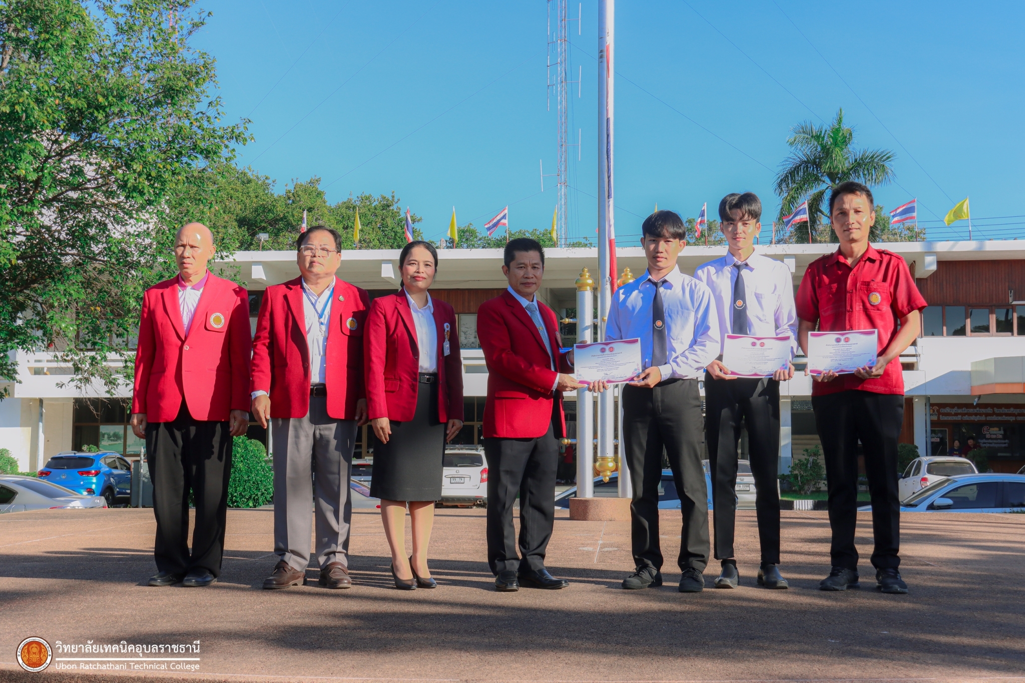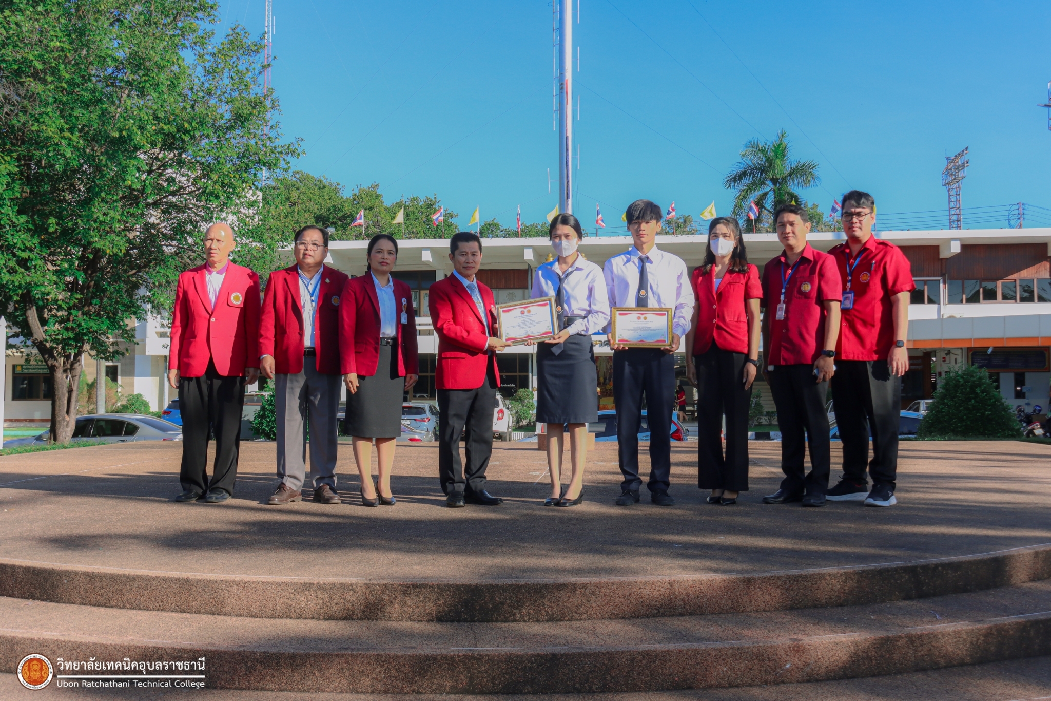 วันที่ ๖ ธันวาคม ๒๕๖๖ เวลา ๐๗.๓๐ น. นายธาตรี พิบูลมณฑา ผู้อำนวยการวิทยาลัยเทคนิคอุบลราชธานี ให้เกียรติเป็นประธานในพิธีมอบเกียรติบัตรเชิดชูเกียรติแก่นักเรียน นักศึกษา วิทยาลัยเทคนิคอุบลราชธานี ณ ลานกิจกรรมหน้าเสาธง ในโอกาสที่ได้รับรางวัลชนะเลิศ จากการแข่งขันทักษะวิชาชีพและทักษะพื้นฐาน จำนวน ๓๒ ทักษะ ในงานประชุมวิชาการองค์การนักวิชาชีพในอนาคตแห่งประเทศไทย (อวท.) ระดับจังหวัดอุบลราชธานี ครั้งที่ ๓๒ ประจำปีการศึกษา ๒๕๖๖ และได้ไปแข่งขันต่อในระดับภาค โดยมี นายไวพจน์ ศรีธัญ รองผู้อำนวยการฝ่ายพัฒนากิจการนักเรียนนักศึกษา นายสุวิชา มั่นยืน รองผู้อำนวยการฝ่ายวิชาการ นางราตรี สะดีวงศ์ รองผู้อำนวยการฝ่ายแผนงานและความร่วมมือ นางสาวสายฝน สาระผล รองผู้อำนวยการฝ่ายบริหารทรัพยากร นำหัวหน้าแผนกวิชา หัวหน้างาน ครูผู้ควบคุม และบุคลากรทางการศึกษาที่เกี่ยวข้อง เข้าร่วมพิธีอย่างพร้อมเพรียง ทั้งนี้เพื่อเชิดชูเกียรติและแสดงความยินดีแก่นักเรียน นักศึกษา วิทยาลัยเทคนิคอุบลราชธานี ที่ได้รับรางวัลชนะเลิศ จากการแข่งขันทักษะวิชาชีพและทักษะพื้นฐาน ระดับจังหวัดอุบลราชธานี และได้ไปแข่งขันต่อในระดับภาคที่จังหวัดนครราชสีมาต่อไป
