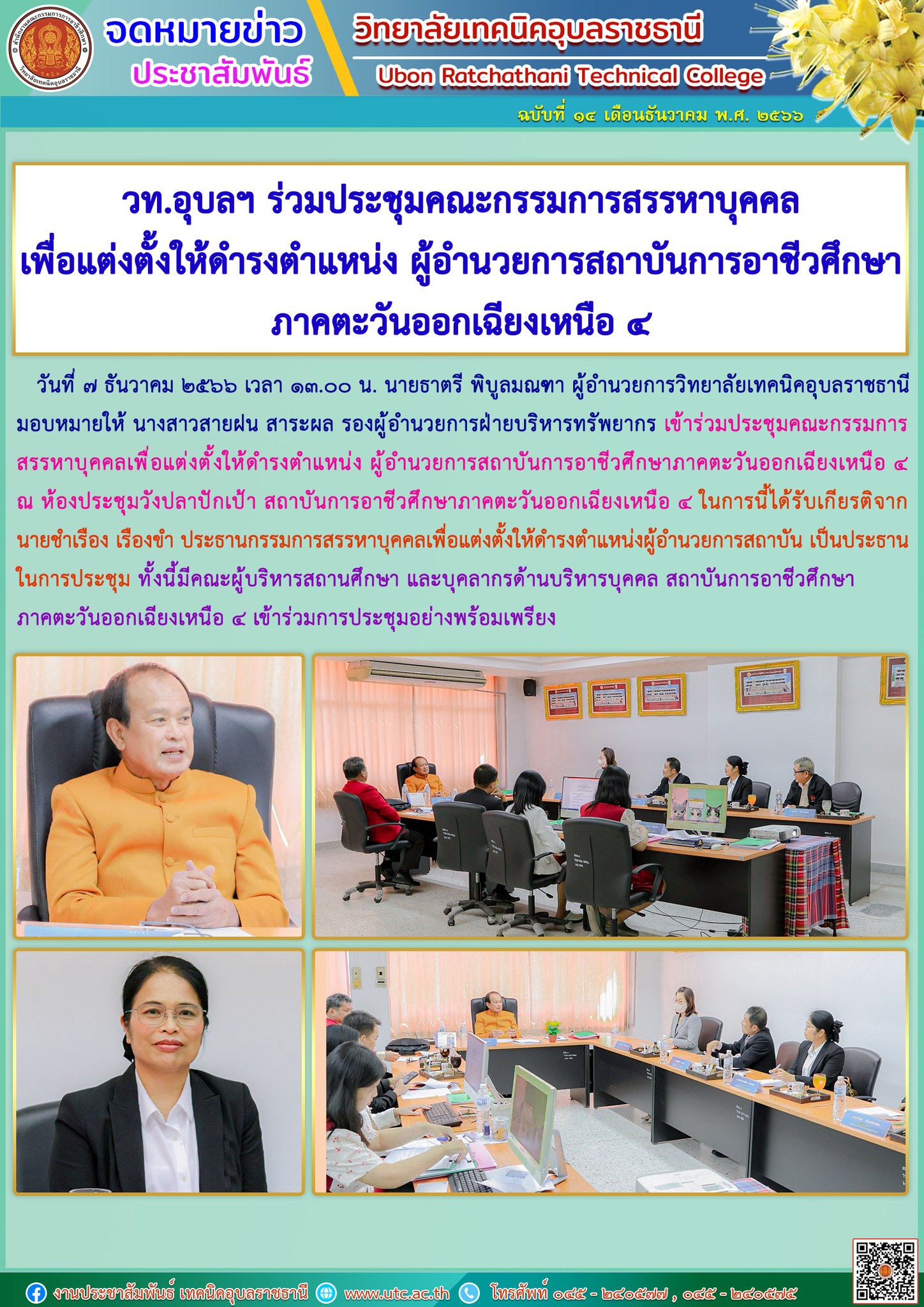 วันที่ ๗ ธันวาคม ๒๕๖๖ เวลา ๑๓.๐๐ น. นายธาตรี พิบูลมณฑา ผู้อำนวยการวิทยาลัยเทคนิคอุบลราชธานี มอบหมายให้ นางสาวสายฝน สาระผล รองผู้อำนวยการฝ่ายบริหารทรัพยากร เข้าร่วมประชุมคณะกรรมการสรรหาบุคคลเพื่อแต่งตั้งให้ดำรงตำแหน่ง ผู้อำนวยการสถาบันการอาชีวศึกษาภาคตะวันออกเฉียงเหนือ ๔ ณ ห้องประชุมวังปลาปักเป้า สถาบันการอาชีวศึกษาภาคตะวันออกเฉียงเหนือ ๔ ในการนี้ได้รับเกียรติจาก นายชำเรือง เรืองขำ ประธานกรรมการสรรหาบุคคลเพื่อแต่งตั้งให้ดำรงตำแหน่งผู้อำนวยการสถาบัน เป็นประธานในการประชุม โดยมี คณะผู้บริหารสถานศึกษา และบุคลากรด้านบริหารบุคคล สถาบันการอาชีวศึกษา ภาคตะวันออกเฉียงเหนือ ๔ เข้าร่วมการประชุมอย่างพร้อมเพรียง