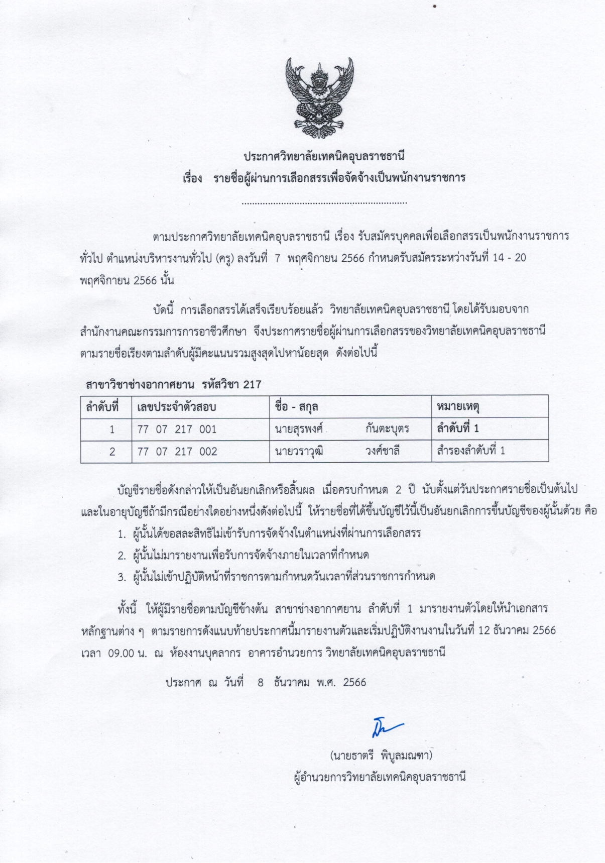บัดนี้ การเลือกสรรได้เสร็จเรียบร้อยแล้ว วิทยาลัยเทคนิคอุบลราชธานี โดยได้รับมอบจากสำนักงานคณะกรรมการการอาชีวศึกษา จึงประกาศรายชื่อผู้ผ่านการเลือกสรรของวิทยาลัยเทคนิคอุบลราชธานี ตามรายชื่อเรียงตามลำดับผู้มีคะแนนรวมสูงสุดไปหาน้อยสุด ดังต่อไปนี้