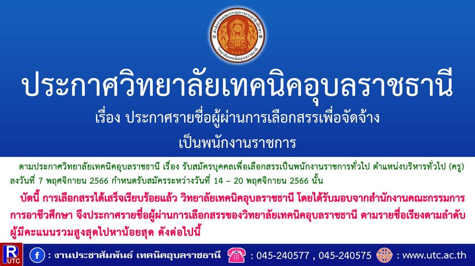 ตามประกาศวิทยาลัยเทคนิคอุบลราชธานี เรื่อง รับสมัครบุคคลเพื่อเลือกสรรเป็นพนักงานราชการทั่วไป ตำแหน่งบริหารทั่วไป (ครู) ลงวันที่ 7 พฤศจิกายน 2566 กำหนดรับสมัครระหว่างวันที่ 14 – 20 พฤศจิกายน 2566 นั้น