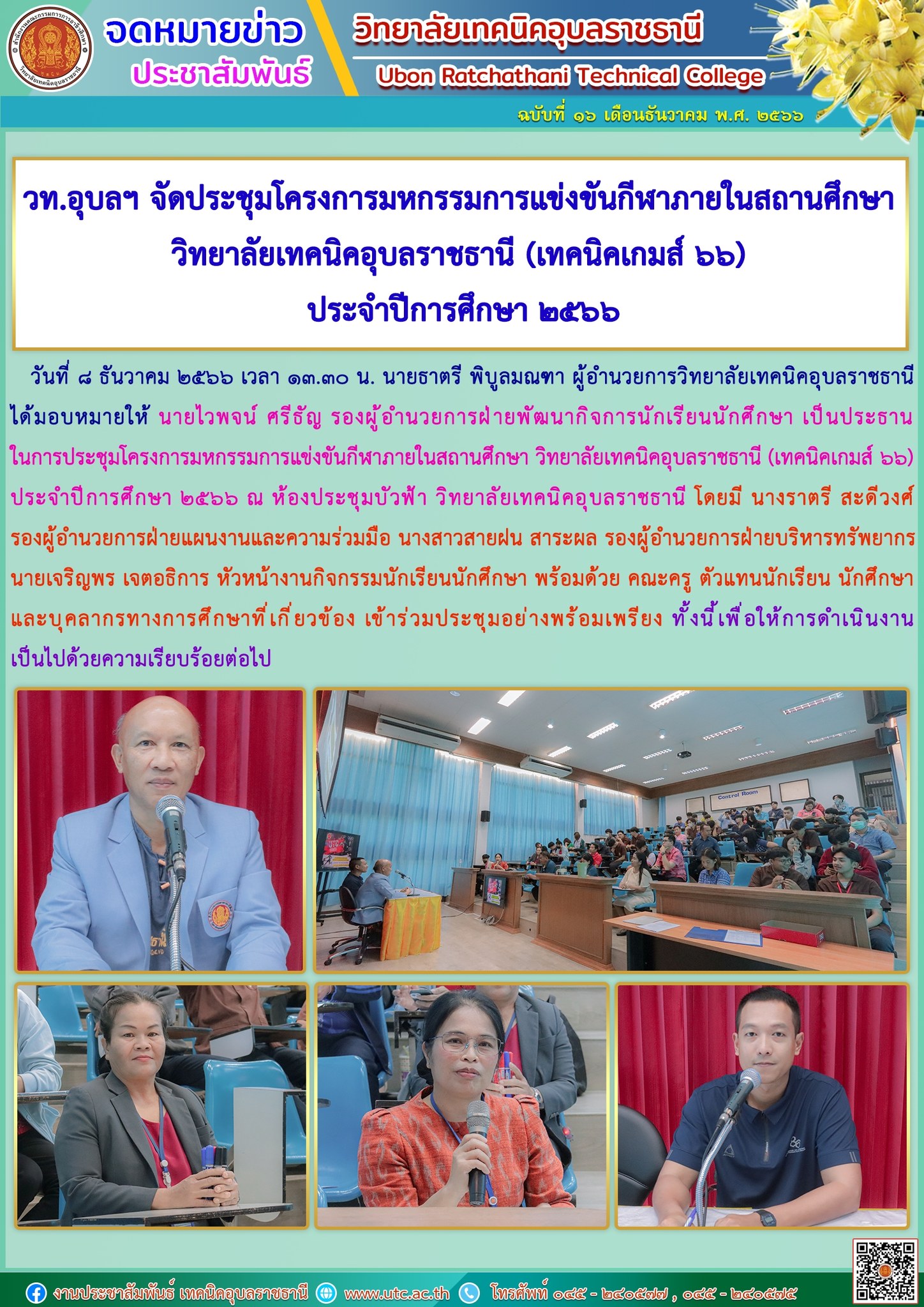 วันที่ ๘ ธันวาคม ๒๕๖๖ เวลา ๑๓.๓๐ น. นายธาตรี พิบูลมณฑา ผู้อำนวยการวิทยาลัยเทคนิคอุบลราชธานี ได้มอบหมายให้ นายไวพจน์ ศรีธัญ รองผู้อำนวยการฝ่ายพัฒนากิจการนักเรียนนักศึกษา เป็นประธานในการประชุมโครงการมหกรรมการแข่งขันกีฬาภายในสถานศึกษา วิทยาลัยเทคนิคอุบลราชธานี (เทคนิคเกมส์ ๖๖) ประจำปีการศึกษา ๒๕๖๖ ณ ห้องประชุมบัวฟ้า วิทยาลัยเทคนิคอุบลราชธานี โดยมี นางราตรี สะดีวงศ์ รองผู้อำนวยการฝ่ายแผนงานและความร่วมมือ นางสาวสายฝน สาระผล รองผู้อำนวยการฝ่ายบริหารทรัพยากร นายเจริญพร เจตอธิการ หัวหน้างานกิจกรรมนักเรียนนักศึกษา พร้อมด้วย คณะครู ตัวแทนนักเรียน นักศึกษา และบุคลากรทางการศึกษาที่เกี่ยวข้อง เข้าร่วมประชุมอย่างพร้อมเพรียง ทั้งนี้เพื่อให้การดำเนินงานเป็นไปด้วยความเรียบร้อยต่อไป
