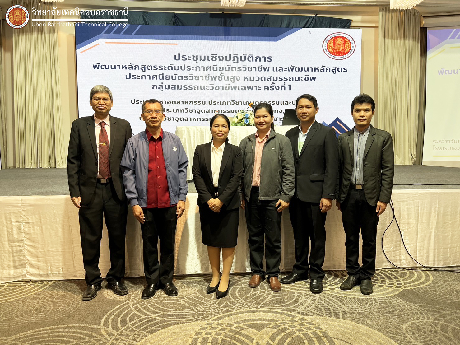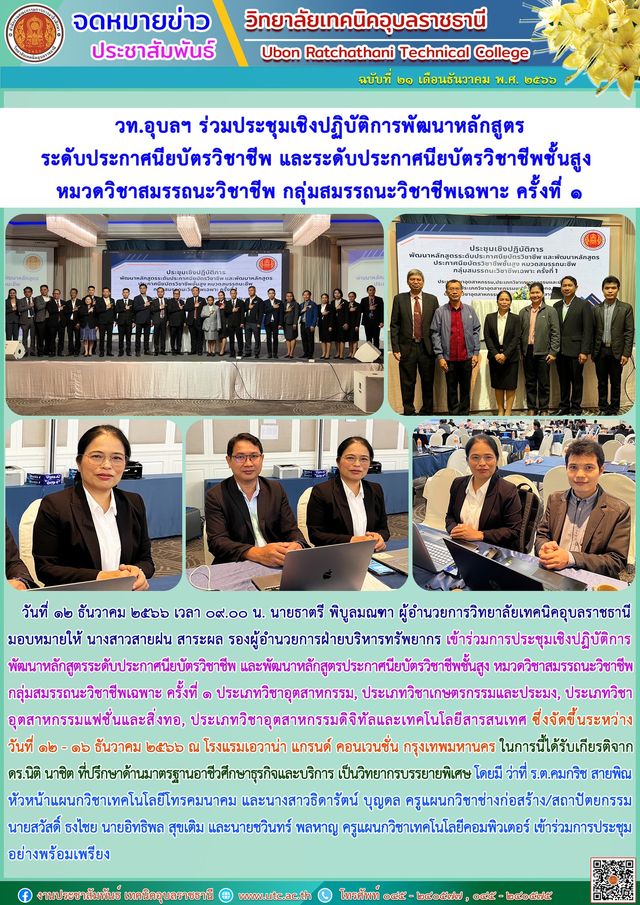 วันที่ ๑๒ ธันวาคม ๒๕๖๖ เวลา ๐๙.๐๐ น. นายธาตรี พิบูลมณฑา ผู้อำนวยการวิทยาลัยเทคนิคอุบลราชธานี มอบหมายให้ นางสาวสายฝน สาระผล รองผู้อำนวยการฝ่ายบริหารทรัพยากร เข้าร่วมการประชุมเชิงปฏิบัติการพัฒนาหลักสูตรระดับประกาศนียบัตรวิชาชีพ และพัฒนาหลักสูตรประกาศนียบัตรวิชาชีพชั้นสูง หมวดวิชาสมรรถนะวิชาชีพ กลุ่มสมรรถนะวิชาชีพเฉพาะ ครั้งที่ ๑ ประเภทวิชาอุตสาหกรรม, ประเภทวิชาเกษตรกรรมและประมง, ประเภทวิชาอุตสาหกรรมแฟชั่นและสิ่งทอ, ประเภทวิชาอุตสาหกรรมดิจิทัลและเทคโนโลยีสารสนเทศ ซึ่งจัดขึ้นระหว่างวันที่ ๑๒ – ๑๖ ธันวาคม ๒๕๖๖ ณ โรงแรมเอวาน่า แกรนด์ คอนเวนชั่น กรุงเทพมหานคร ในการนี้ได้รับเกียรติจาก ดร.นิติ นาชิต ที่ปรึกษาด้านมาตรฐานอาชีวศึกษาธุรกิจและบริการ เป็นวิทยากรบรรยายพิเศษ โดยมี ว่าที่ ร.ต.คมกริช สายพิณ หัวหน้าแผนกวิชาเทคโนโลยีโทรคมนาคม และนางสาวธิดารัตน์ บุญดล ครูแผนกวิชาช่างก่อสร้าง/สถาปัตยกรรม นายสวัสดิ์ ธงไชย นายอิทธิพล สุขเติม และนายชวินทร์ พลหาญ ครูแผนกวิชาเทคโนโลยีคอมพิวเตอร์ เข้าร่วมการประชุมอย่างพร้อมเพรียง