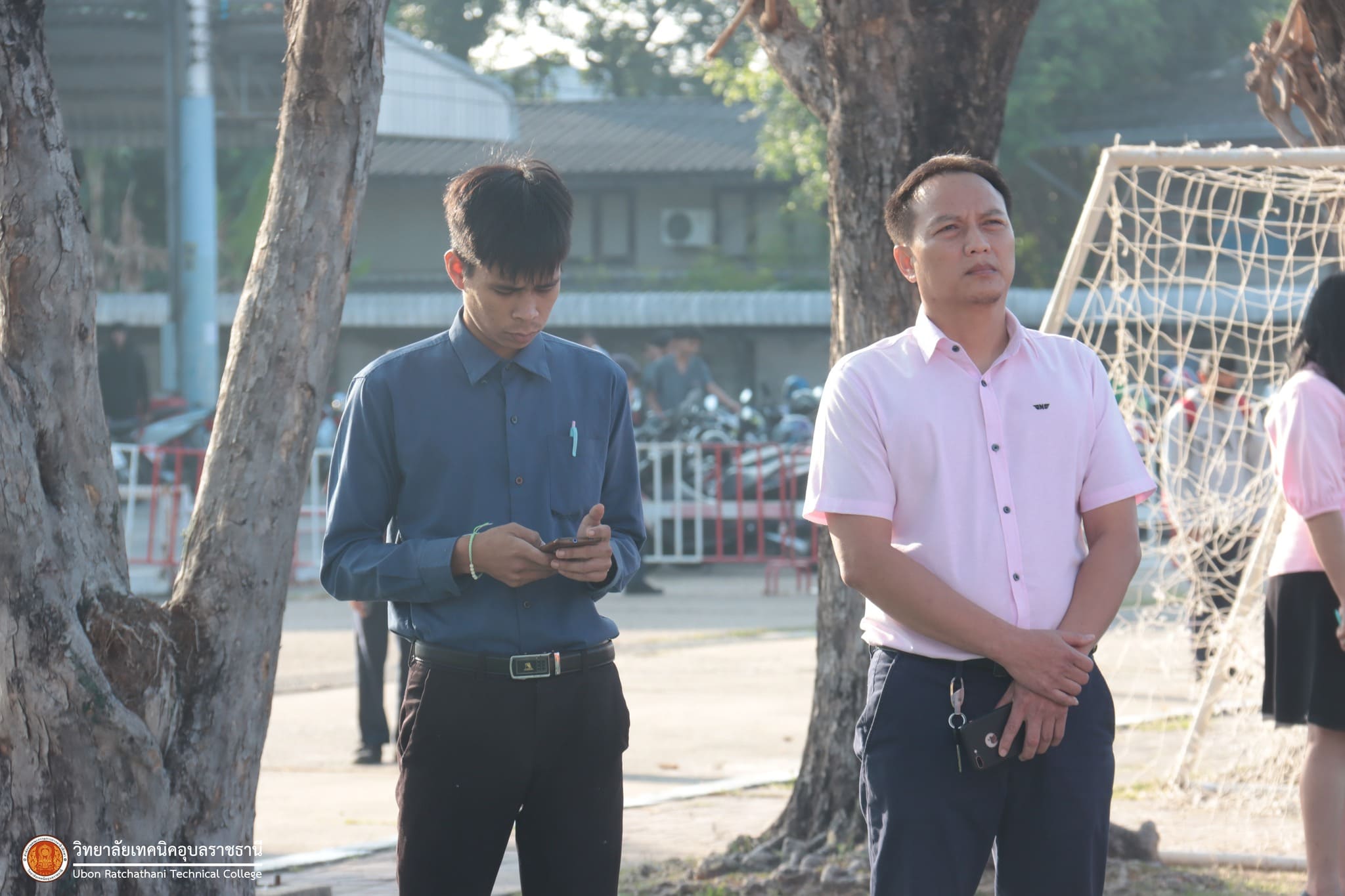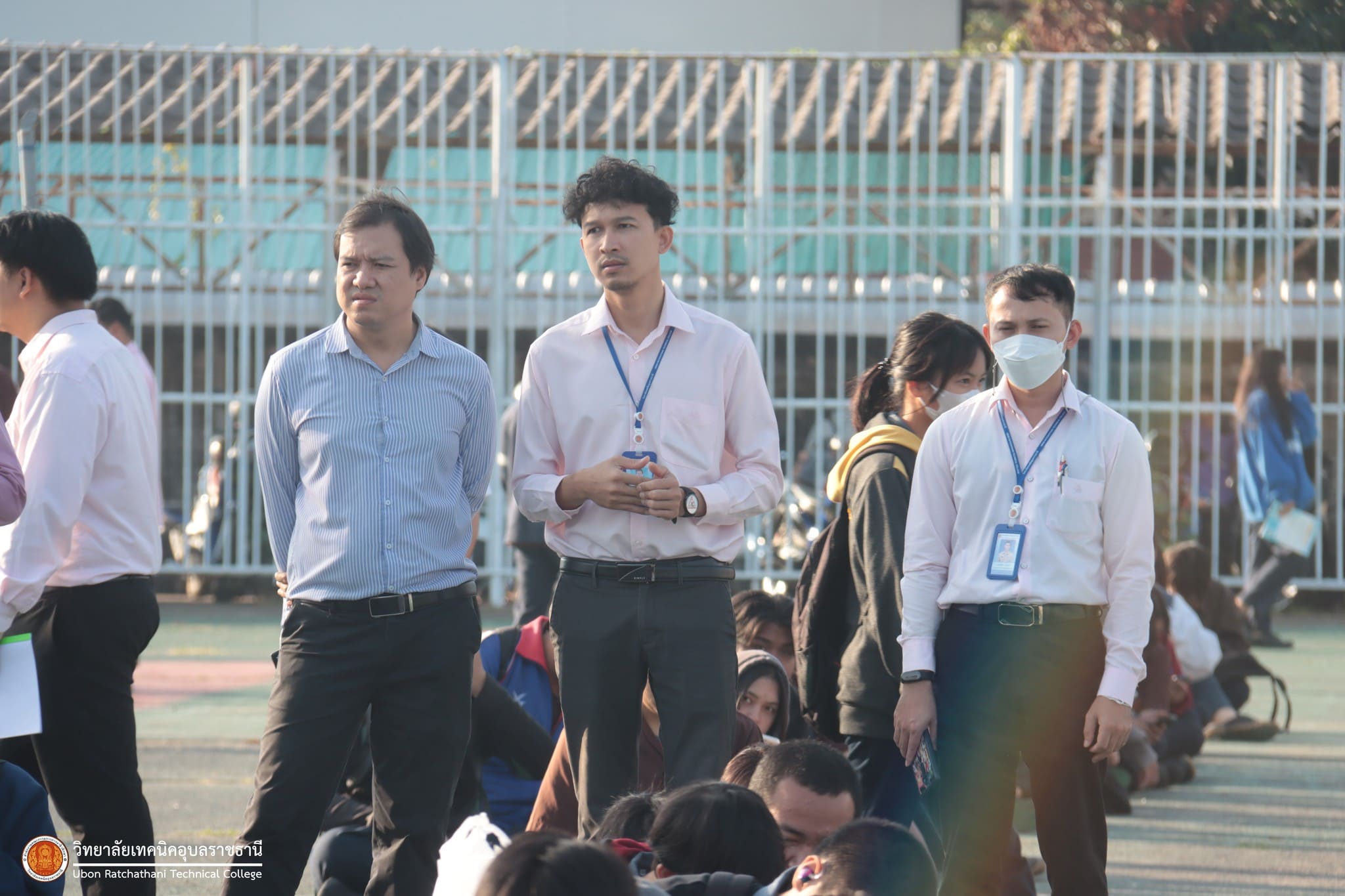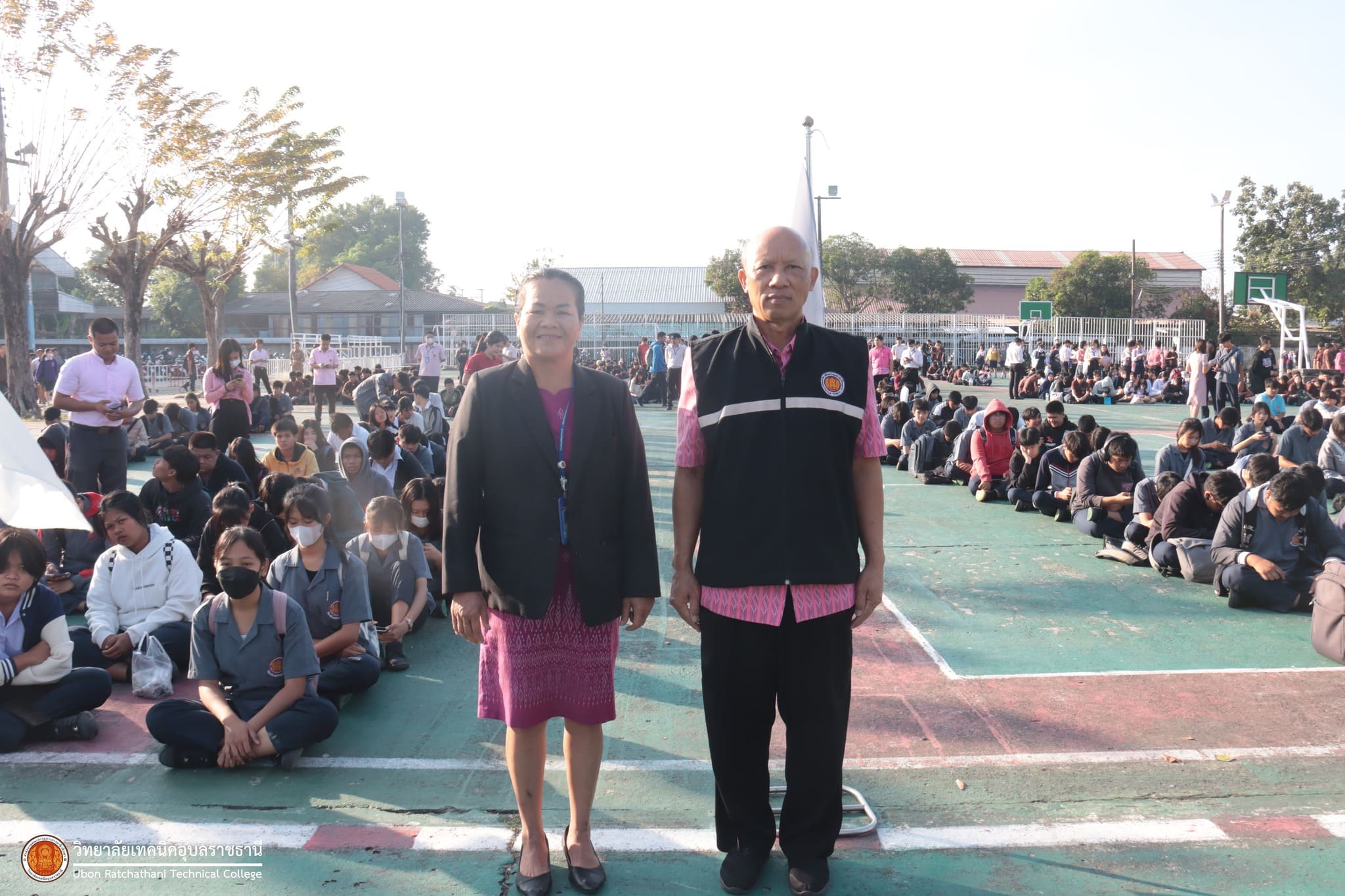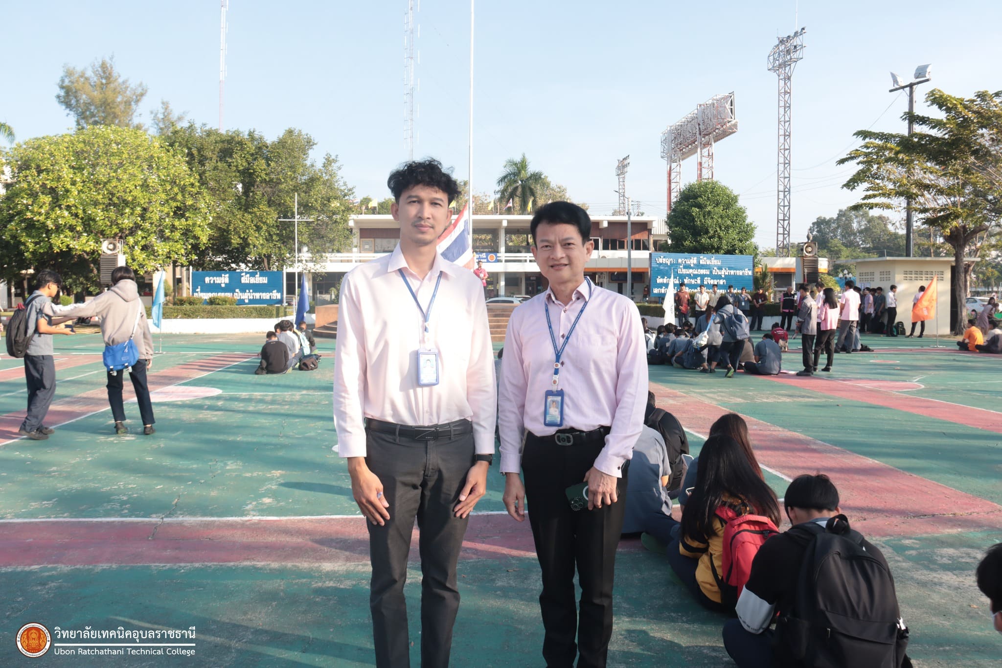 วันที่ ๑๒ ธันวาคม ๒๕๖๖ เวลา ๐๗.๓๐ น. นายธาตรี พิบูลมณฑา ผู้อำนวยการวิทยาลัยเทคนิคอุบลราชธานี มอบหมายให้ว่าที่ ร.ต.ขวัญชัย เนืองเนตร ครูแผนกวิชาช่างเชื่อมโลหะ อบรมคุณธรรม จริยธรรม และให้ความรู้แก่นักเรียน นักศึกษา ณ ลานกิจกรรมหน้าเสาธง นอกจากนี้ได้กล่าวแนะนำ นางสาวชุติกาญจน์ สุขเกษม ตำแหน่งครูผู้ช่วย ในโอกาสที่มารายงานตัวเพื่อเข้ารับการบรรจุและแต่งตั้งเข้ารับราชการเป็นข้าราชการครูและบุคลากรทางการศึกษา ตำแหน่งครูผู้ช่วย แผนกวิชาช่างกลโรงงาน โดยโครงการผลิตครูเพื่อพัฒนาท้องถิ่น ปี พ.ศ. ๒๕๖๖ (รอบที่ ๑) โดยมี นายไวพจน์ ศรีธัญ รองผู้อำนวยการฝ่ายพัฒนากิจการนักเรียนนักศึกษา นายสุวิชา มั่นยืน รองผู้อำนวยการฝ่ายวิชาการ นางราตรี สะดีวงศ์ รองผู้อำนวยการฝ่ายแผนงานและความร่วมมือ พร้อมด้วยหัวหน้าแผนกวิชา หัวหน้างาน ครู นำนักเรียน นักศึกษา เข้าร่วมกิจกรรมเข้าแถวเคารพธงชาติอย่างพร้อมเพรียง