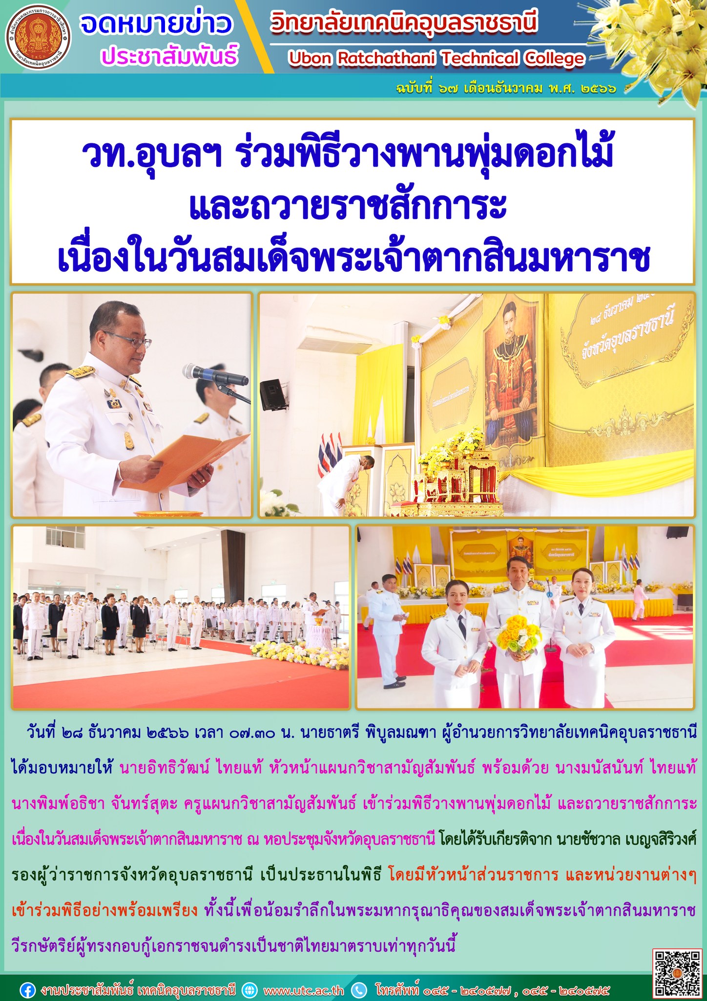 วันที่ ๒๘ ธันวาคม ๒๕๖๖ เวลา ๐๗.๓๐ น. นายธาตรี พิบูลมณฑา ผู้อำนวยการวิทยาลัยเทคนิคอุบลราชธานี ได้มอบหมายให้ นายอิทธิวัฒน ไทยแท้ หัวหน้าแผนกวิชาสามัญสัมพันธ์ พร้อมด้วย นางมนัสนันท์ ไทยแท้ นางพิมพ์อธิชา จันทร์สุตะ ครูแผนกวิชาสามัญสัมพันธ์ เข้าร่วมพิธีวางพานพุ่มดอกไม้ และถวายราชสักการะ เนื่องในวันสมเด็จพระเจ้าตากสินมหาราช ณ หอประชุมจังหวัดอุบลราชธานี โดยได้รับเกียรติจาก นายชัชวาล เบญจสิริวงศ์ รองผู้ว่าราชการจังหวัดอุบลราชธานี เป็นประธานในพิธี โดยมีหัวหน้าส่วนราชการ และหน่วยงานต่างๆ เข้าร่วมพิธีอย่างพร้อมเพรียง ทั้งนี้เพื่อน้อมรำลึกในพระมหากรุณาธิคุณของสมเด็จพระเจ้าตากสินมหาราช วีรกษัตริย์ผู้ทรงกอบกู้เอกราชจนดำรงเป็นชาติไทยมาตราบเท่าทุกวันนี้#เรียนดีมีความสุข