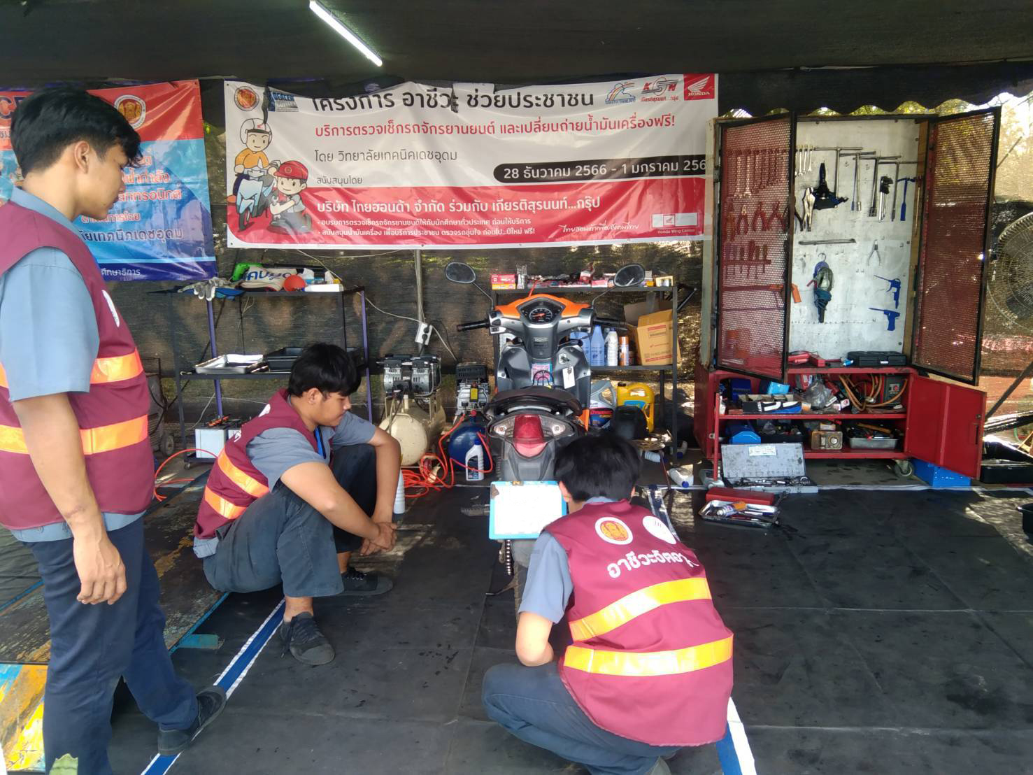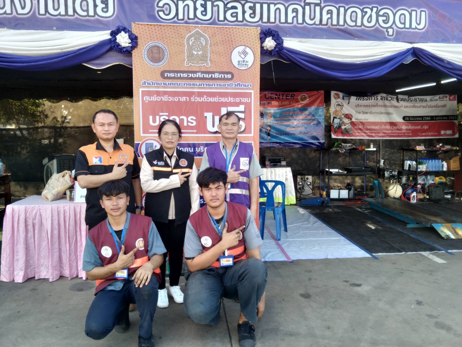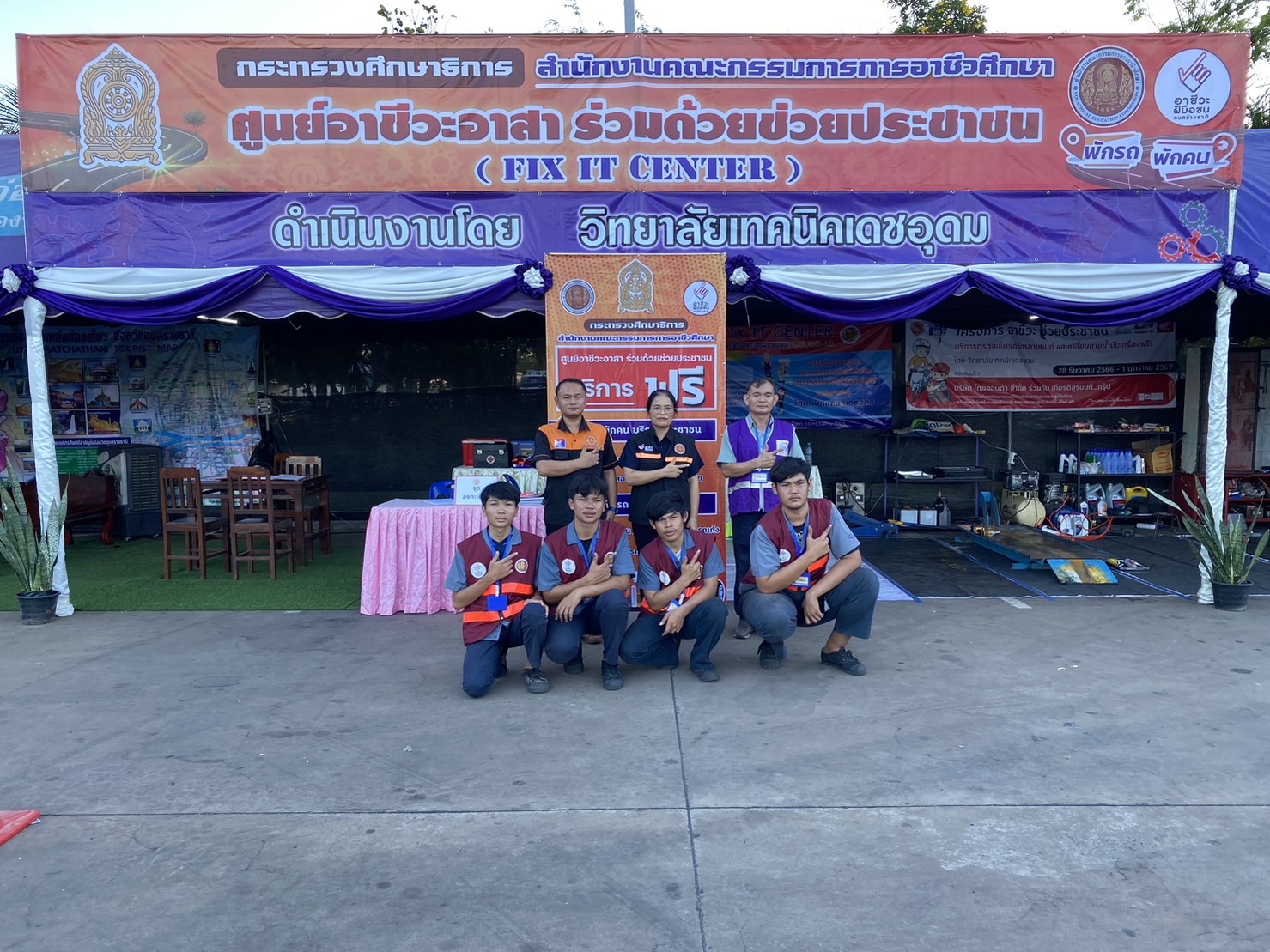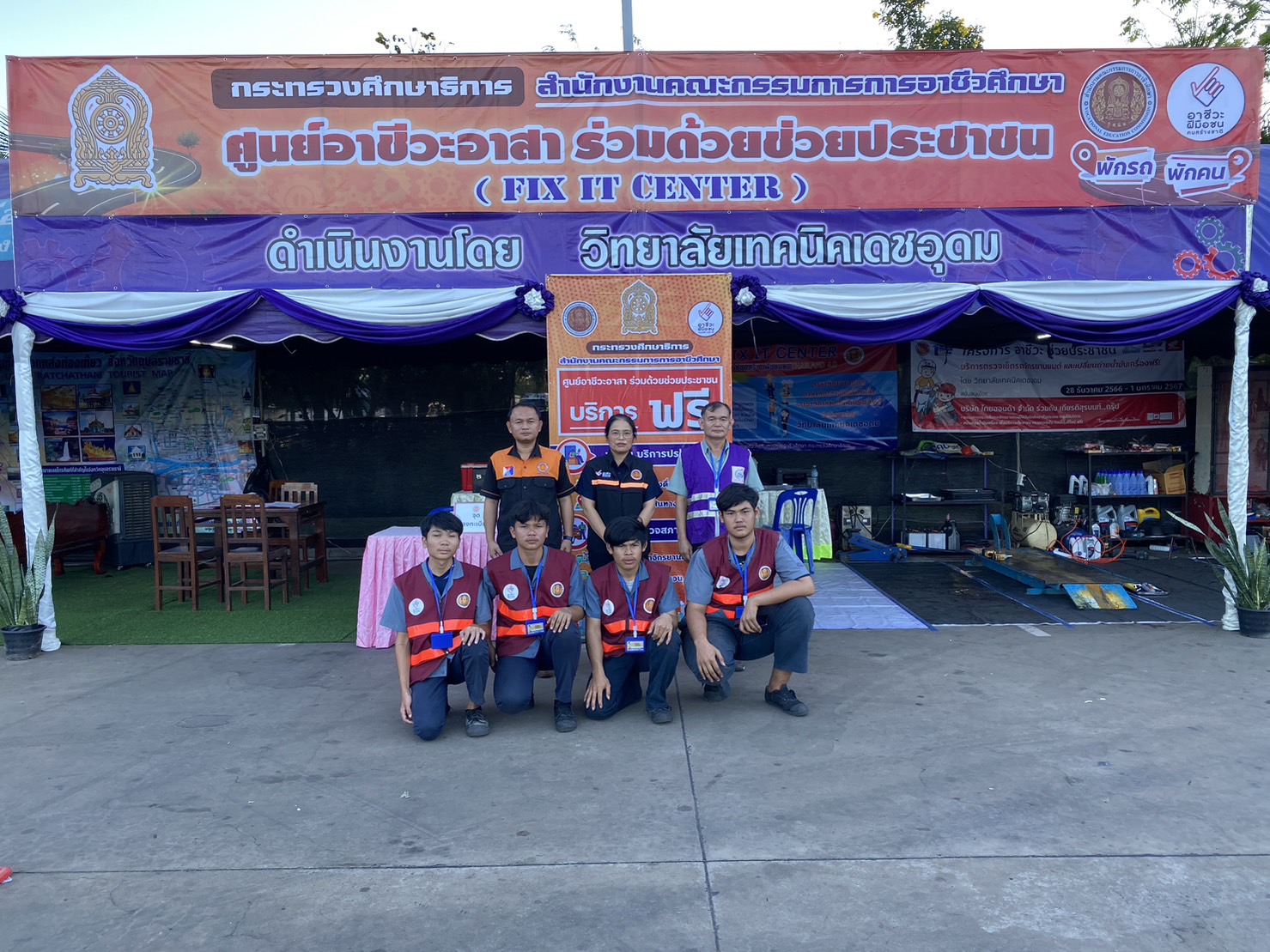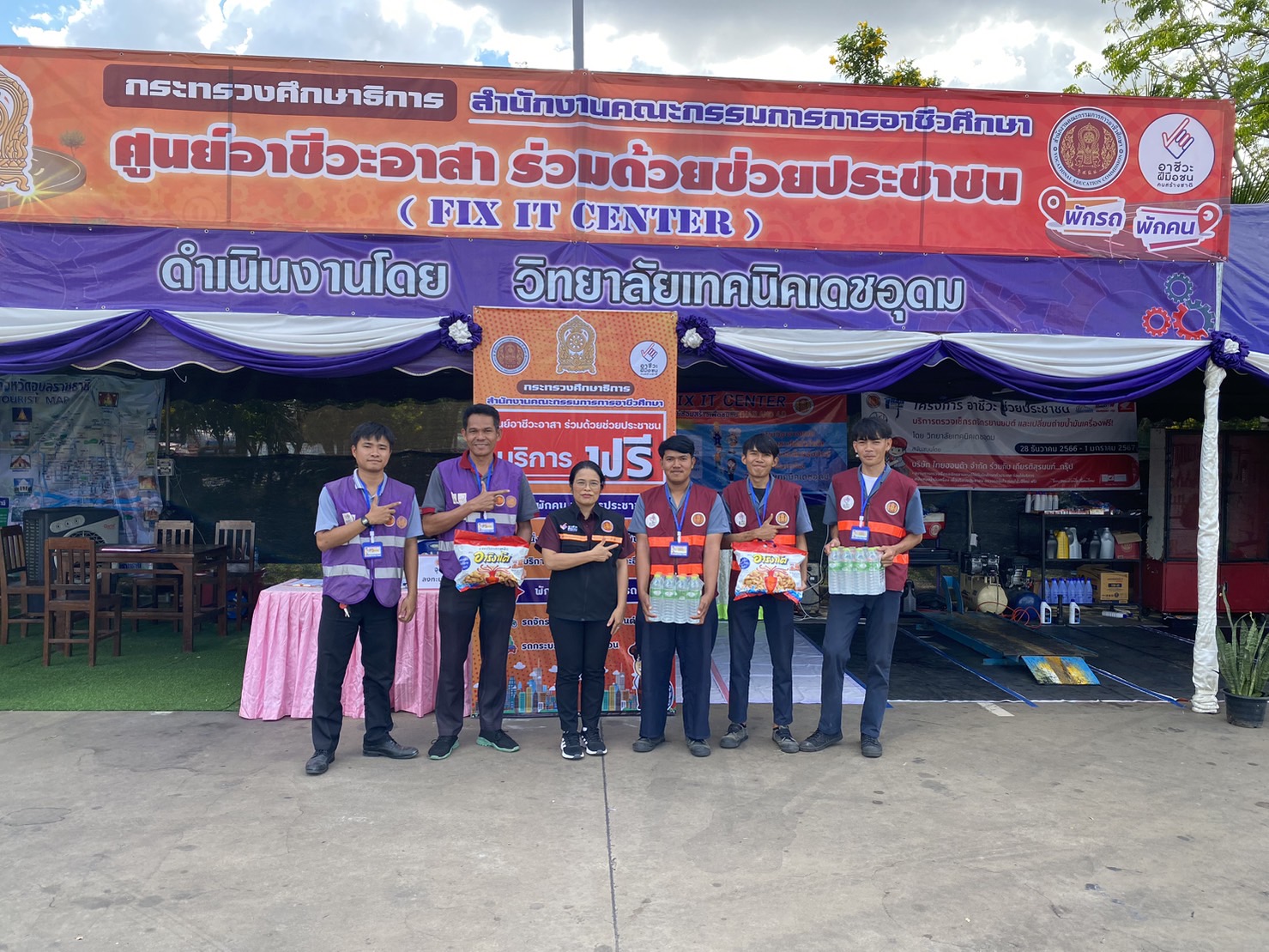 วันที่ ๒๙ ธันวาคม ๒๕๖๖ เวลา ๑๕.๐๐ น. นายธาตรี พิบูลมณฑา ผู้อำนวยการวิทยาลัยเทคนิคอุบลราชธานี ปฏิบัติหน้าที่ ผู้อำนวยการสำนักงานอาชีวศึกษาจังหวัดอุบลราชธานี มอบหมายให้ นางสาวสายฝน สาระผล รองผู้อำนวยการฝ่ายบริหารทรัพยากร เข้าตรวจเยี่ยมศูนย์อาชีวะจิตอาสา ร่วมด้วยช่วยประชาชน (Fix it center) ณ สถานีบริการน้ำมัน บริษัทพรณัฐพงษ์นวพล ปิโตเลียม จำกัด ถนนสถลมาร์ค ตำบลเมืองเดช อำเภอเดชอุดม จังหวัดอุบลราชธานี โดยมีคณะครู และนักเรียน นักศึกษา จิตอาสา วิทยาลัยเทคนิคเดชอุดม เข้ารับการตรวจเยี่ยมอย่างพร้อมเพรียง ทั้งนี้เพื่อให้บริการตรวจสภาพรถยนต์ รถจักรยานยนต์ แก่