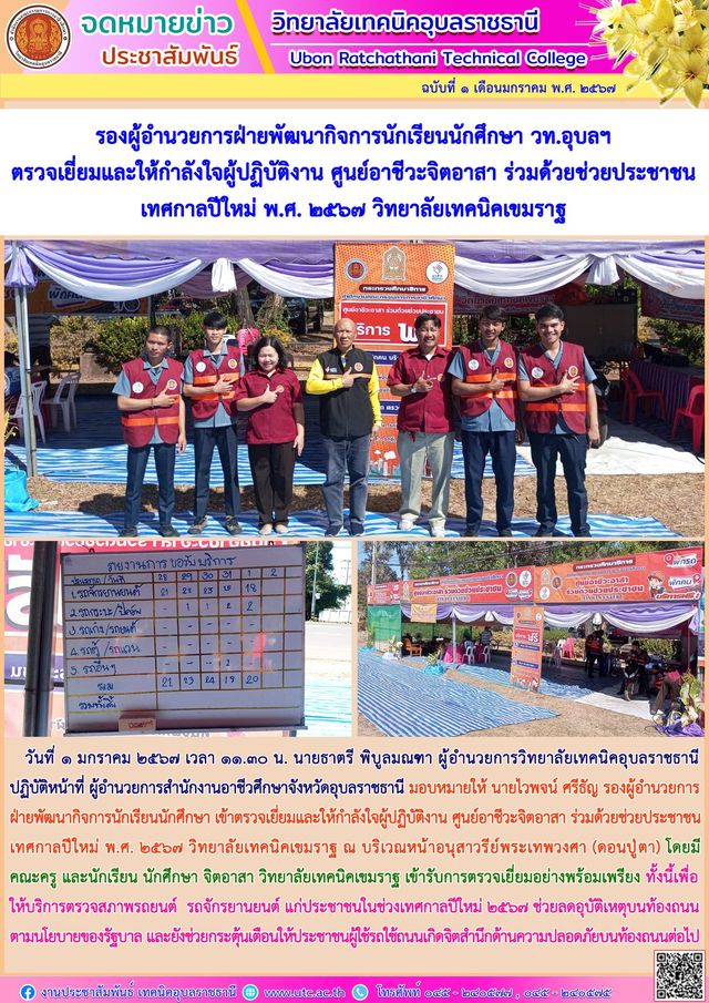 วันที่ ๑ มกราคม ๒๕๖๗ เวลา ๑๑.๓๐ น. นายธาตรี พิบูลมณฑา ผู้อำนวยการวิทยาลัยเทคนิคอุบลราชธานี ปฏิบัติหน้าที่ ผู้อำนวยการสำนักงานอาชีวศึกษาจังหวัดอุบลราชธานี มอบหมายให้ นายไวพจน์ ศรีธัญ รองผู้อำนวยการฝ่ายพัฒนากิจการนักเรียนนักศึกษา เข้าตรวจเยี่ยมและให้กำลังใจผู้ปฏิบัติงาน ศูนย์อาชีวะจิตอาสา ร่วมด้วยช่วยประชาชนเทศกาลปีใหม่ พ.ศ. ๒๕๖๗ วิทยาลัยเทคนิคเขมราฐ ณ บริเวณหน้าอนุสาวรีย์พระเทพวงศา (ดอนปู่ตา) โดยมีคณะครู และนักเรียน นักศึกษา จิตอาสา วิทยาลัยเทคนิคเขมราฐ เข้ารับการตรวจเยี่ยมอย่างพร้อมเพรียง ทั้งนี้เพื่อให้บริการตรวจสภาพรถยนต์ รถจักรยานยนต์ แก่ประชาชนในช่วงเทศกาลปีใหม่ ๒๕๖๗ ช่วยลดอุบัติเหตุบนท้องถนนตามนโยบายของรัฐบาล และยังช่วยกระตุ้นเตือนให้ประชาชนผู้ใช้รถใช้ถนนเกิดจิตสำนึกด้านความปลอดภัยบนท้องถนนต่อไป