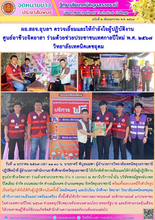 วันที่ ๑ มกราคม ๒๕๖๗ เวลา ๑๑.๓๐ น. นายธาตรี พิบูลมณฑา ผู้อำนวยการวิทยาลัยเทคนิคอุบลราชธานี ปฏิบัติหน้าที่ ผู้อำนวยการสำนักงานอาชีวศึกษาจังหวัดอุบลราชธานี ให้เกียรติเข้าตรวจเยี่ยมและให้กำลังใจผู้ปฏิบัติงาน ศูนย์อาชีวะจิตอาสา ร่วมด้วยช่วยประชาชน (Fix it center) ณ สถานีบริการน้ำมัน บริษัทพรณัฐพงษ์นวพล ปิโตเลียม จำกัด ถนนสถลมาร์ค ตำบลเมืองเดช อำเภอเดชอุดม จังหวัดอุบลราชธานี พร้อมทั้งมอบบะหมี่กึ่งสําเร็จรูป เป็นขวัญกำลังใจให้กับผู้ปฏิบัติงานในครั้งนี้ โดยมีคณะครู และนักเรียน นักศึกษา จิตอาสา วิทยาลัยเทคนิคเดชอุดม เข้ารับการตรวจเยี่ยมอย่างพร้อมเพรียง ทั้งนี้เพื่อให้บริการตรวจสภาพรถยนต์ รถจักรยานยนต์ แก่ประชาชนในช่วงเทศกาลปีใหม่ ๒๕๖๗ ช่วยลดอุบัติเหตุบนท้องถนนตามนโยบายของรัฐบาล และยังช่วยกระตุ้นเตือนให้ประชาชนผู้ใช้รถใช้ถนนเกิดจิตสำนึกด้านความปลอดภัยบนท้องถนนต่อไป
