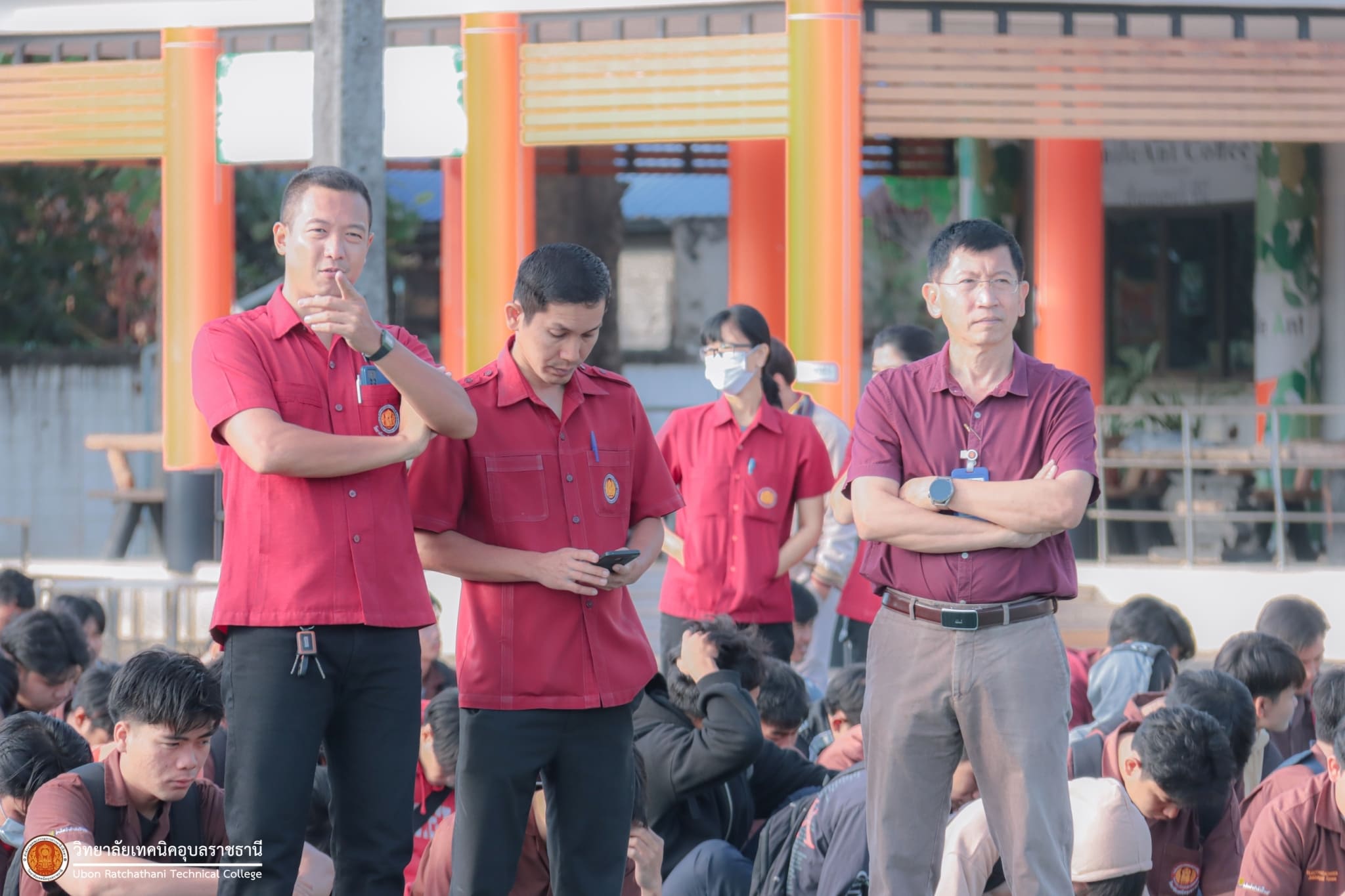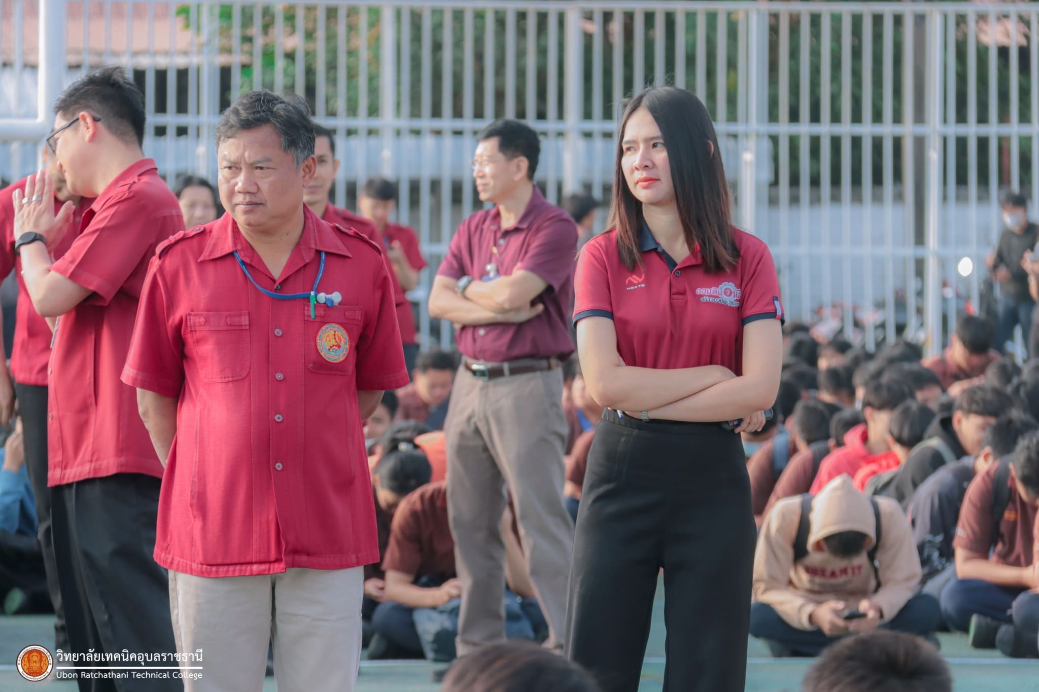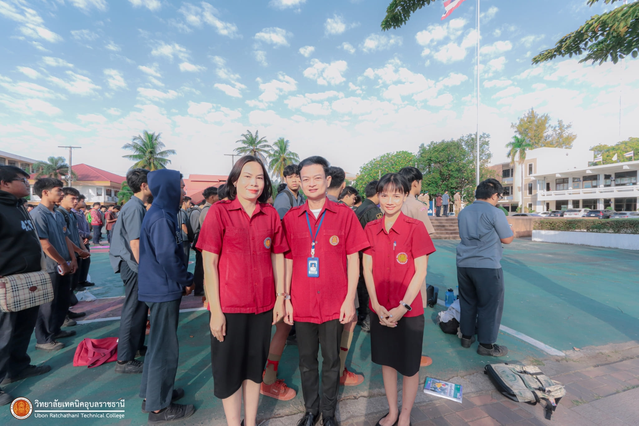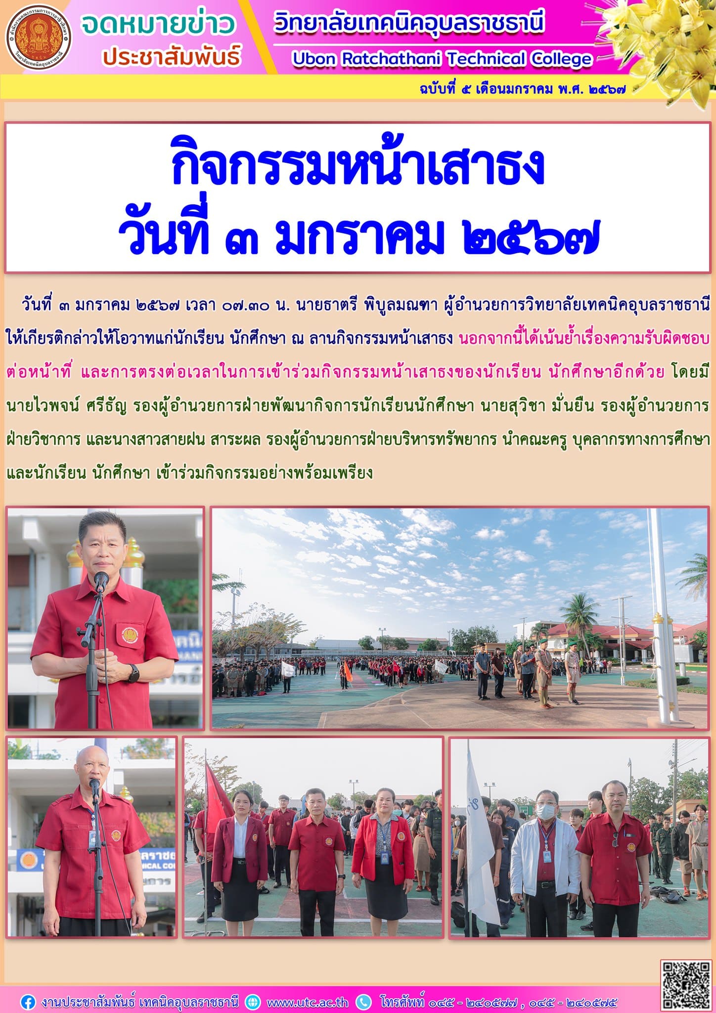 วันที่ ๒ มกราคม ๒๕๖๗ เวลา ๐๗.๓๐ น. นายธาตรี พิบูลมณฑา ผู้อำนวยการวิทยาลัยเทคนิคอุบลราชธานี ให้เกียรติกล่าวให้โอวาทและอวยพรปีใหม่ให้แก่คณะครู และนักเรียน นักศึกษา ณ ลานกิจกรรมหน้าเสาธง นอกจากนี้ได้เน้นย้ำเรื่องความรับผิดชอบต่อหน้าที่ และการตรงต่อเวลาในการเข้าร่วมกิจกรรมหน้าเสาธงของนักเรียน นักศึกษาอีกด้วย โดยมี นายไวพจน์ ศรีธัญ รองผู้อำนวยการฝ่ายพัฒนากิจการนักเรียนนักศึกษา นายสุวิชา มั่นยืน รองผู้อำนวยการฝ่ายวิชาการ และนางสาวสายฝน สาระผล รองผู้อำนวยการฝ่ายบริหารทรัพยากร นำคณะครู บุคลากรทางการศึกษา และนักเรียน นักศึกษา เข้าร่วมกิจกรรมอย่างพร้อมเพรียง