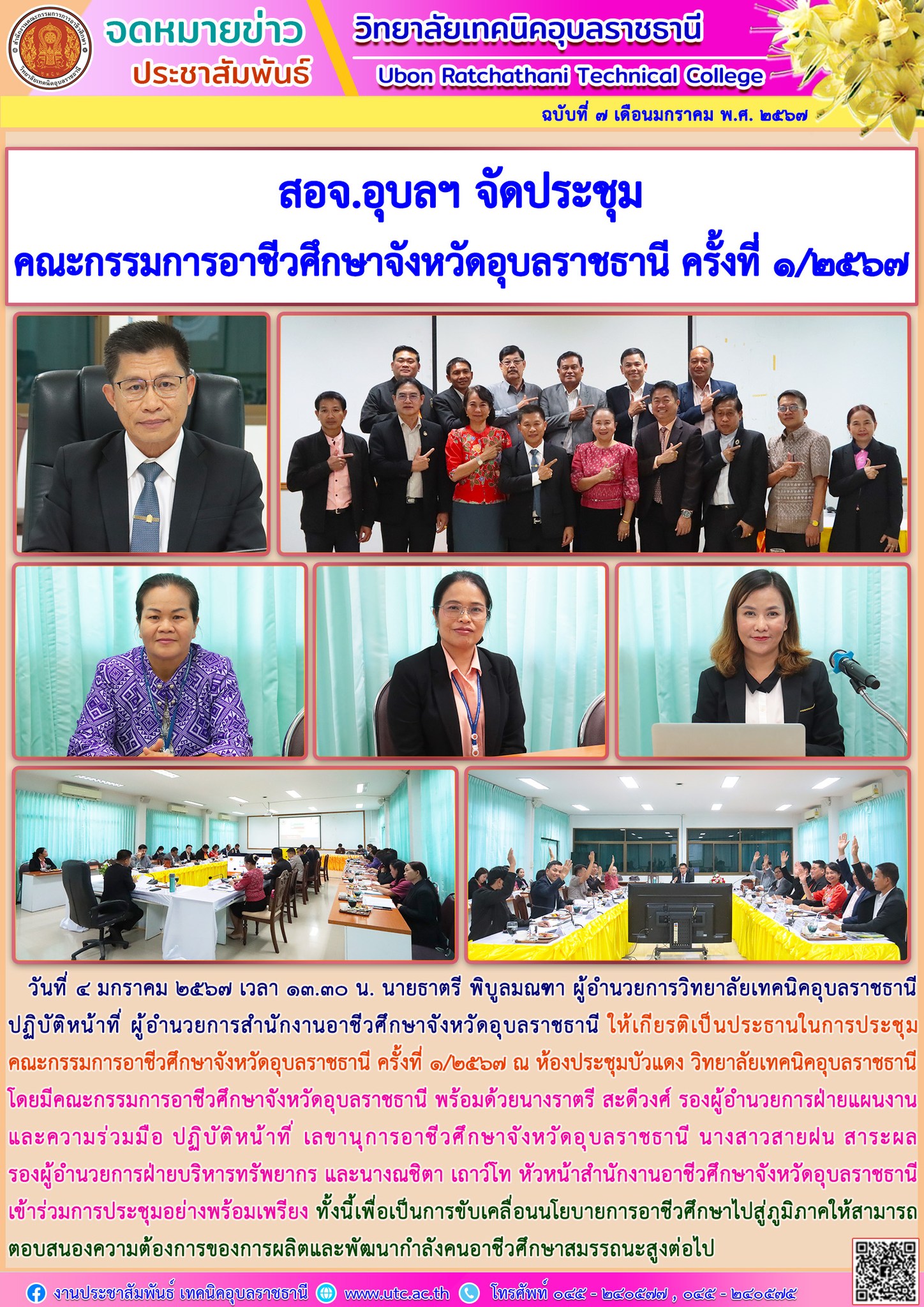 วันที่ ๔ มกราคม ๒๕๖๗ เวลา ๑๓.๓๐ น. นายธาตรี พิบูลมณฑา ผู้อำนวยการวิทยาลัยเทคนิคอุบลราชธานี ปฏิบัติหน้าที่ ผู้อำนวยการสำนักงานอาชีวศึกษาจังหวัดอุบลราชธานี ให้เกียรติเป็นประธานในการประชุมคณะกรรมการอาชีวศึกษาจังหวัดอุบลราชธานี ครั้งที่ ๑/๒๕๖๗ ณ ห้องประชุมบัวแดง วิทยาลัยเทคนิคอุบลราชธานีโดยมีคณะกรรมการอาชีวศึกษาจังหวัดอุบลราชธานี พร้อมด้วยนางราตรี สะดีวงศ์ รองผู้อำนวยการฝ่ายแผนงานและความร่วมมือ ปฏิบัติหน้าที่ เลขานุการอาชีวศึกษาจังหวัดอุบลราชธานี นางสาวสายฝน สาระผลรองผู้อำนวยการฝ่ายบริหารทรัพยากร และนางณชิตา เถาว์โท หัวหน้าสำนักงานอาชีวศึกษาจังหวัดอุบลราชธานีเข้าร่วมการประชุมอย่างพร้อมเพรียง ทั้งนี้เพื่อเป็นการขับเคลื่อนนโยบายการอาชีวศึกษาไปสู่ภูมิภาคให้สามารถตอบสนองความต้องการของการผลิตและพัฒนากำลังคนอาชีวศึกษาสมรรถนะสูงต่อไป