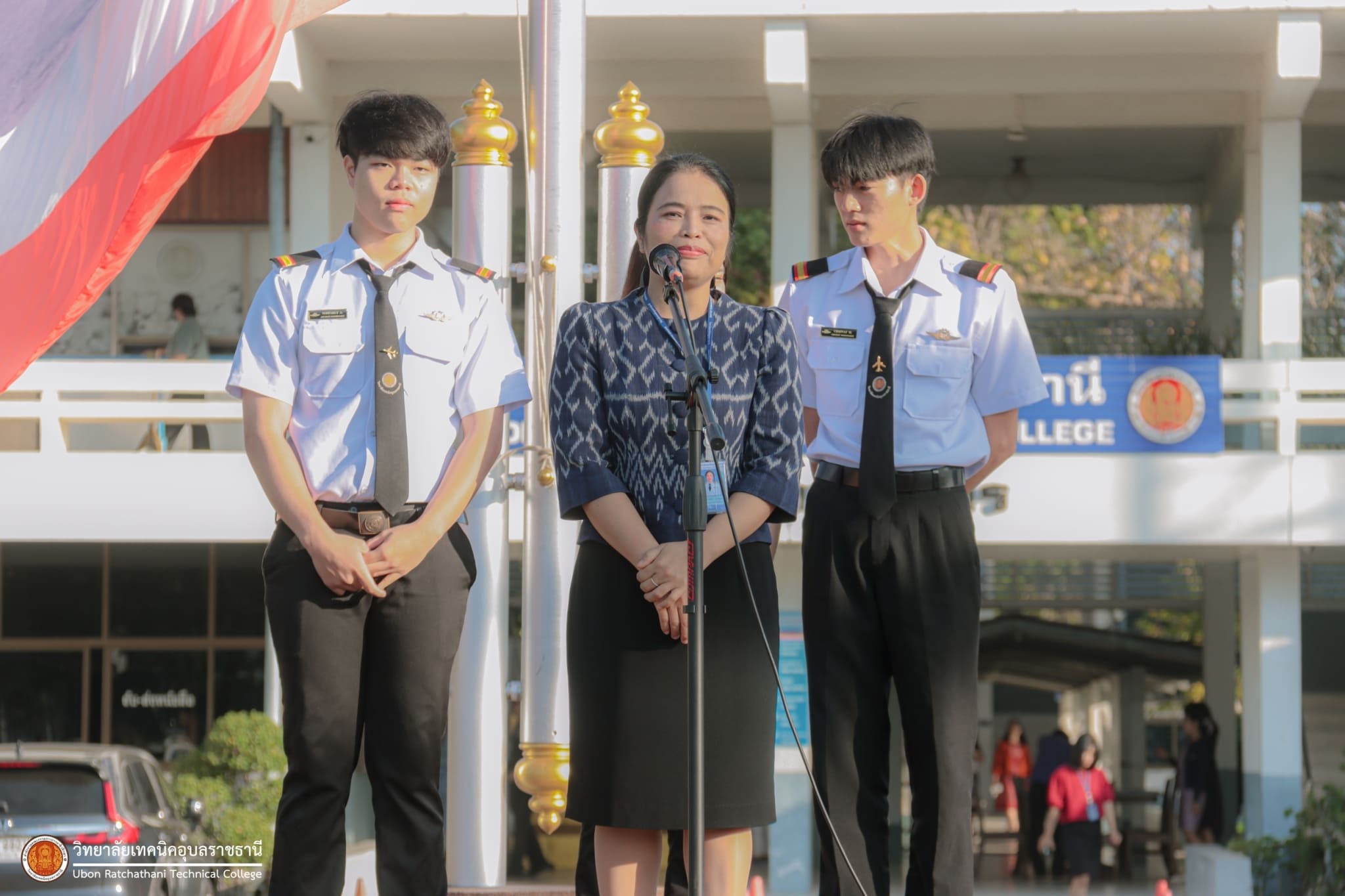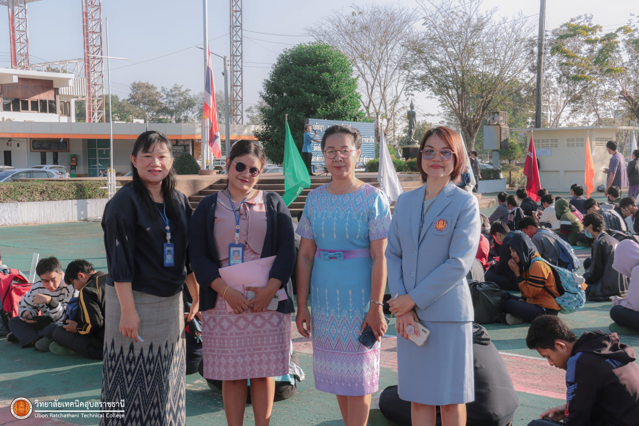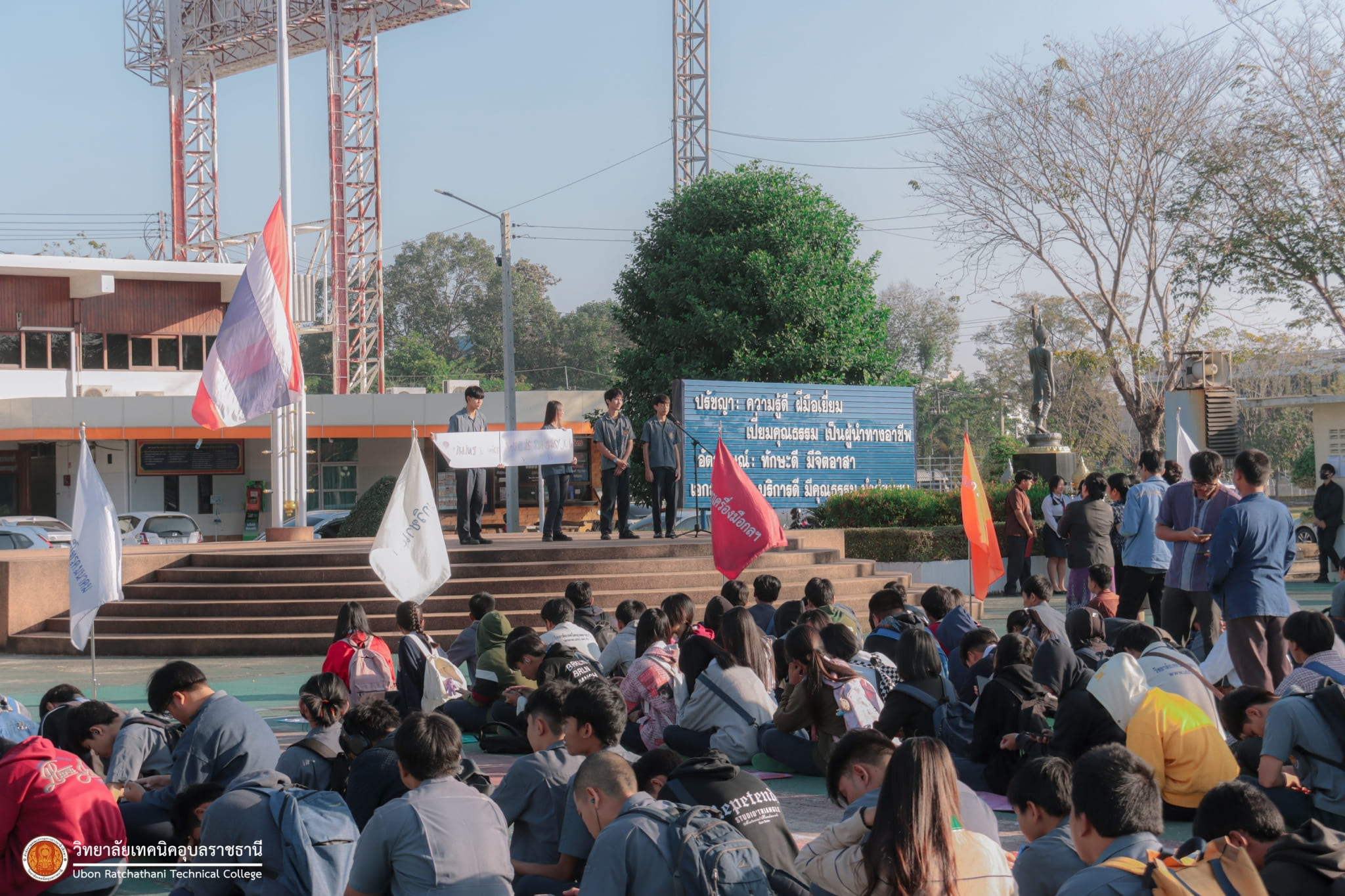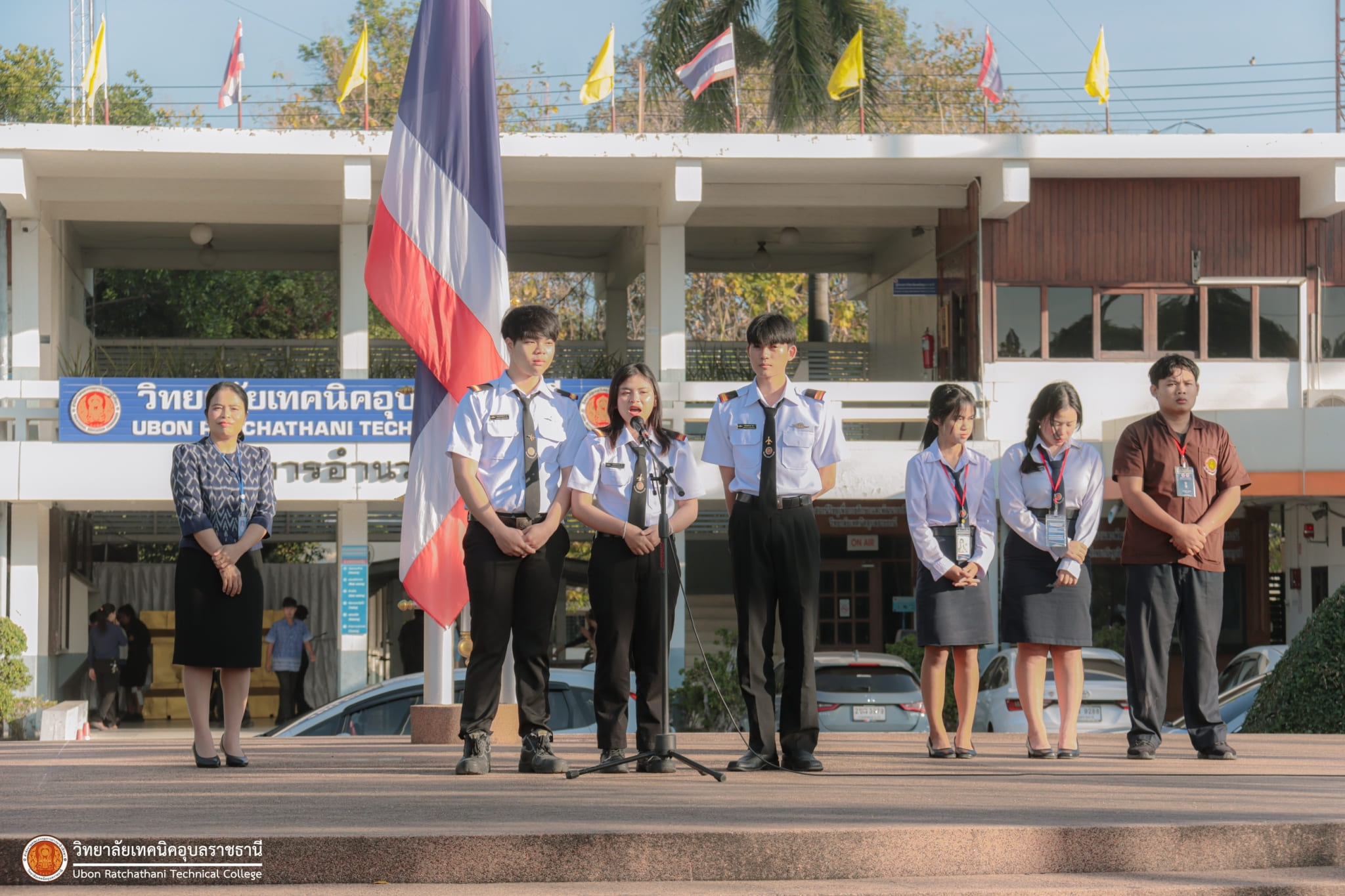 วันที่ ๕ มกราคม ๒๕๖๗ เวลา ๐๗.๓๐ น. นายธาตรี พิบูลมณฑา ผู้อำนวยการวิทยาลัยเทคนิคอุบลราชธานี มอบหมายให้ นางสาวสายฝน สาระผล รองผู้อำนวยการฝ่ายบริหารทรัพยากร กล่าวให้โอวาทและอวยพรปีใหม่แก่คณะครู และนักเรียน นักศึกษา ณ ลานกิจกรรมหน้าเสาธง นอกจากนี้ได้ประชาสัมพันธ์ข้อมูลข่าวสาร เรื่องการแข่งขันทักษะระดับชาติ อีกทั้งยังได้ให้ ตัวแทนนักศึกษาระดับชั้น ปวส.๑ แผนกวิชาช่างอากาศยาน ที่จะเข้าร่วมการแข่งขันทักษะระดับชาติ แนะนำตัว โดยมี นายไวพจน์ ศรีธัญ รองผู้อำนวยการฝ่ายพัฒนากิจการนักเรียนนักศึกษา และนางราตรี สะดีวงศ์ รองผู้อำนวยการฝ่ายแผนงานและความร่วมมือ นำคณะครู บุคลากรทางการศึกษา และนักเรียน นักศึกษา เข้าร่วมกิจกรรมอย่างพร้อมเพรียง