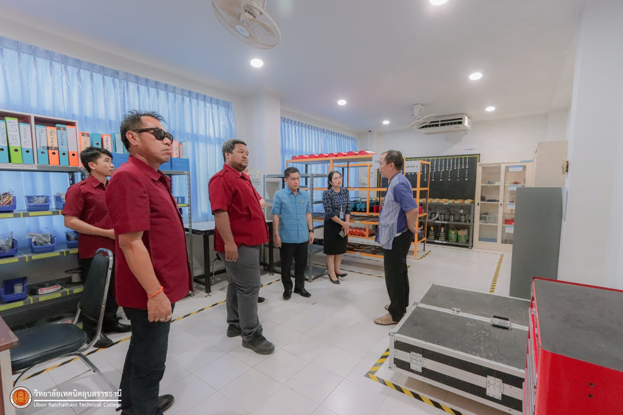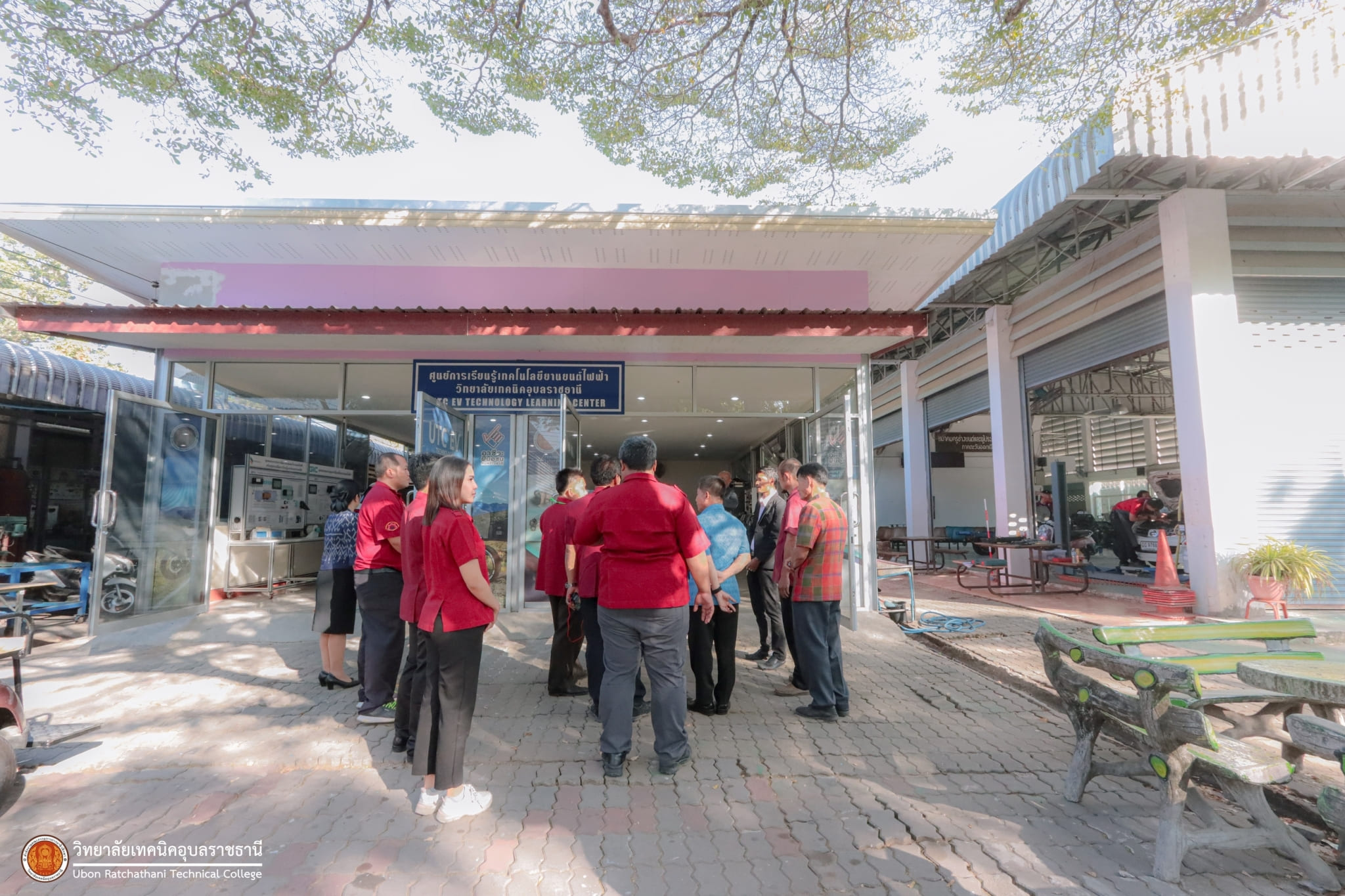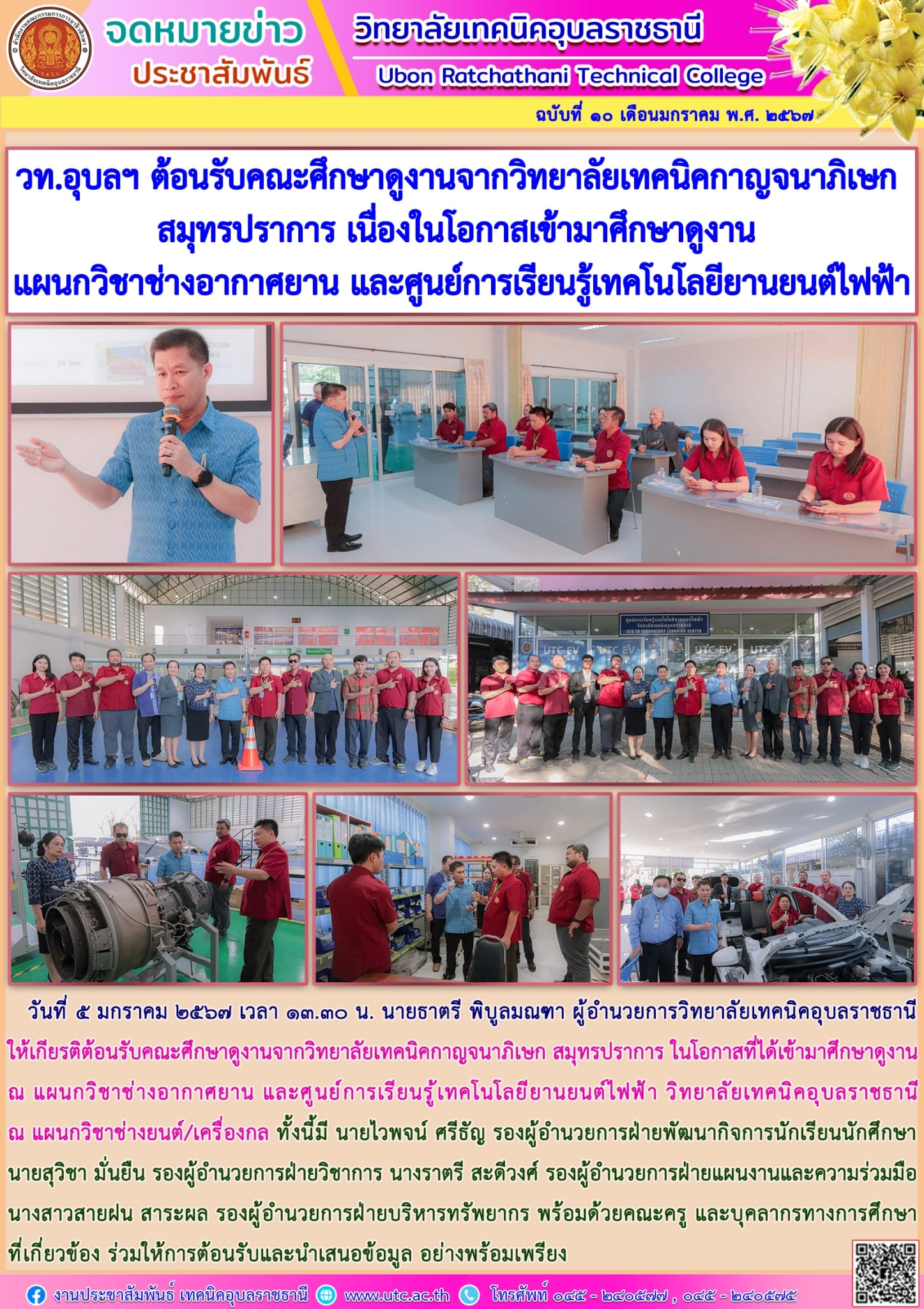 วันที่ ๕ มกราคม ๒๕๖๗ เวลา ๑๓.๓๐ น. นายธาตรี พิบูลมณฑา ผู้อำนวยการวิทยาลัยเทคนิคอุบลราชธานี ให้เกียรติต้อนรับคณะศึกษาดูงานจากวิทยาลัยเทคนิคกาญจนาภิเษก สมุทรปราการ ในโอกาสที่ได้เข้ามาศึกษาดูงาน ณ แผนกวิชาช่างอากาศยาน และศูนย์การเรียนรู้เทคโนโลยียานยนต์ไฟฟ้า วิทยาลัยเทคนิคอุบลราชธานี ณ แผนกวิชาช่างยนต์/เครื่องกล ทั้งนี้มี นายไวพจน์ ศรีธัญ รองผู้อำนวยการฝ่ายพัฒนากิจการนักเรียนนักศึกษา นายสุวิชา มั่นยืน รองผู้อำนวยการฝ่ายวิชาการ นางราตรี สะดีวงศ์ รองผู้อำนวยการฝ่ายแผนงานและความร่วมมือ นางสาวสายฝน สาระผล รองผู้อำนวยการฝ่ายบริหารทรัพยากร พร้อมด้วยคณะครู และบุคลากรทางการศึกษาที่เกี่ยวข้อง ร่วมให้การต้อนรับและนำเสนอข้อมูล อย่างพร้อมเพรียง
