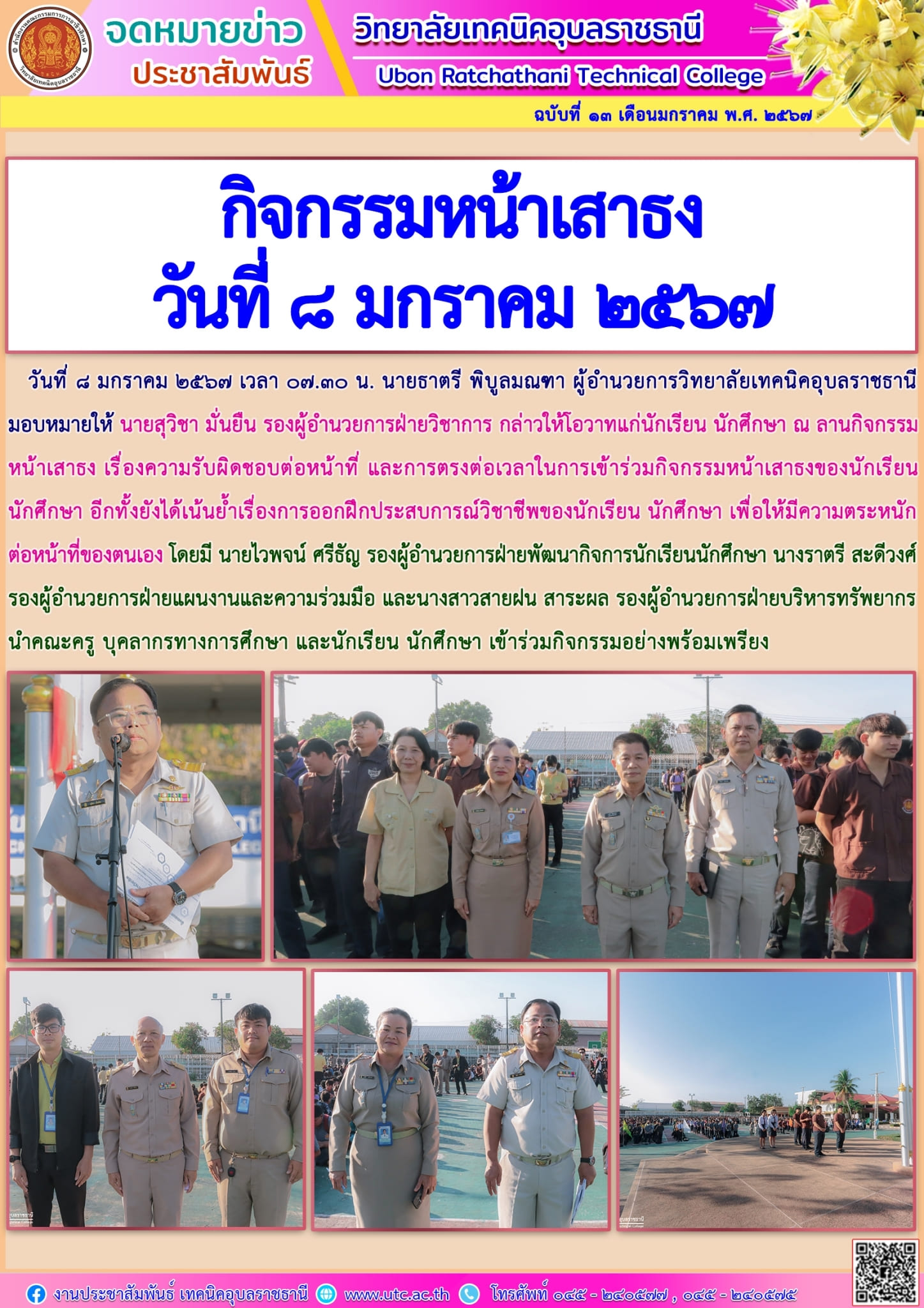 วันที่ ๘ มกราคม ๒๕๖๗ เวลา ๐๗.๓๐ น. นายธาตรี พิบูลมณฑา ผู้อำนวยการวิทยาลัยเทคนิคอุบลราชธานี มอบหมายให้ นายสุวิชา มั่นยืน รองผู้อำนวยการฝ่ายวิชาการ กล่าวให้โอวาทแก่นักเรียน นักศึกษา ณ ลานกิจกรรมหน้าเสาธง เรื่องความรับผิดชอบต่อหน้าที่ และการตรงต่อเวลาในการเข้าร่วมกิจกรรมหน้าเสาธงของนักเรียน นักศึกษา อีกทั้งยังได้เน้นย้ำเรื่องการออกฝึกประสบการณ์วิชาชีพของนักเรียน นักศึกษา เพื่อให้มีความตระหนักต่อหน้าที่ของตนเอง โดยมี นายไวพจน์ ศรีธัญ รองผู้อำนวยการฝ่ายพัฒนากิจการนักเรียนนักศึกษา นางราตรี สะดีวงศ์ รองผู้อำนวยการฝ่ายแผนงานและความร่วมมือ และนางสาวสายฝน สาระผล รองผู้อำนวยการฝ่ายบริหารทรัพยากร นำคณะครู บุคลากรทางการศึกษา และนักเรียน นักศึกษา เข้าร่วมกิจกรรมอย่างพร้อมเพรียง