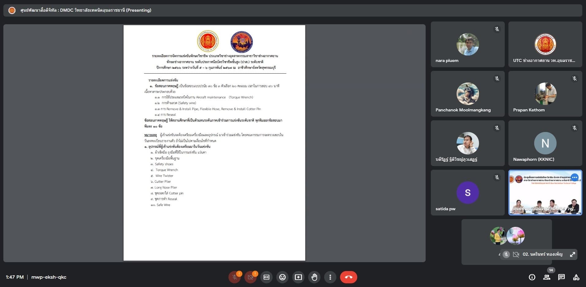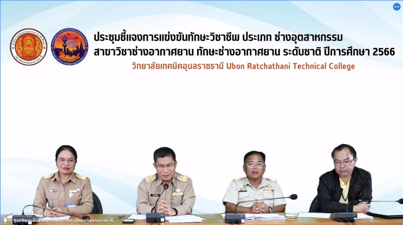 วันที่ ๘ มกราคม ๒๕๖๗ เวลา ๑๓.๓๐ น. นายธาตรี พิบูลมณฑา ผู้อำนวยการวิทยาลัยเทคนิคอุบลราชธานี ให้เกียรติเป็นประธานในการประชุมชี้แจงการแข่งขันทักษะวิชาชีพ ประเภท ช่างอุตสาหกรรม สาขาวิชาช่างอากาศยาน ทักษะช่างอากาศยาน ระดับชาติ ปีการศึกษา ๒๕๖๖ ผ่านระบบออนไลน์ Google Meet ณ ห้องศูนย์พัฒนาสื่อดิจิทัล DMDC วิทยาลัยเทคนิคอุบลราชธานี โดยมี นายสุวิชา มั่นยืน รองผู้อำนวยการฝ่ายวิชาการ นางสาวสายฝน สาระผล รองผู้อำนวยการฝ่ายบริหารทรัพยากร นายอภิสิทธิ์ พรมดอน หัวหน้าแผนกวิชาช่างอากาศยาน พร้อมด้วยตัวแทนจากวิทยาลัยที่จัดการเรียนการสอนสาขาวิชาช่างอากาศยานทั้ง ๖ แห่ง ได้แก่ ๑.วิทยาลัยเทคนิคถลาง ๒.วิทยาลัยเทคนิคสัตหีบ ๓.วิทยาลัยการอาชีพขอนแก่น ๔.วิทยาลัยเทคนิคดอนเมือง ๕.โรงเรียน ขส.ทบ. และ๖.วิทยาลัยเทคนิคสมุทรปราการ เข้าร่วมการประชุมอย่างพร้อมเพรียง ทั้งนี้เพื่อปรึกษาหารือและเตรียมความพร้อมในการจัดการแข่งขันทักษะวิชาชีพ สาขาวิชาช่างอากาศยาน ต่อไป