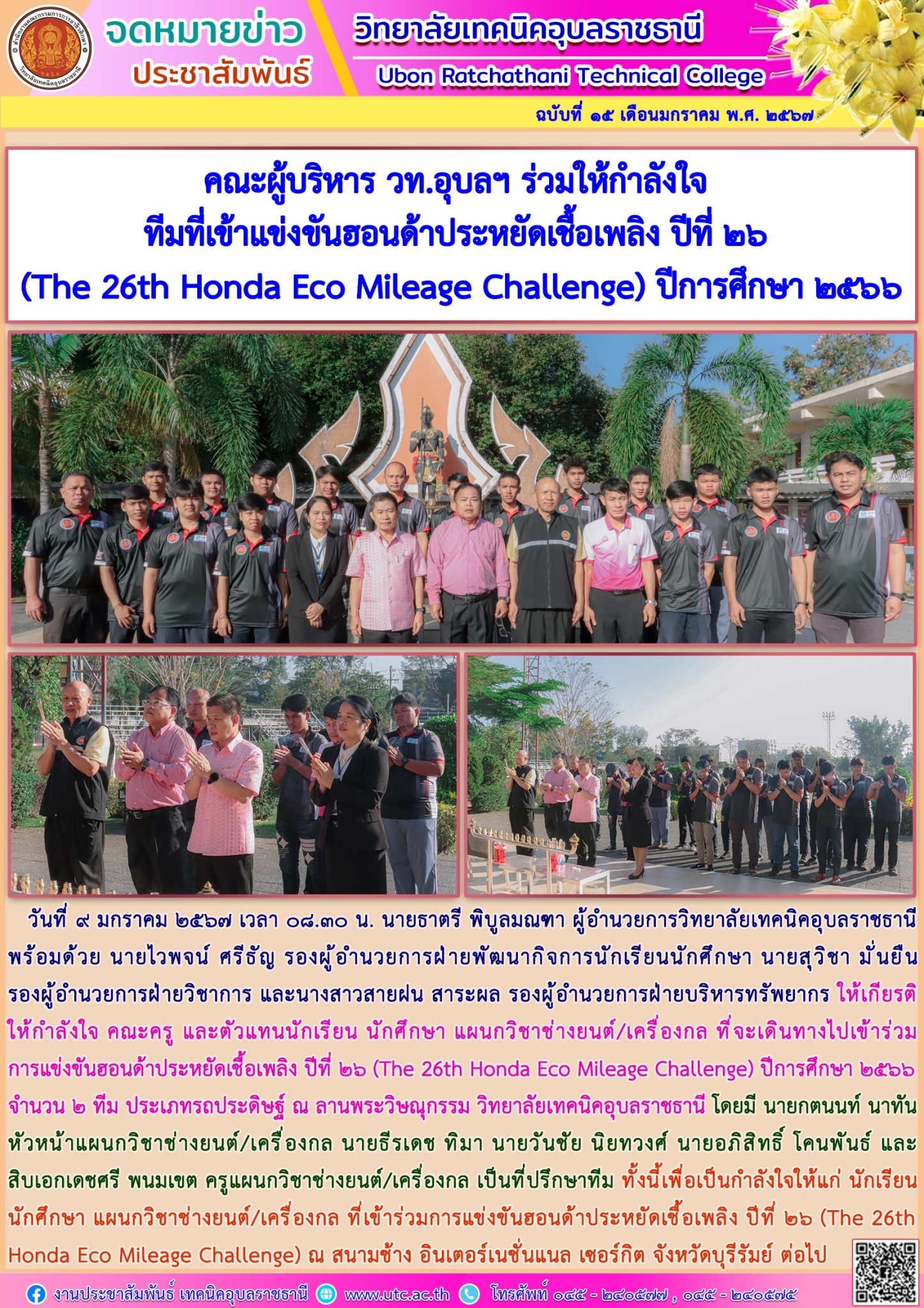 วันที่ ๙ มกราคม ๒๕๖๗ เวลา ๐๘.๓๐ น. นายธาตรี พิบูลมณฑา ผู้อำนวยการวิทยาลัยเทคนิคอุบลราชธานี พร้อมด้วย นายไวพจน์ ศรีธัญ รองผู้อำนวยการฝ่ายพัฒนากิจการนักเรียนนักศึกษา นายสุวิชา มั่นยืน รองผู้อำนวยการฝ่ายวิชาการ และนางสาวสายฝน สาระผล รองผู้อำนวยการฝ่ายบริหารทรัพยากร ให้เกียรติให้กำลังใจ คณะครู และตัวแทนนักเรียน นักศึกษา แผนกวิชาช่างยนต์/เครื่องกล ที่จะเดินทางไปเข้าร่วมการแข่งขันฮอนด้าประหยัดเชื้อเพลิง ปีที่ ๒๖ (The 26th Honda Eco Mileage Challenge) ปีการศึกษา ๒๕๖๖ จำนวน ๒ ทีม ประเภทรถประดิษฐ์ ณ ลานพระวิษณุกรรม วิทยาลัยเทคนิคอุบลราชธานี โดยมี นายกตนนท์ นาทัน หัวหน้าแผนกวิชาช่างยนต์/เครื่องกล นายธีรเดช ทิมา นายวันชัย นิยทวงศ์ นายอภิสิทธิ์ โคนพันธ์ และสิบเอกเดชศรี พนมเขต ครูแผนกวิชาช่างยนต์/เครื่องกล เป็นที่ปรึกษาทีม ทั้งนี้เพื่อเป็นกำลังใจให้แก่ นักเรียน นักศึกษา แผนกวิชาช่างยนต์/เครื่องกล ที่เข้าร่วมการแข่งขันฮอนด้าประหยัดเชื้อเพลิง ปีที่ ๒๖ (The 26th Honda Eco Mileage Challenge) ณ สนามช้าง อินเตอร์เนชั่นแนล เซอร์กิต จังหวัดบุรีรัมย์ ต่อไป