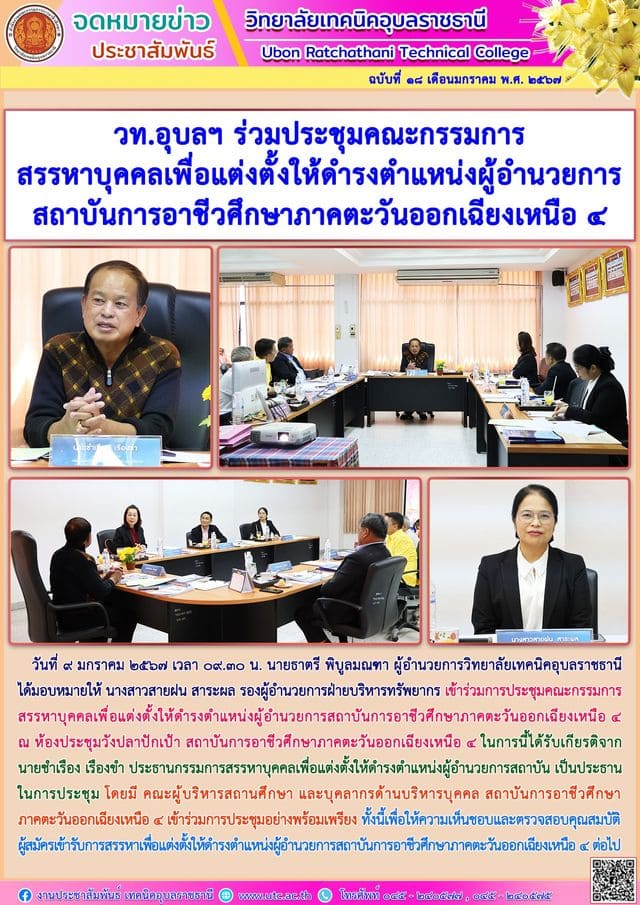 วันที่ ๙ มกราคม ๒๕๖๗ เวลา ๐๙.๓๐ น. นายธาตรี พิบูลมณฑา ผู้อำนวยการวิทยาลัยเทคนิคอุบลราชธานี ได้มอบหมายให้ นางสาวสายฝน สาระผล รองผู้อำนวยการฝ่ายบริหารทรัพยากร เข้าร่วมการประชุมคณะกรรมการสรรหาบุคคลเพื่อแต่งตั้งให้ดำรงตำแหน่งผู้อำนวยการสถาบันการอาชีวศึกษาภาคตะวันออกเฉียงเหนือ ๔ ณ ห้องประชุมวังปลาปักเป้า สถาบันการอาชีวศึกษาภาคตะวันออกเฉียงเหนือ ๔ ในการนี้ได้รับเกียรติจาก นายชำเรือง เรืองขำ ประธานกรรมการสรรหาบุคคลเพื่อแต่งตั้งให้ดำรงตำแหน่งผู้อำนวยการสถาบัน เป็นประธานในการประชุม โดยมี คณะผู้บริหารสถานศึกษา และบุคลากรด้านบริหารบุคคล สถาบันการอาชีวศึกษา ภาคตะวันออกเฉียงเหนือ ๔ เข้าร่วมการประชุมอย่างพร้อมเพรียง ทั้งนี้เพื่อให้ความเห็นชอบและตรวจสอบคุณสมบัติ ผู้สมัครเข้ารับการสรรหาเพื่อแต่งตั้งให้ดำรงตำแหน่งผู้อำนวยการสถาบันการอาชีวศึกษาภาคตะวันออกเฉียงเหนือ ๔ ต่อไป