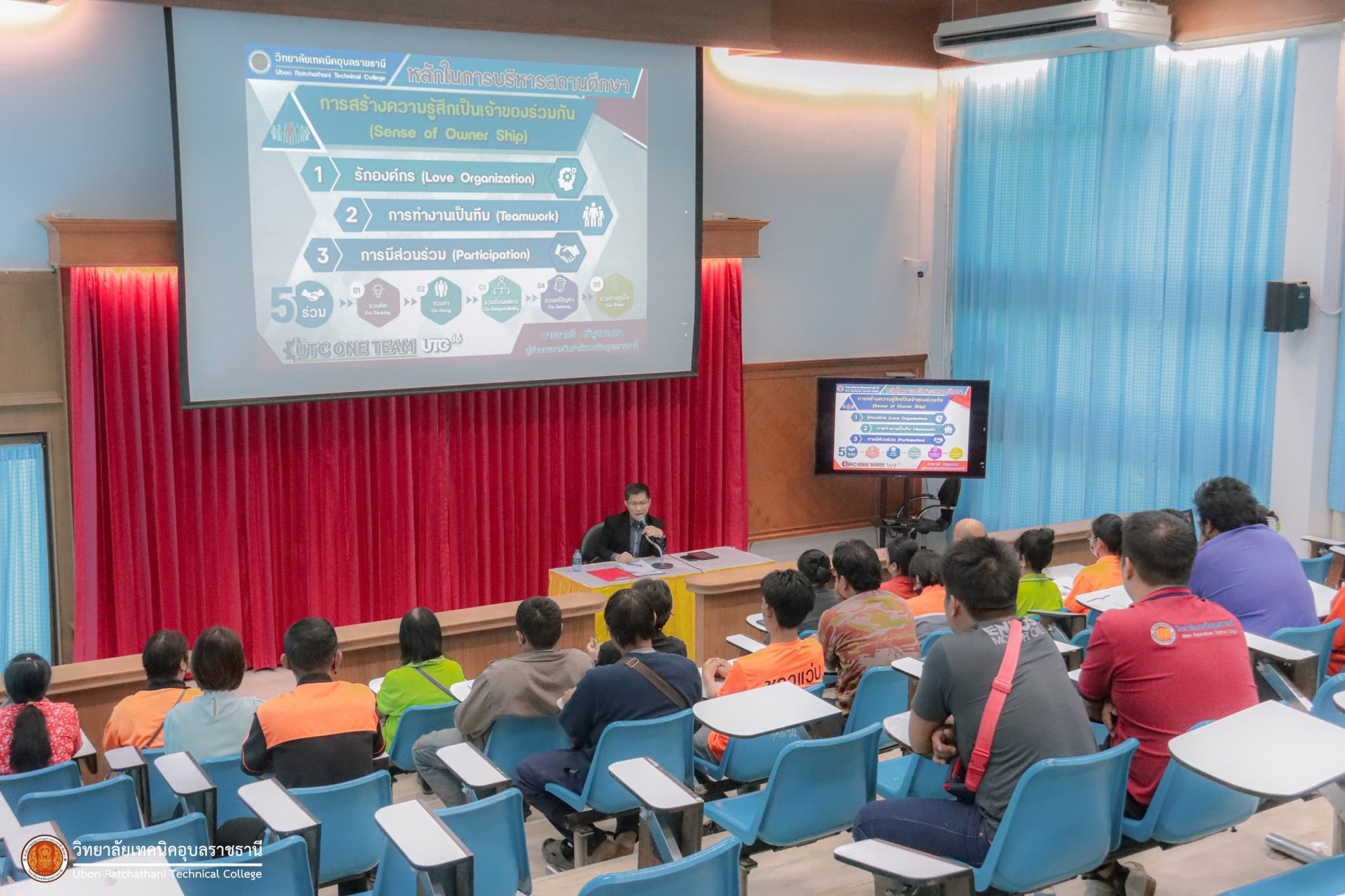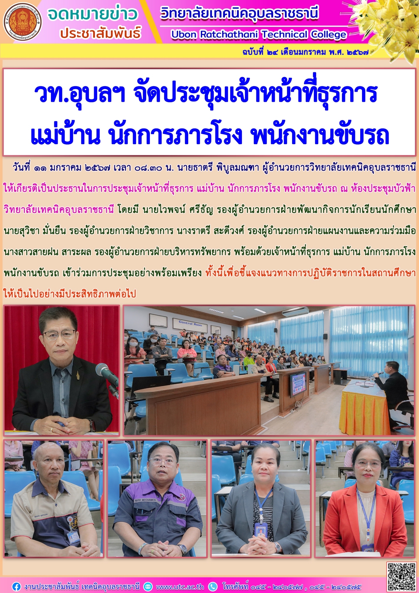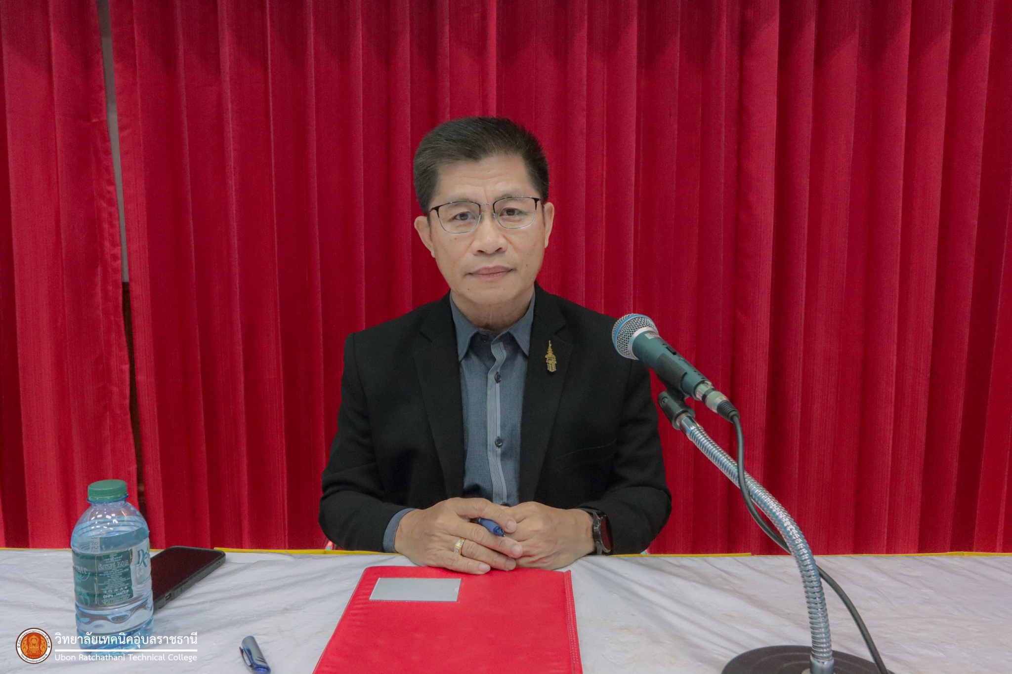 วันที่ ๑๑ มกราคม ๒๕๖๗ เวลา ๐๘.๓๐ น. นายธาตรี พิบูลมณฑา ผู้อำนวยการวิทยาลัยเทคนิคอุบลราชธานี ให้เกียรติเป็นประธานในการประชุมเจ้าหน้าที่ธุรการ แม่บ้าน นักการภารโรง พนักงานขับรถ ณ ห้องประชุมบัวฟ้า วิทยาลัยเทคนิคอุบลราชธานี โดยมี นายไวพจน์ ศรีธัญ รองผู้อำนวยการฝ่ายพัฒนากิจการนักเรียนนักศึกษา นายสุวิชา มั่นยืน รองผู้อำนวยการฝ่ายวิชาการ นางราตรี สะดีวงศ์ รองผู้อำนวยการฝ่ายแผนงานและความร่วมมือ นางสาวสายฝน สาระผล รองผู้อำนวยการฝ่ายบริหารทรัพยากร พร้อมด้วยเจ้าหน้าที่ธุรการ แม่บ้าน นักการภารโรง พนักงานขับรถ เข้าร่วมการประชุมอย่างพร้อมเพรียง ทั้งนี้เพื่อชี้แจงแนวทางการปฏิบัติราชการในสถานศึกษาให้เป็นไปอย่างมีประสิทธิภาพต่อไป