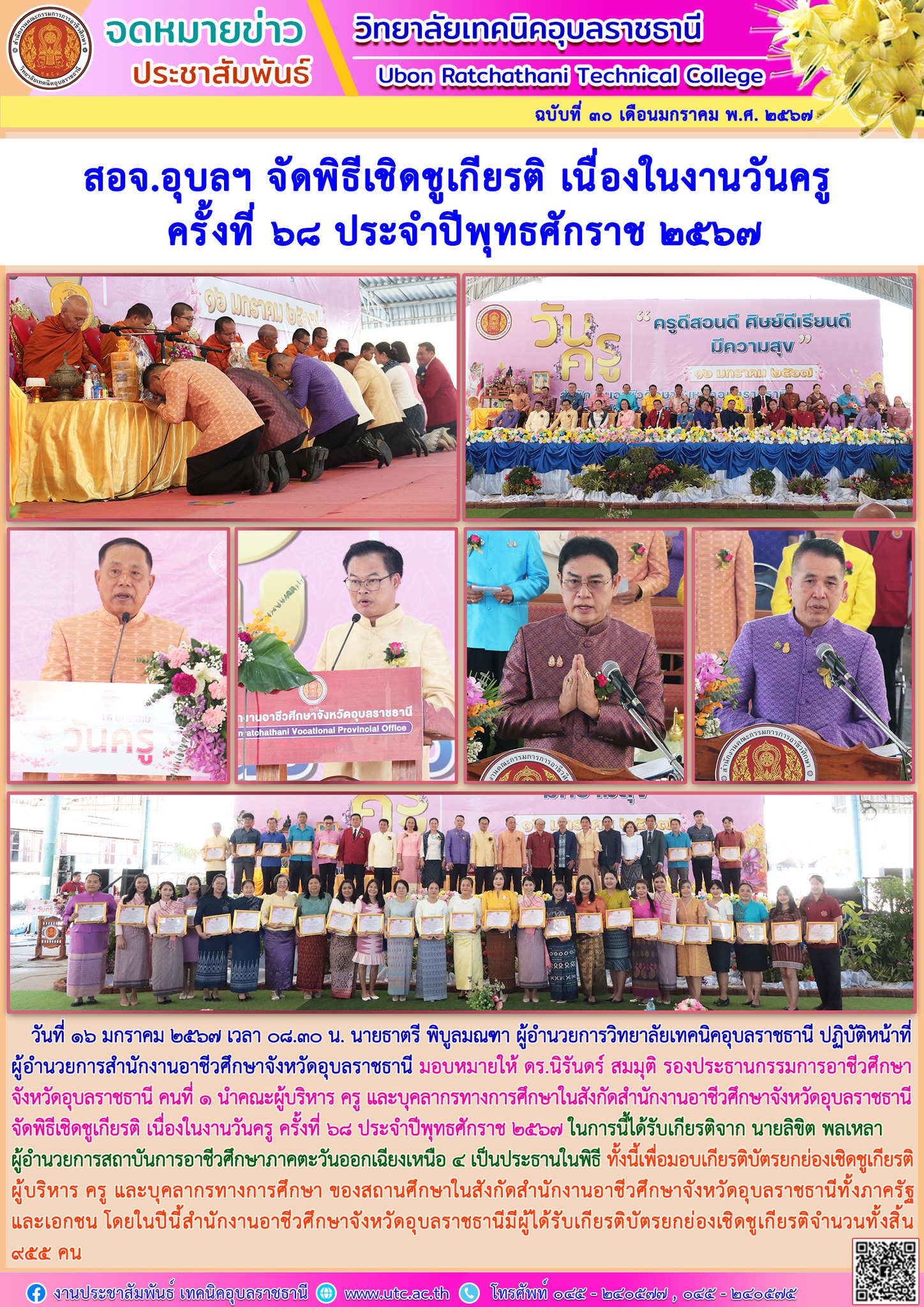 สอจ.อุบลฯ จัดพิธีเชิดชูเกียรติ เนื่องในโอกาสวันครู ครั้งที่ ๖๘ ประจำปีพุทธศักราช ๒๕๖๗