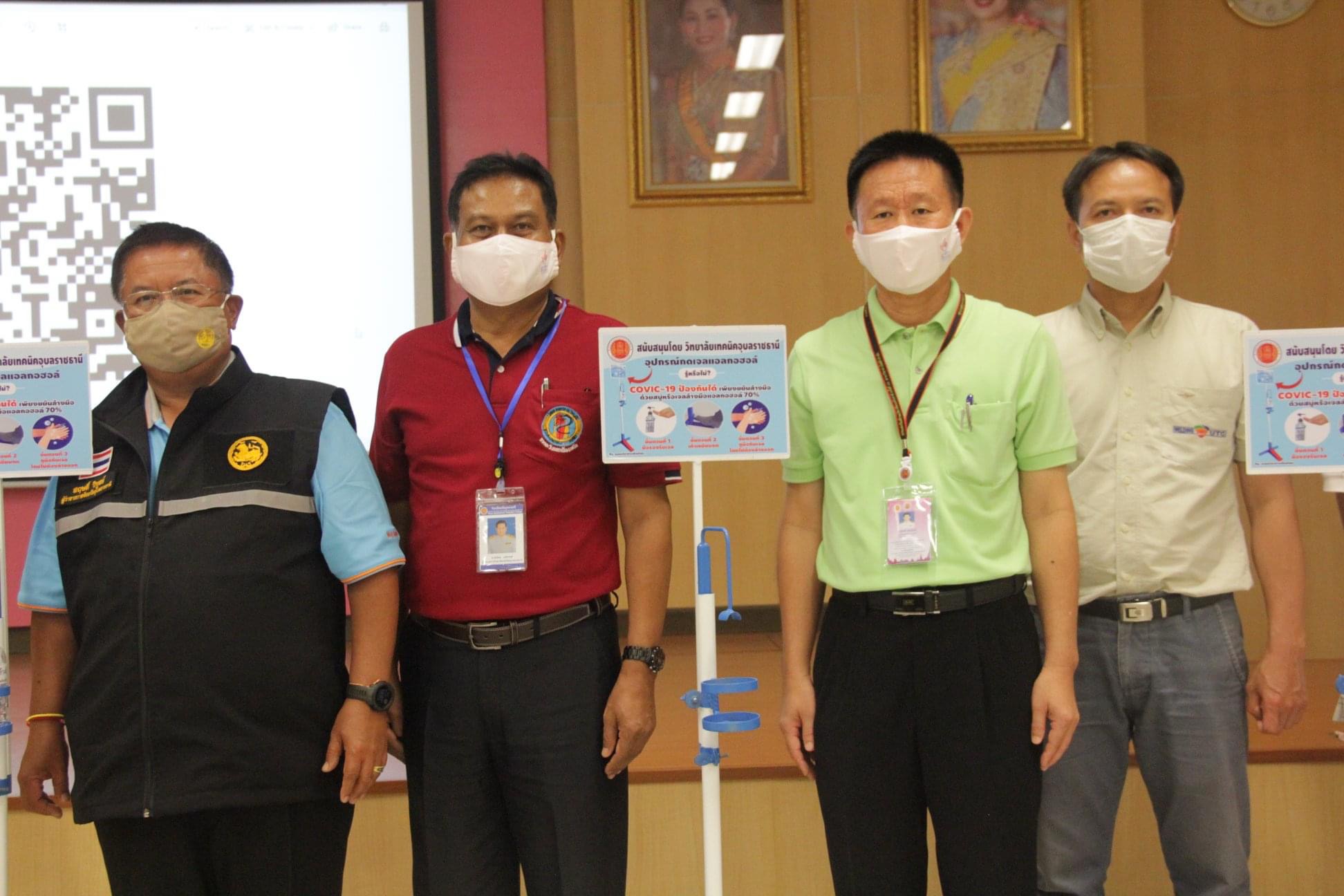 เมื่อวันที่ ๑ พฤษภาคม ๒๕๖๓ เวลา ๑๓.๐๐ น. นายนิยม แสงวงศ์ ผู้อำนวยการวิทยาลัยเทคนิคอุบลราชธานี พร้อมด้วยนายมนตรี สุริยพันตรี รองผู้อำนวยการฝ่ายบริหารทรัพยากร นายทวีศักดิ์ บุตรจันทร์ รองผู้อำนวยการฝ่ายแผนงานและความร่วมมือ วิทยาลัยเทคนิคอุบลราชธานี ได้เดินทางไปมอบเครื่องกดเจลแอลกอฮอล์ จำนวนทั้งสิ้น 5 เครื่อง ในโครงการจัดทำเครื่องมือทางการแพทย์และอุปกรณ์เจลแอลกอฮอล์ เพื่อป้องกันการระบาดของเชื้อไวรัส COVID-19 (โควิด 19) ณ ศาลากลาง จังหวัดอุบลราชธานี โดยมี ท่านสฤษดิ์ วิฑูรย์ ผู้ว่าราชการจังหวัดอุบลราชธานี ได้ให้เกียรติเป็นผู้รับมอบเครื่องกดเจลแอลกอฮอล์ในครั้งนี้