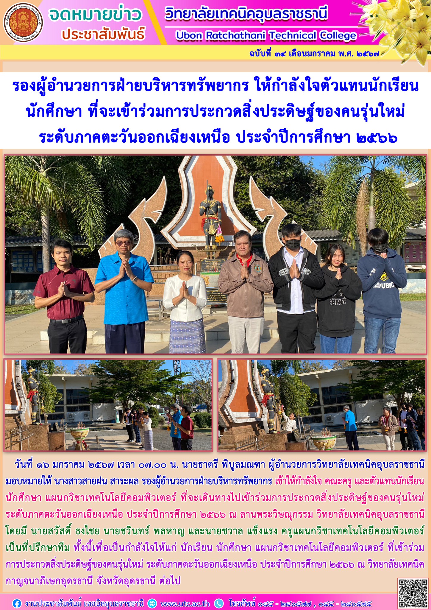 วันที่ ๑๖ มกราคม ๒๕๖๗ เวลา ๐๗.๐๐ น. นายธาตรี พิบูลมณฑา ผู้อำนวยการวิทยาลัยเทคนิคอุบลราชธานี มอบหมายให้ นางสาวสายฝน สาระผล รองผู้อำนวยการฝ่ายบริหารทรัพยากร เข้าให้กำลังใจ คณะครู และตัวแทนนักเรียน นักศึกษา แผนกวิชาเทคโนโลยีคอมพิวเตอร์ ที่จะเดินทางไปเข้าร่วมการประกวดสิ่งประดิษฐ์ของคนรุ่นใหม่ ระดับภาคตะวันออกเฉียงเหนือ ประจำปีการศึกษา ๒๕๖๖ ณ ลานพระวิษณุกรรม วิทยาลัยเทคนิคอุบลราชธานี โดยมี นายสวัสดิ์ ธงไชย นายชวินทร์ พลหาญ และนายชวาล แข็งแรง ครูแผนกวิชาเทคโนโลยีคอมพิวเตอร์ เป็นที่ปรึกษาทีม ทั้งนี้เพื่อเป็นกำลังใจให้แก่ นักเรียน นักศึกษา แผนกวิชาเทคโนโลยีคอมพิวเตอร์ ที่เข้าร่วมการประกวดสิ่งประดิษฐ์ของคนรุ่นใหม่ ระดับภาคตะวันออกเฉียงเหนือ ประจำปีการศึกษา ๒๕๖๖ ณ วิทยาลัยเทคนิคกาญจนาภิเษกอุดรธานี จังหวัดอุดรธานี ต่อไป