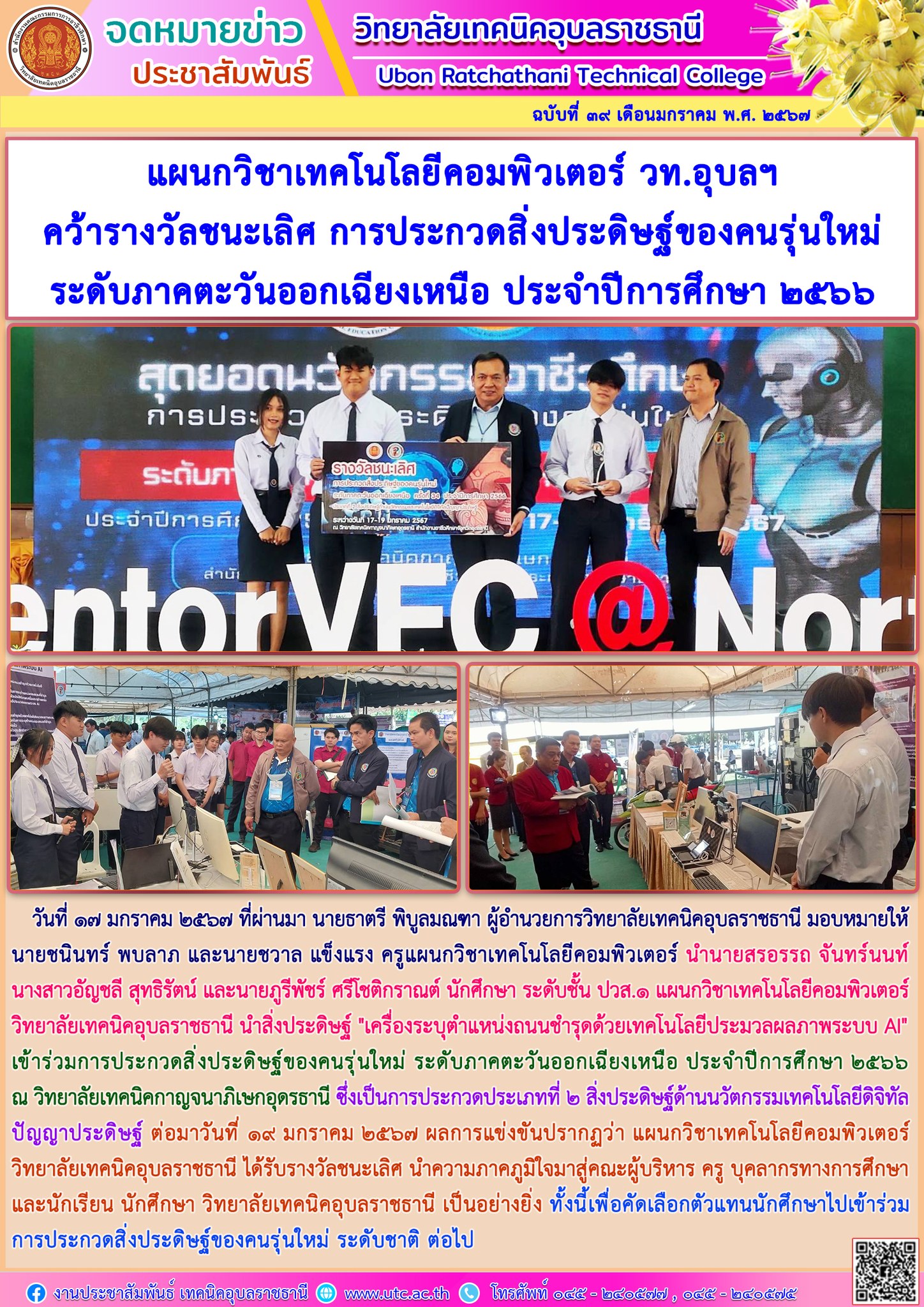แผนกวิชาเทคโนโลยีคอมพิวเตอร์ วท.อุบลฯ คว้ารางวัลชนะเลิศ การประกวดสิ่งประดิษฐ์ของคนรุ่นใหม่ ระดับภาคตะวันออกเฉียงเหนือ ประจำปีการศึกษา ๒๕๖๖