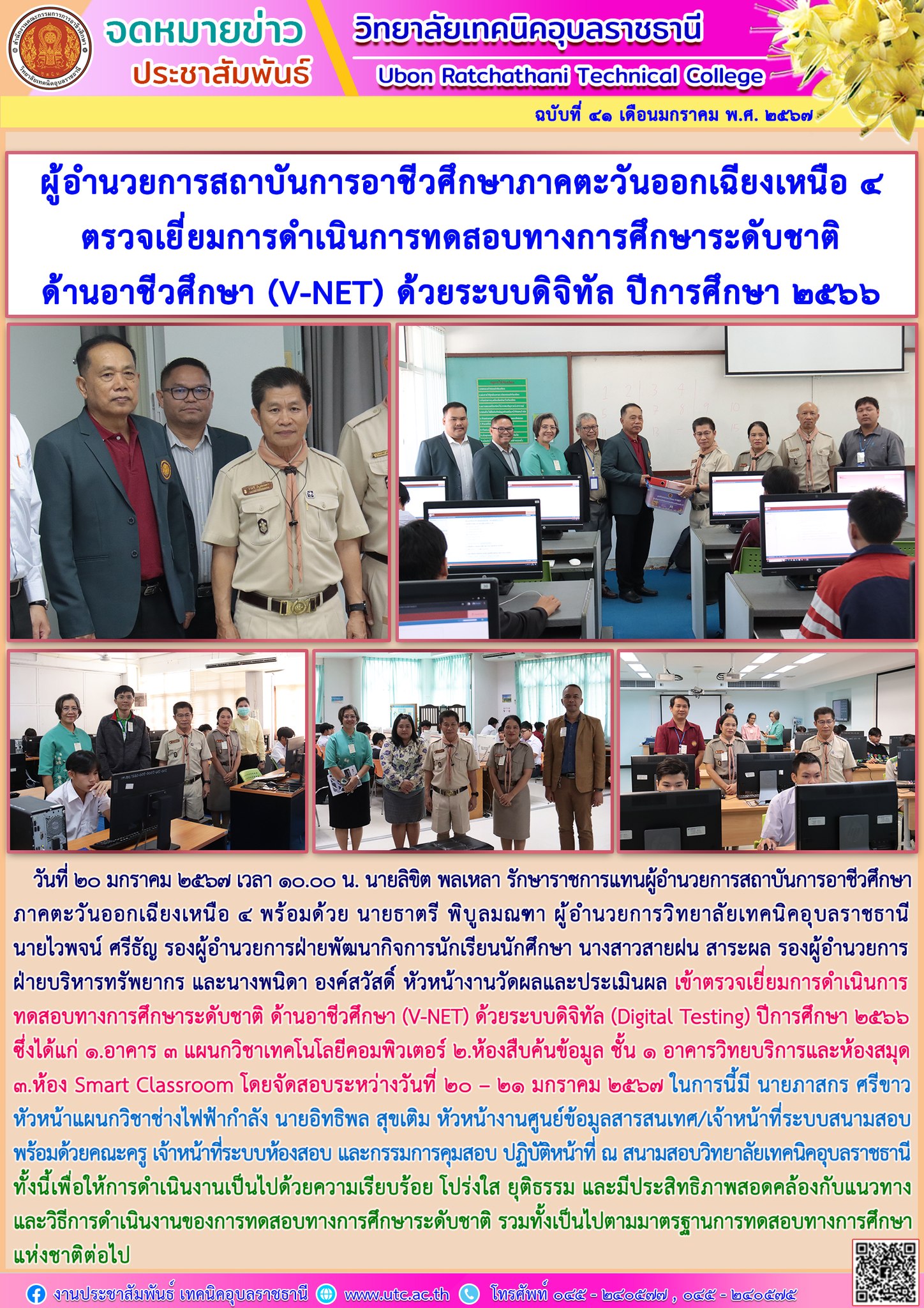 วันที่ ๒๐ มกราคม ๒๕๖๗ เวลา ๑๐.๐๐ น. นายลิขิต พลเหลา รักษาราชการแทนผู้อำนวยการสถาบันการอาชีวศึกษาภาคตะวันออกเฉียงเหนือ ๔ พร้อมด้วย นายธาตรี พิบูลมณฑา ผู้อำนวยการวิทยาลัยเทคนิคอุบลราชธานี นายไวพจน์ ศรีธัญ รองผู้อำนวยการฝ่ายพัฒนากิจการนักเรียนนักศึกษา นางสาวสายฝน สาระผล รองผู้อำนวยการฝ่ายบริหารทรัพยากร และนางพนิดา องค์สวัสดิ์ หัวหน้างานวัดผลและประเมินผล เข้าตรวจเยี่ยมการดำเนินการทดสอบทางการศึกษาระดับชาติ ด้านอาชีวศึกษา (V-NET) ด้วยระบบดิจิทัล (Digital Testing) ปีการศึกษา ๒๕๖๖ ซึ่งได้แก่ ๑.อาคาร ๓ แผนกวิชาเทคโนโลยีคอมพิวเตอร์ ๒.ห้องสืบค้นข้อมูล ชั้น ๑ อาคารวิทยบริการและห้องสมุด และ๓.ห้อง Smart Classroom โดยจัดสอบระหว่างวันที่ ๒๐ – ๒๑ มกราคม ๒๕๖๗ ในการนี้มี นายภาสกร ศรีขาว หัวหน้าแผนกวิชาช่างไฟฟ้ากำลัง นายอิทธิพล สุขเติม หัวหน้างานศูนย์ข้อมูลสารสนเทศ/เจ้าหน้าที่ระบบสนามสอบ พร้อมด้วยคณะครู เจ้าหน้าที่ระบบห้องสอบ และกรรมการคุมสอบ ปฏิบัติหน้าที่ ณ สนามสอบวิทยาลัยเทคนิคอุบลราชธานี ทั้งนี้เพื่อให้การดำเนินงานเป็นไปด้วยความเรียบร้อย โปร่งใส ยุติธรรม และมีประสิทธิภาพสอดคล้องกับแนวทางและวิธีการดำเนินงานของการทดสอบทางการศึกษาระดับชาติ รวมทั้งเป็นไปตามมาตรฐานการทดสอบทางการศึกษาแห่งชาติต่อไป