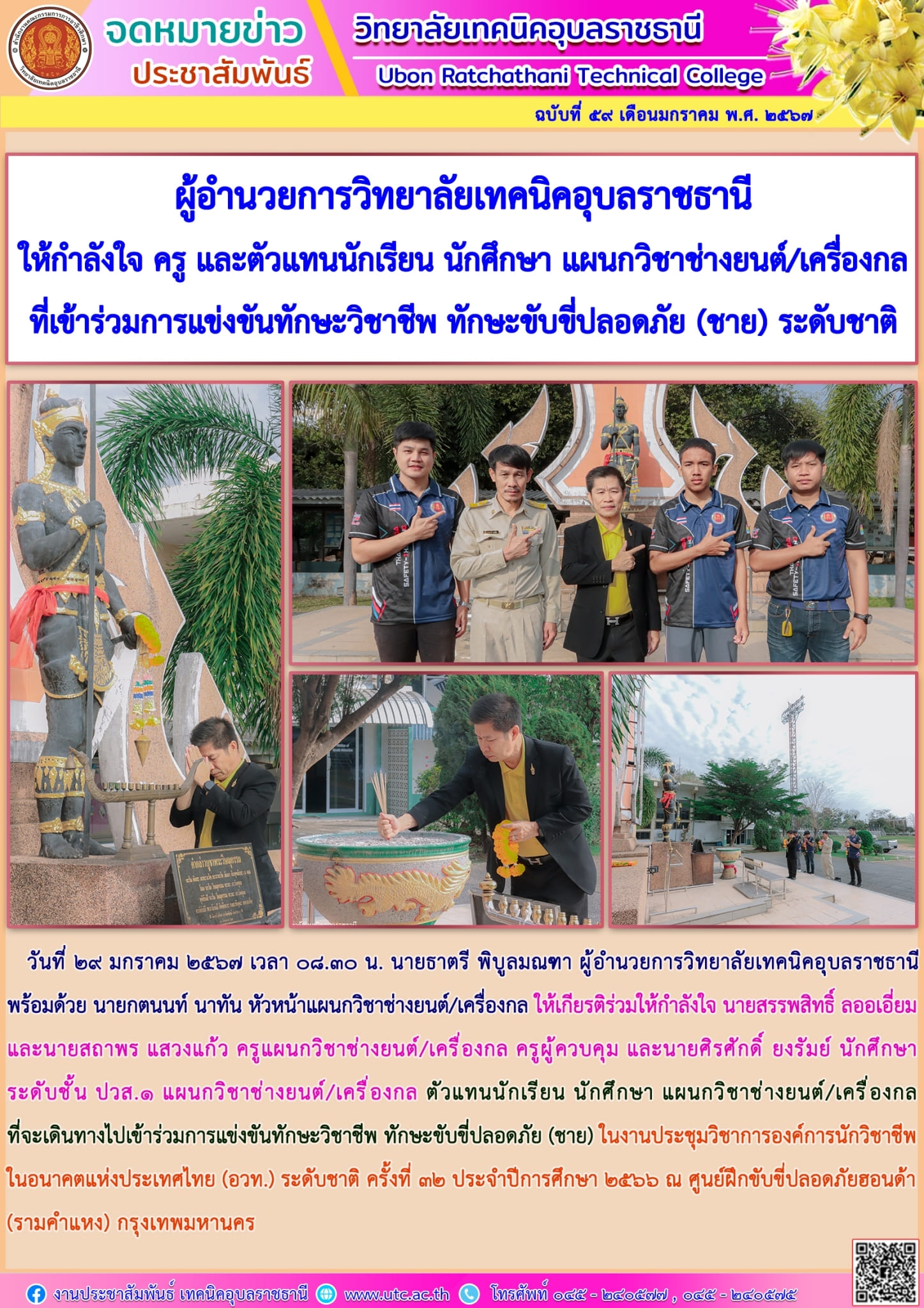 วันที่ ๒๙ มกราคม ๒๕๖๗ เวลา ๐๘.๓๐ น. นายธาตรี พิบูลมณฑา ผู้อำนวยการวิทยาลัยเทคนิคอุบลราชธานี พร้อมด้วย นายกตนนท์ นาทัน หัวหน้าแผนกวิชาช่างยนต์/เครื่องกล ให้เกียรติร่วมให้กำลังใจ นายสรรพสิทธิ์ ลออเอี่ยม และนายสถาพร แสวงแก้ว ครูแผนกวิชาช่างยนต์/เครื่องกล ครูผู้ควบคุม และนายศิรศักดิ์ ยงรัมย์ นักศึกษาระดับชั้น ปวส.๑ แผนกวิชาช่างยนต์/เครื่องกล ตัวแทนนักเรียน นักศึกษา แผนกวิชาช่างยนต์/เครื่องกล ที่จะเดินทางไปเข้าร่วมการแข่งขันทักษะวิชาชีพ ทักษะขับขี่ปลอดภัย (ชาย) ในงานประชุมวิชาการองค์การนักวิชาชีพในอนาคตแห่งประเทศไทย (อวท.) ระดับชาติ ครั้งที่ ๓๒ ประจำปีการศึกษา ๒๕๖๖ ณ ศูนย์ฝึกขับขี่ปลอดภัยฮอนด้า (รามคำแหง) กรุงเทพมหานคร