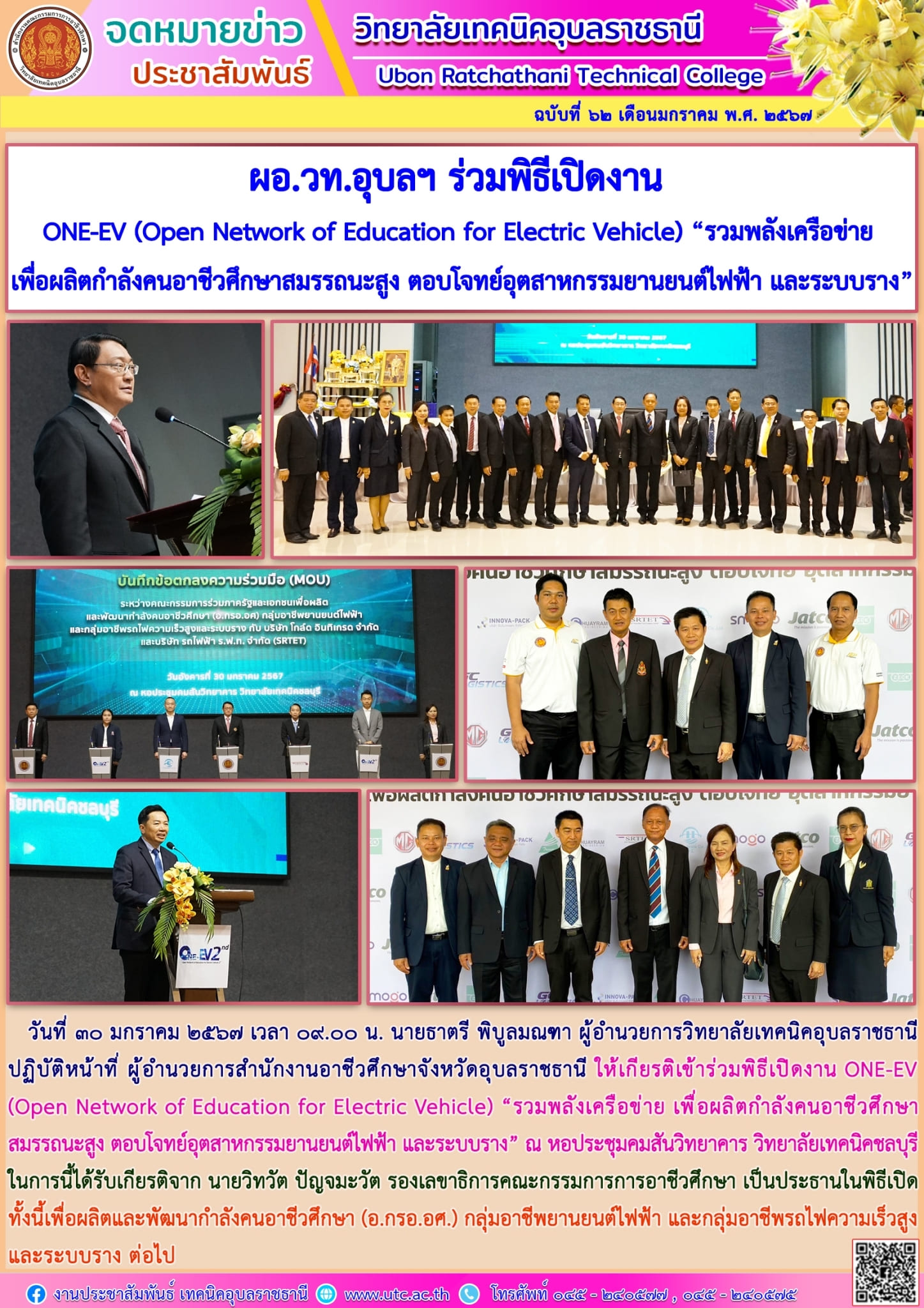 วันที่ ๓๐ มกราคม ๒๕๖๗ เวลา ๐๙.๐๐ น. นายธาตรี พิบูลมณฑา ผู้อำนวยการวิทยาลัยเทคนิคอุบลราชธานี ปฏิบัติหน้าที่ ผู้อำนวยการสำนักงานอาชีวศึกษาจังหวัดอุบลราชธานี ให้เกียรติเข้าร่วมพิธีเปิดงาน ONE-EV (Open Network of Education for Electric Vehicle) “รวมพลังเครือข่าย เพื่อผลิตกำลังคนอาชีวศึกษาสมรรถนะสูง ตอบโจทย์อุตสาหกรรมยานยนต์ไฟฟ้า และระบบราง” ณ หอประชุมคมสันวิทยาคาร วิทยาลัยเทคนิคชลบุรี ในการนี้ได้รับเกียรติจาก นายวิทวัต ปัญจมะวัต รองเลขาธิการคณะกรรมการการอาชีวศึกษา เป็นประธานในพิธีเปิด ทั้งนี้เพื่อผลิตและพัฒนากำลังคนอาชีวศึกษา (อ.กรอ.อศ.) กลุ่มอาชีพยานยนต์ไฟฟ้า และกลุ่มอาชีพรถไฟความเร็วสูงและระบบราง ต่อไป