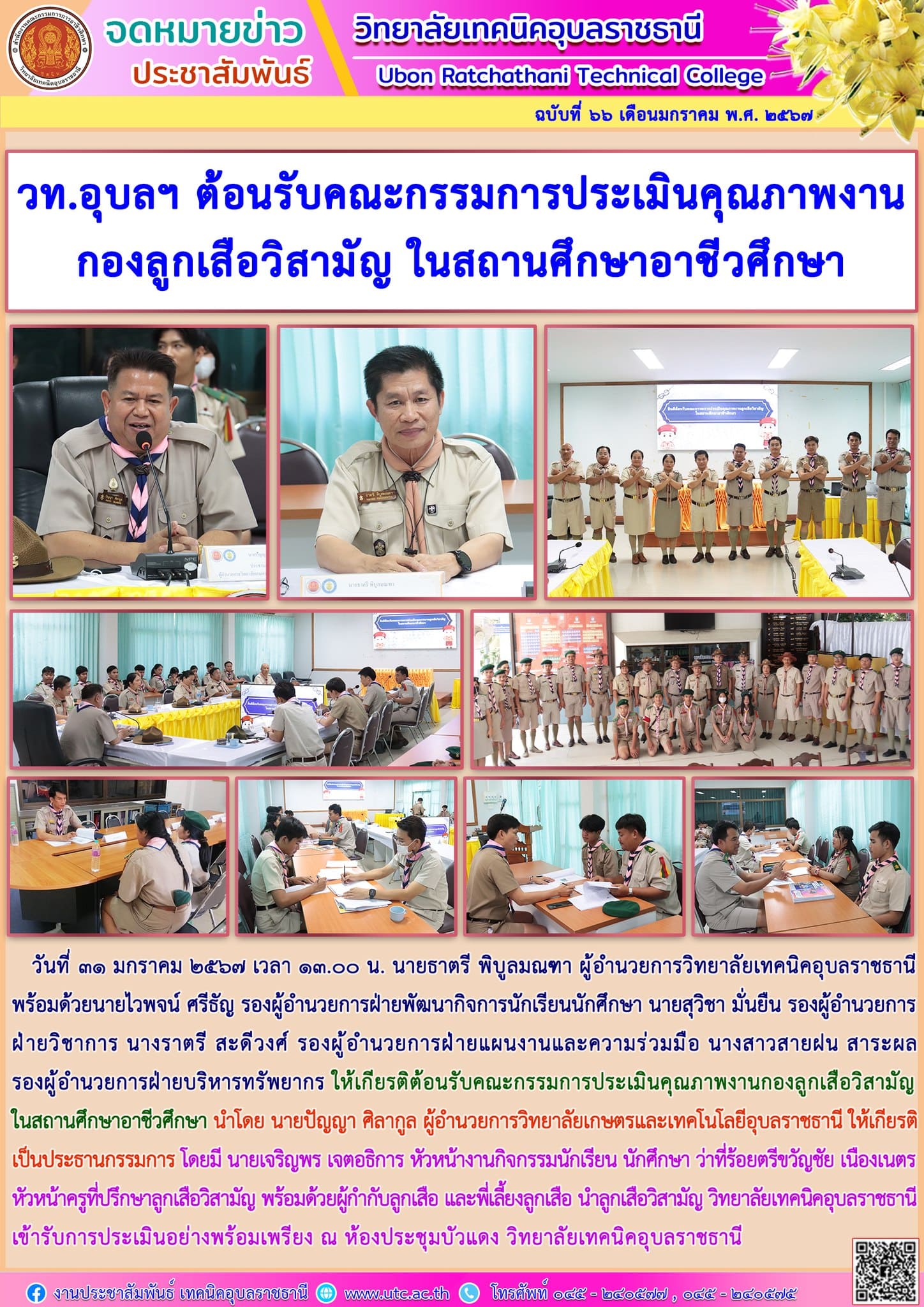 วันที่ ๓๑ มกราคม ๒๕๖๗ เวลา ๑๓.๐๐ น. นายธาตรี พิบูลมณฑา ผู้อำนวยการวิทยาลัยเทคนิคอุบลราชธานี พร้อมด้วยนายไวพจน์ ศรีธัญ รองผู้อำนวยการฝ่ายพัฒนากิจการนักเรียนนักศึกษา นายสุวิชา มั่นยืน รองผู้อำนวยการฝ่ายวิชาการ นางราตรี สะดีวงศ์ รองผู้อำนวยการฝ่ายแผนงานและความร่วมมือ นางสาวสายฝน สาระผล รองผู้อำนวยการฝ่ายบริหารทรัพยากร ให้เกียรติต้อนรับคณะกรรมการประเมินคุณภาพงานกองลูกเสือวิสามัญ ในสถานศึกษาอาชีวศึกษา นำโดย นายปัญญา ศิลากูล ผู้อำนวยการวิทยาลัยเกษตรและเทคโนโลยีอุบลราชธานี ให้เกียรติเป็นประธานกรรมการ โดยมี นายเจริญพร เจตอธิการ หัวหน้างานกิจกรรมนักเรียน นักศึกษา ว่าที่ร้อยตรีขวัญชัย เนืองเนตร หัวหน้าครูที่ปรึกษาลูกเสือวิสามัญ พร้อมด้วยผู้กำกับลูกเสือ และพี่เลี้ยงลูกเสือ นำลูกเสือวิสามัญ วิทยาลัยเทคนิคอุบลราชธานี เข้ารับการประเมินอย่างพร้อมเพรียง ณ ห้องประชุมบัวแดง วิทยาลัยเทคนิคอุบลราชธานี