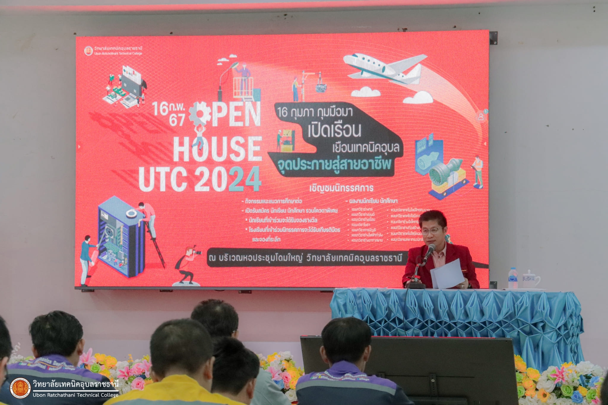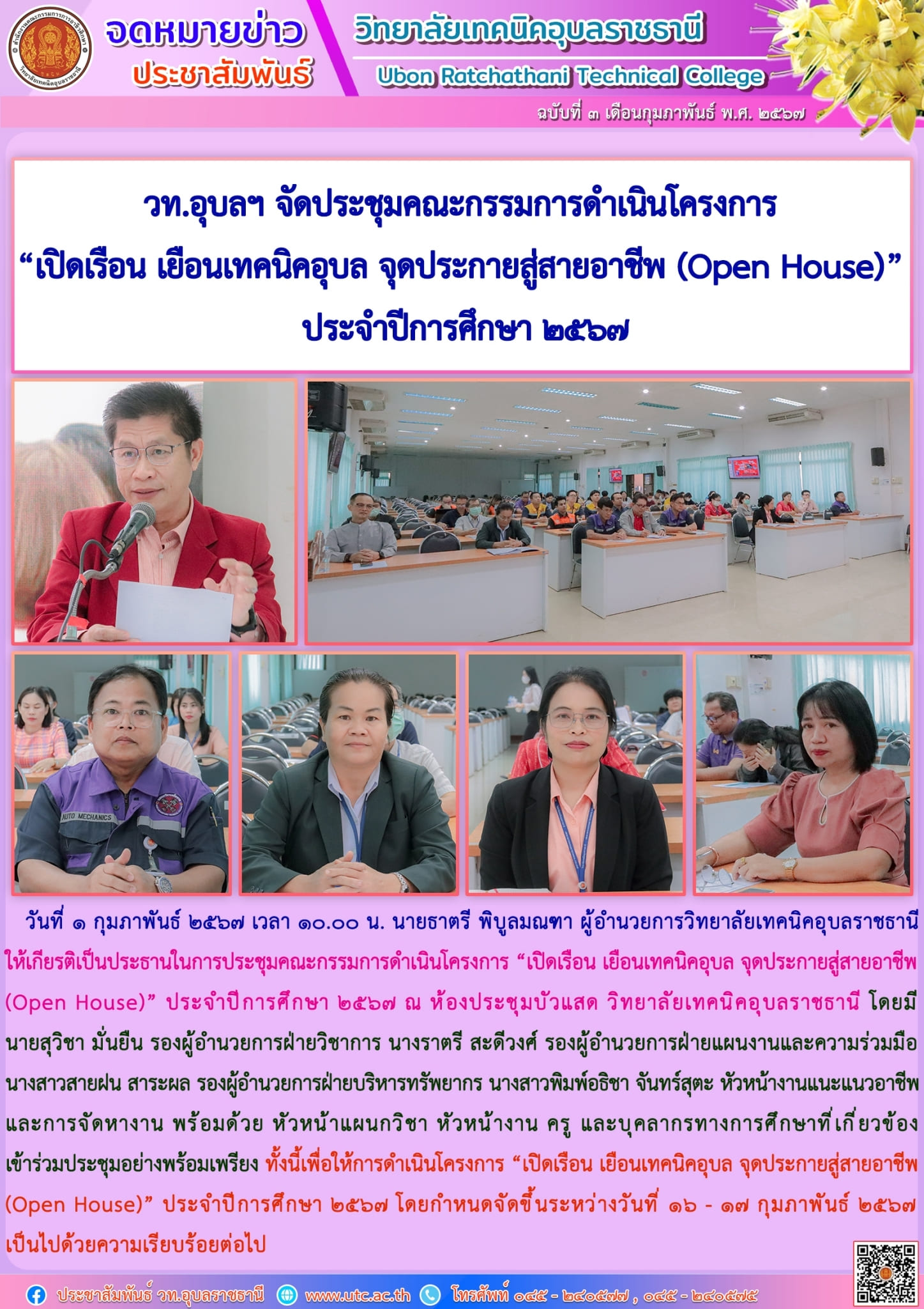 วันที่ ๑ กุมภาพันธ์ ๒๕๖๗ เวลา ๑๐.๐๐ น. นายธาตรี พิบูลมณฑา ผู้อำนวยการวิทยาลัยเทคนิคอุบลราชธานี ให้เกียรติเป็นประธานในการประชุมคณะกรรมการดำเนินโครงการ “เปิดเรือน เยือนเทคนิคอุบล จุดประกายสู่สายอาชีพ (Open House)” ประจำปีการศึกษา ๒๕๖๗ ณ ห้องประชุมบัวแสด วิทยาลัยเทคนิคอุบลราชธานี โดยมี นายสุวิชา มั่นยืน รองผู้อำนวยการฝ่ายวิชาการ นางราตรี สะดีวงศ์ รองผู้อำนวยการฝ่ายแผนงานและความร่วมมือ นางสาวสายฝน สาระผล รองผู้อำนวยการฝ่ายบริหารทรัพยากร นางสาวพิมพ์อธิชา จันทร์สุตะ หัวหน้างานแนะแนวอาชีพและการจัดหางาน พร้อมด้วย หัวหน้าแผนกวิชา หัวหน้างาน ครู และบุคลากรทางการศึกษาที่เกี่ยวข้อง เข้าร่วมประชุมอย่างพร้อมเพรียง ทั้งนี้เพื่อให้การดำเนินโครงการ “เปิดเรือน เยือนเทคนิคอุบล จุดประกายสู่สายอาชีพ (Open House)” ประจำปีการศึกษา ๒๕๖๗ โดยกำหนดจัดขึ้นระหว่างวันที่ ๑๖ – ๑๗ กุมภาพันธ์ ๒๕๖๗ เป็นไปด้วยความเรียบร้อยต่อไป