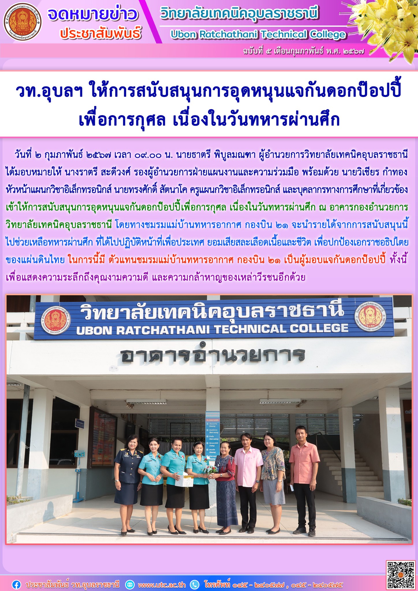วันที่ ๒ กุมภาพันธ์ ๒๕๖๗ เวลา ๐๙.๐๐ น. นายธาตรี พิบูลมณฑา ผู้อำนวยการวิทยาลัยเทคนิคอุบลราชธานี ได้มอบหมายให้ นางราตรี สะดีวงศ์ รองผู้อำนวยการฝ่ายแผนงานและความร่วมมือ พร้อมด้วย นายวิเชียร กำทอง หัวหน้าแผนกวิชาอิเล็กทรอนิกส์ นายทรงศักดิ์ สัตนาโค ครูแผนกวิชาอิเล็กทรอนิกส์ และบุคลากรทางการศึกษาที่เกี่ยวข้อง เข้าให้การสนับสนุนการอุดหนุนแจกันดอกป๊อปปี้เพื่อการกุศล เนื่องในวันทหารผ่านศึก ณ อาคารกองอำนวยการ วิทยาลัยเทคนิคอุบลราชธานี โดยทางชมรมแม่บ้านทหารอากาศ กองบิน ๒๑ จะนำรายได้จากการสนับสนุนนี้ ไปช่วยเหลือทหารผ่านศึก ที่ได้ไปปฏิบัติหน้าที่เพื่อประเทศ ยอมเสียสละเลือดเนื้อและชีวิต เพื่อปกป้องเอกราชอธิปไตยของแผ่นดินไทย ในการนี้มี ตัวแทนชมรมแม่บ้านทหารอากาศ กองบิน ๒๑ เป็นผู้มอบแจกันดอกป๊อปปี้ ทั้งนี้เพื่อแสดงความระลึกถึงคุณงามความดี และความกล้าหาญของเหล่าวีรชนอีกด้วย