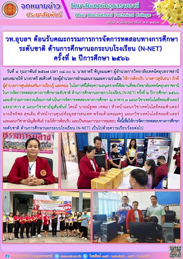 วันที่ ๔ กุมภาพันธ์ ๒๕๖๗ เวลา ๐๘.๐๐ น. นายธาตรี พิบูลมณฑา ผู้อำนวยการวิทยาลัยเทคนิคอุบลราชธานี มอบหมายให้ นางราตรี สะดีวงศ์ รองผู้อำนวยการฝ่ายแผนงานและความร่วมมือ ให้การต้อนรับ นางสาวสุนันธนา ภักดี ผู้อำนวยการศูนย์ส่งเสริมการเรียนรู้ และคณะ ในโอกาสที่ได้ขอความอนุเคราะห์ใช้สถานที่ของวิทยาลัยเทคนิคอุบลราชธานีในการจัดการทดสอบทางการศึกษาระดับชาติ ด้านการศึกษานอกระบบโรงเรียน (N-NET) ครั้งที่ ๒ ปีการศึกษา ๒๕๖๖ และเข้าร่วมการตรวจเยี่ยมการดำเนินการจัดการทดสอบทางการศึกษา ณ อาคาร ๓ แผนกวิชาเทคโนโลยีคอมพิวเตอร์ และอาคาร ๕ แผนกวิชาสามัญสัมพันธ์ โดยมี นายณัฐพล เทพมา หัวหน้าแผนกวิชาเทคโนโลยีคอมพิวเตอร์ นายอิทธิพล สุขเติม หัวหน้างานศูนย์ข้อมูลสารสนเทศ พร้อมด้วยคณะครู แผนกวิชาเทคโนโลยีคอมพิวเตอร์และแผนกวิชาสามัญสัมพันธ์ ร่วมให้การต้อนรับ และเป็นคณะกรรมการคุมสอบ ทั้งนี้เพื่อให้การจัดการทดสอบทางการศึกษาระดับชาติ ด้านการศึกษานอกระบบโรงเรียน (N-NET) เป็นไปด้วยความเรียบร้อยต่อไป