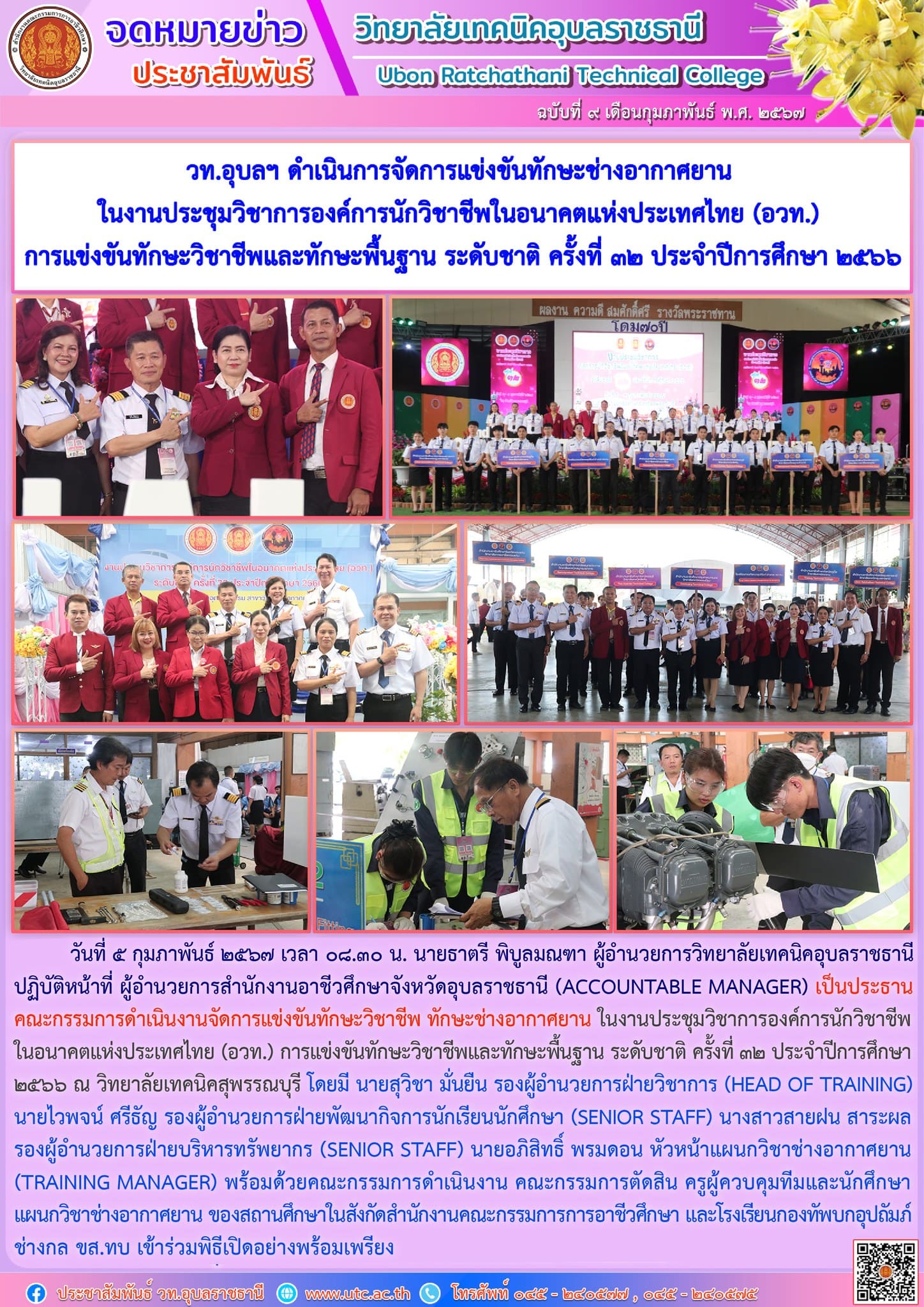 วันที่ ๕ กุมภาพันธ์ ๒๕๖๗ เวลา ๐๘.๓๐ น. นายธาตรี พิบูลมณฑา ผู้อำนวยการวิทยาลัยเทคนิคอุบลราชธานี ปฏิบัติหน้าที่ ผู้อำนวยการสำนักงานอาชีวศึกษาจังหวัดอุบลราชธานี (Accountable Manager) เป็นประธานคณะกรรมการดำเนินงานจัดการแข่งขันทักษะวิชาชีพ ทักษะช่างอากาศยาน ในงานประชุมวิชาการองค์การนักวิชาชีพในอนาคตแห่งประเทศไทย (อวท.) การแข่งขันทักษะวิชาชีพและทักษะพื้นฐาน ระดับชาติ ครั้งที่ ๓๒ ประจำปีการศึกษา ๒๕๖๖ ณ วิทยาลัยเทคนิคสุพรรณบุรี โดยมี นายสุวิชา มั่นยืน รองผู้อำนวยการฝ่ายวิชาการ (Head of Training) นายไวพจน์ ศรีธัญ รองผู้อำนวยการฝ่ายพัฒนากิจการนักเรียนนักศึกษา (Senior Staff) นางสาวสายฝน สาระผล รองผู้อำนวยการฝ่ายบริหารทรัพยากร (Senior Staff) นายอภิสิทธิ์ พรมดอน หัวหน้าแผนกวิชาช่างอากาศยาน (Training Manager) พร้อมด้วยคณะกรรมการดำเนินงาน คณะกรรมการตัดสิน ครูผู้ควบคุมทีมและนักศึกษา แผนกวิชาช่างอากาศยาน ของสถานศึกษาในสังกัดสำนักงานคณะกรรมการการอาชีวศึกษา และโรงเรียนกองทัพบกอุปถัมภ์ ช่างกล ขส.ทบ เข้าร่วมพิธีเปิดอย่างพร้อมเพรียง