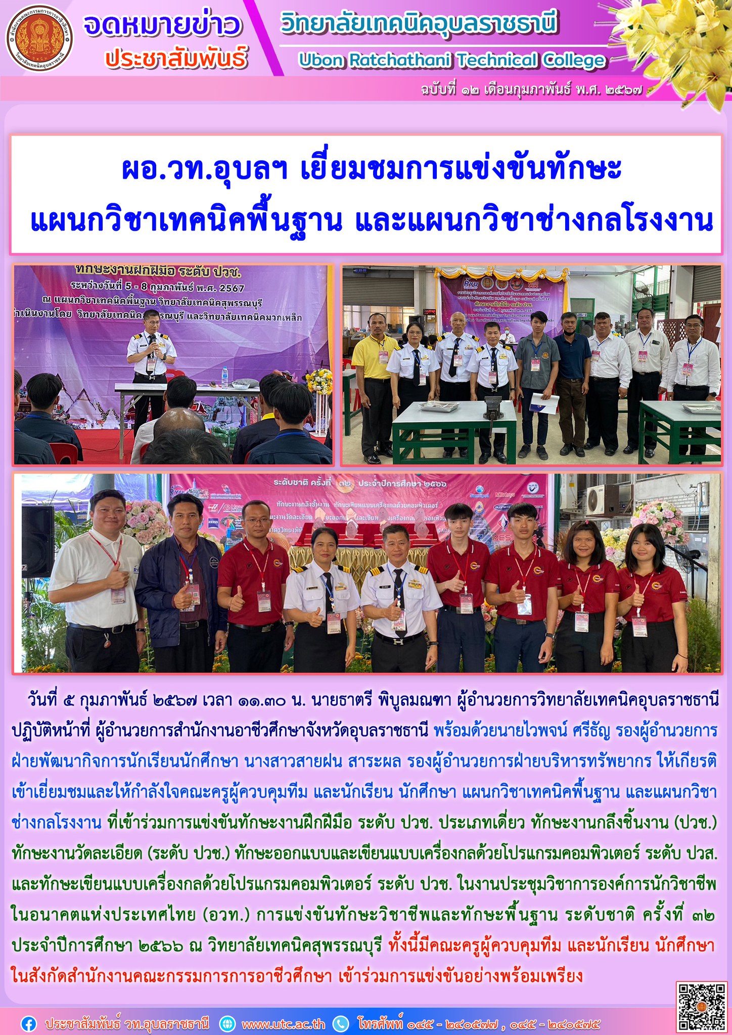 วันที่ ๕ กุมภาพันธ์ ๒๕๖๗ เวลา ๑๑.๑๕ น. นายธาตรี พิบูลมณฑา ผู้อำนวยการวิทยาลัยเทคนิคอุบลราชธานี ปฏิบัติหน้าที่ ผู้อำนวยการสำนักงานอาชีวศึกษาจังหวัดอุบลราชธานี พร้อมด้วย นางสาวสายฝน สาระผล รองผู้อำนวยการฝ่ายบริหารทรัพยากร ให้เกียรติเข้าเยี่ยมชมและให้กำลังใจคณะครูผู้ควบคุมทีม และนักเรียน นักศึกษา แผนกวิชาโยธา ที่เข้าร่วมการแข่งขันทักษะการสำรวจเพื่อก่อสร้าง ระดับ ปวส. ทักษะงานคอนกรีต และทักษะสำรวจเพื่อก่อสร้าง ในงานประชุมวิชาการองค์การนักวิชาชีพในอนาคตแห่งประเทศไทย (อวท.) การแข่งขันทักษะวิชาชีพและทักษะพื้นฐาน ระดับชาติ ครั้งที่ ๓๒ ประจำปีการศึกษา ๒๕๖๖ ณ วิทยาลัยเทคนิคสุพรรณบุรี ทั้งนี้มีคณะครูผู้ควบคุมทีม และนักเรียน นักศึกษา ในสังกัดสำนักงานคณะกรรมการการอาชีวศึกษา เข้าร่วมการแข่งขันอย่างพร้อมเพรียง