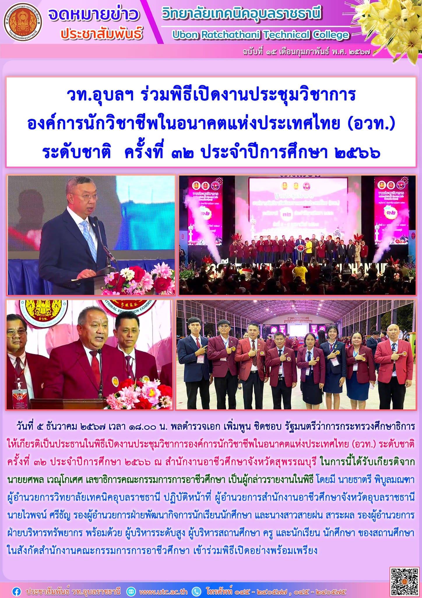 วันที่ ๕ กุมภาพันธ์ ๒๕๖๗ เวลา ๑๘.๐๐ น. พลตำรวจเอก เพิ่มพูน ชิดชอบ รัฐมนตรีว่าการกระทรวงศึกษาธิการ ให้เกียรติเป็นประธานในพิธีเปิดงานประชุมวิชาการองค์การนักวิชาชีพในอนาคตแห่งประเทศไทย (อวท.) ระดับชาติ ครั้งที่ ๓๒ ประจำปีการศึกษา ๒๕๖๖ ณ สำนักงานอาชีวศึกษาจังหวัดสุพรรณบุรี ในการนี้ได้รับเกียรติจาก นายยศพล เวณุโกเศศ เลขาธิการคณะกรรมการการอาชีวศึกษา เป็นผู้กล่าวรายงานในพิธี โดยมี นายธาตรี พิบูลมณฑา ผู้อำนวยการวิทยาลัยเทคนิคอุบลราชธานี ปฏิบัติหน้าที่ ผู้อำนวยการสำนักงานอาชีวศึกษาจังหวัดอุบลราชธานี นายไวพจน์ ศรีธัญ รองผู้อำนวยการฝ่ายพัฒนากิจการนักเรียนนักศึกษา และนางสาวสายฝน สาระผล รองผู้อำนวยการฝ่ายบริหารทรัพยากร พร้อมด้วย ผู้บริหารระดับสูง ผู้บริหารสถานศึกษา ครู และนักเรียน นักศึกษา ของสถานศึกษาในสังกัดสำนักงานคณะกรรมการการอาชีวศึกษา เข้าร่วมพิธีเปิดอย่างพร้อมเพรียง