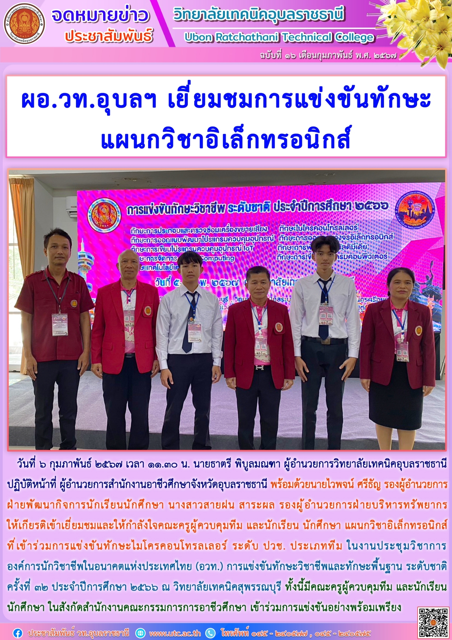 วันที่ ๖ กุมภาพันธ์ ๒๕๖๗ เวลา ๑๑.๓๐ น. นายธาตรี พิบูลมณฑา ผู้อำนวยการวิทยาลัยเทคนิคอุบลราชธานี ปฏิบัติหน้าที่ ผู้อำนวยการสำนักงานอาชีวศึกษาจังหวัดอุบลราชธานี พร้อมด้วยนายไวพจน์ ศรีธัญ รองผู้อำนวยการฝ่ายพัฒนากิจการนักเรียนนักศึกษา นางสาวสายฝน สาระผล รองผู้อำนวยการฝ่ายบริหารทรัพยากร ให้เกียรติเข้าเยี่ยมชมและให้กำลังใจคณะครูผู้ควบคุมทีม และนักเรียน นักศึกษา แผนกวิชาอิเล็กทรอนิกส์ ที่เข้าร่วมการแข่งขันทักษะไมโครคอนโทรลเลอร์ ระดับ ปวช. ประเภททีม ในงานประชุมวิชาการองค์การนักวิชาชีพในอนาคตแห่งประเทศไทย (อวท.) การแข่งขันทักษะวิชาชีพและทักษะพื้นฐาน ระดับชาติ ครั้งที่ ๓๒ ประจำปีการศึกษา ๒๕๖๖ ณ วิทยาลัยเทคนิคสุพรรณบุรี ทั้งนี้มีคณะครูผู้ควบคุมทีม และนักเรียน นักศึกษา ในสังกัดสำนักงานคณะกรรมการการอาชีวศึกษา เข้าร่วมการแข่งขันอย่างพร้อมเพรียง