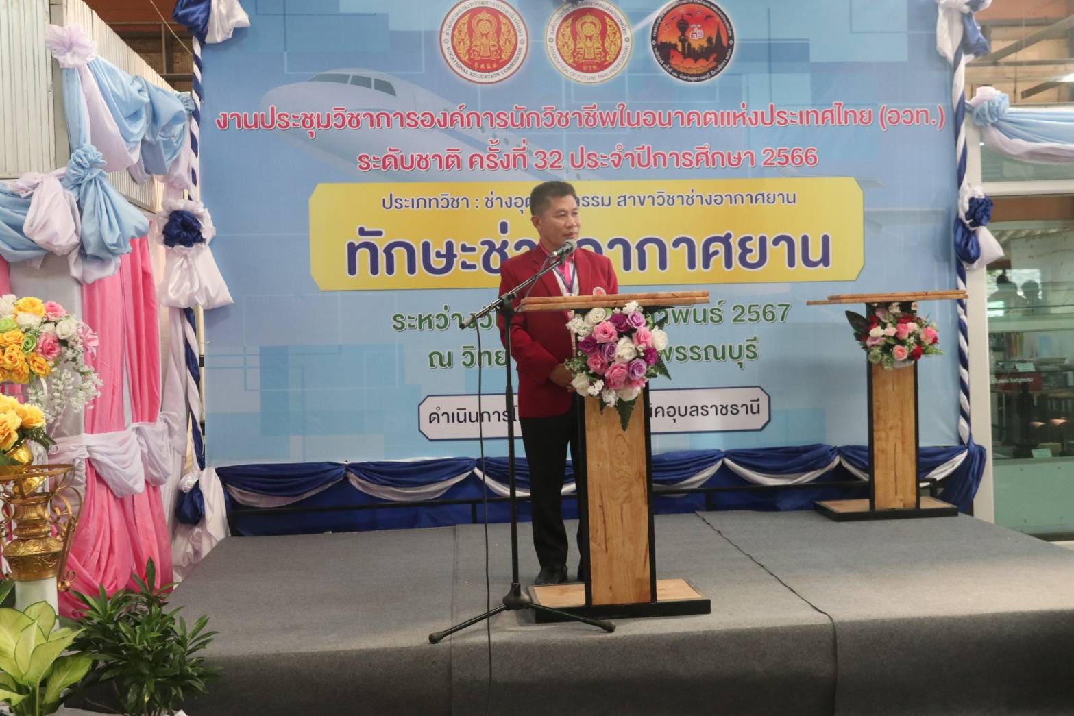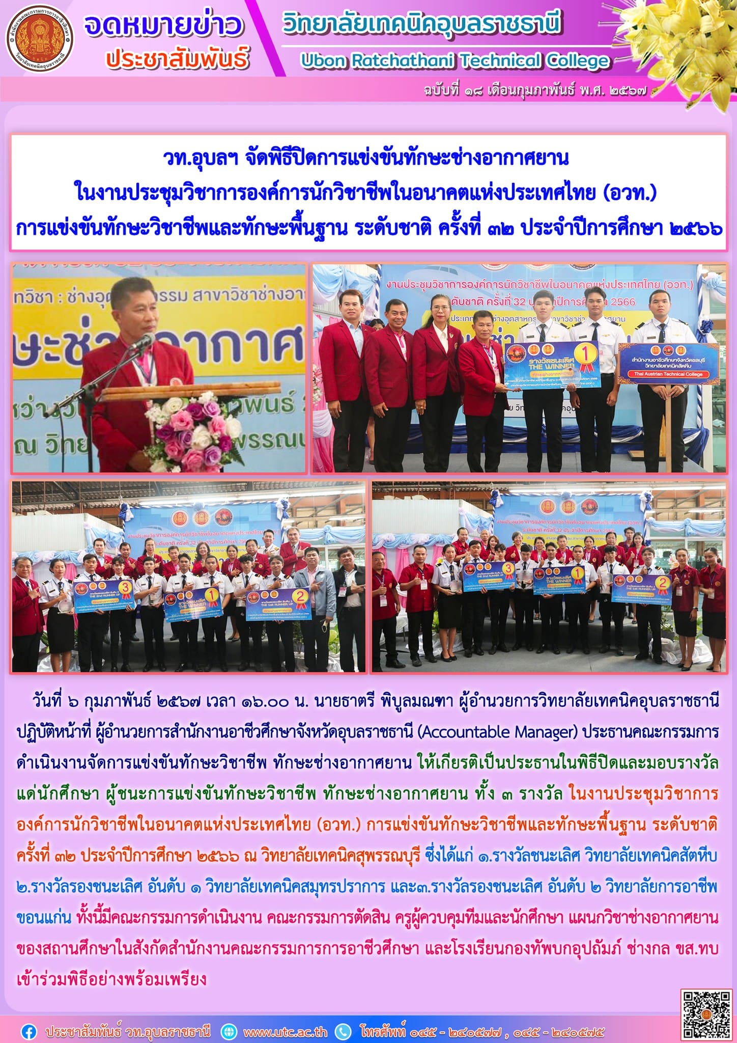วันที่ ๖ กุมภาพันธ์ ๒๕๖๗ เวลา ๑๖.๐๐ น. นายธาตรี พิบูลมณฑา ผู้อำนวยการวิทยาลัยเทคนิคอุบลราชธานี ปฏิบัติหน้าที่ ผู้อำนวยการสำนักงานอาชีวศึกษาจังหวัดอุบลราชธานี (Accountable Manager) ประธานคณะกรรมการดำเนินงานจัดการแข่งขันทักษะวิชาชีพ ทักษะช่างอากาศยาน ให้เกียรติเป็นประธานในพิธีปิดและมอบรางวัลแด่นักเรียน นักศึกษา ผู้ชนะการแข่งขันทักษะวิชาชีพ ทักษะช่างอากาศยาน ทั้ง ๓ รางวัล ในงานประชุมวิชาการองค์การนักวิชาชีพในอนาคตแห่งประเทศไทย (อวท.) การแข่งขันทักษะวิชาชีพและทักษะพื้นฐาน ระดับชาติ ครั้งที่ ๓๒ ประจำปีการศึกษา ๒๕๖๖ ณ วิทยาลัยเทคนิคสุพรรณบุรี ซึ่งได้แก่ ๑.รางวัลชนะเลิศ วิทยาลัยเทคนิคสัตหีบ ๒.รางวัลรองชนะเลิศ อันดับ ๑ วิทยาลัยเทคนิคสมุทรปราการ และ๓.รางวัลรองชนะเลิศ อันดับ ๒ วิทยาลัยการอาชีพขอนแก่น ทั้งนี้มีคณะกรรมการดำเนินงาน คณะกรรมการตัดสิน ครูผู้ควบคุมทีมและนักศึกษา แผนกวิชาช่างอากาศยาน ของสถานศึกษาในสังกัดสำนักงานคณะกรรมการการอาชีวศึกษา และโรงเรียนกองทัพบกอุปถัมภ์ ช่างกล ขส.ทบ เข้าร่วมพิธีอย่างพร้อมเพรียง