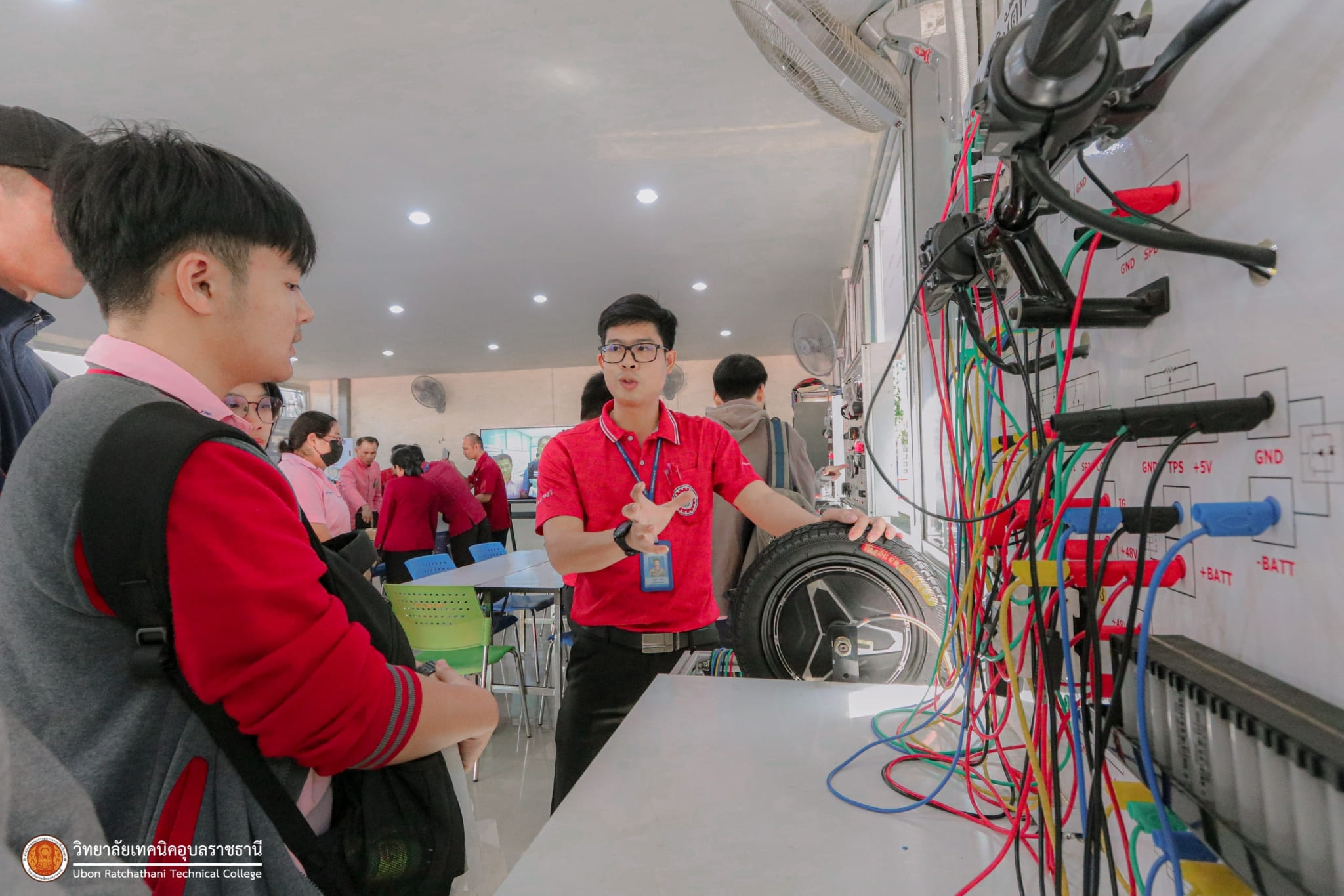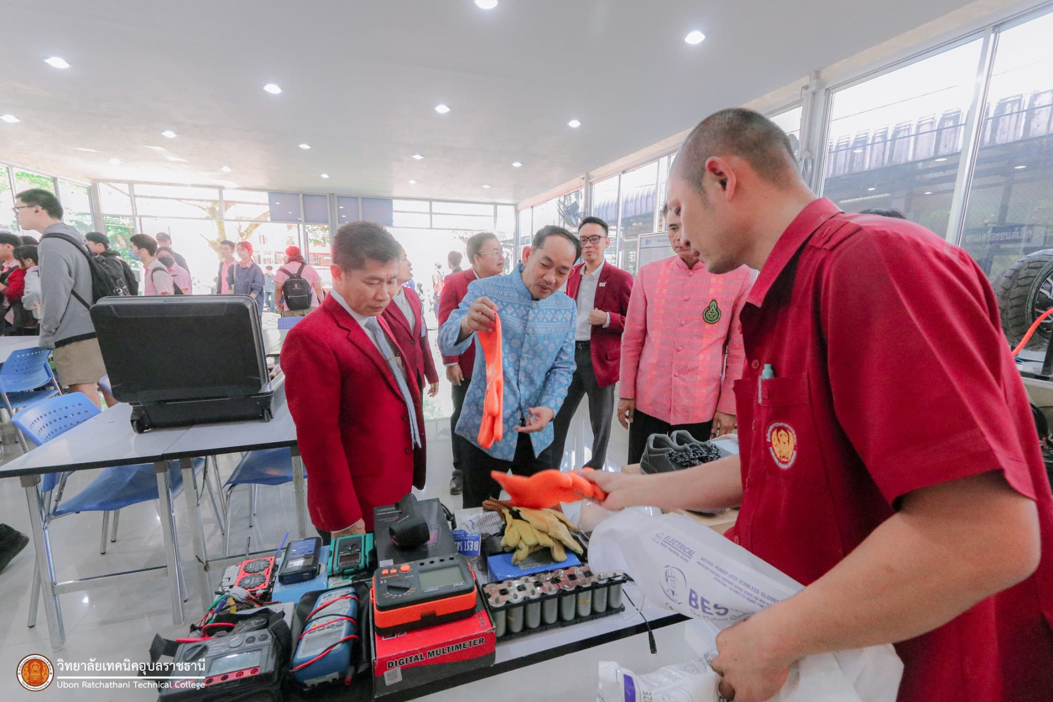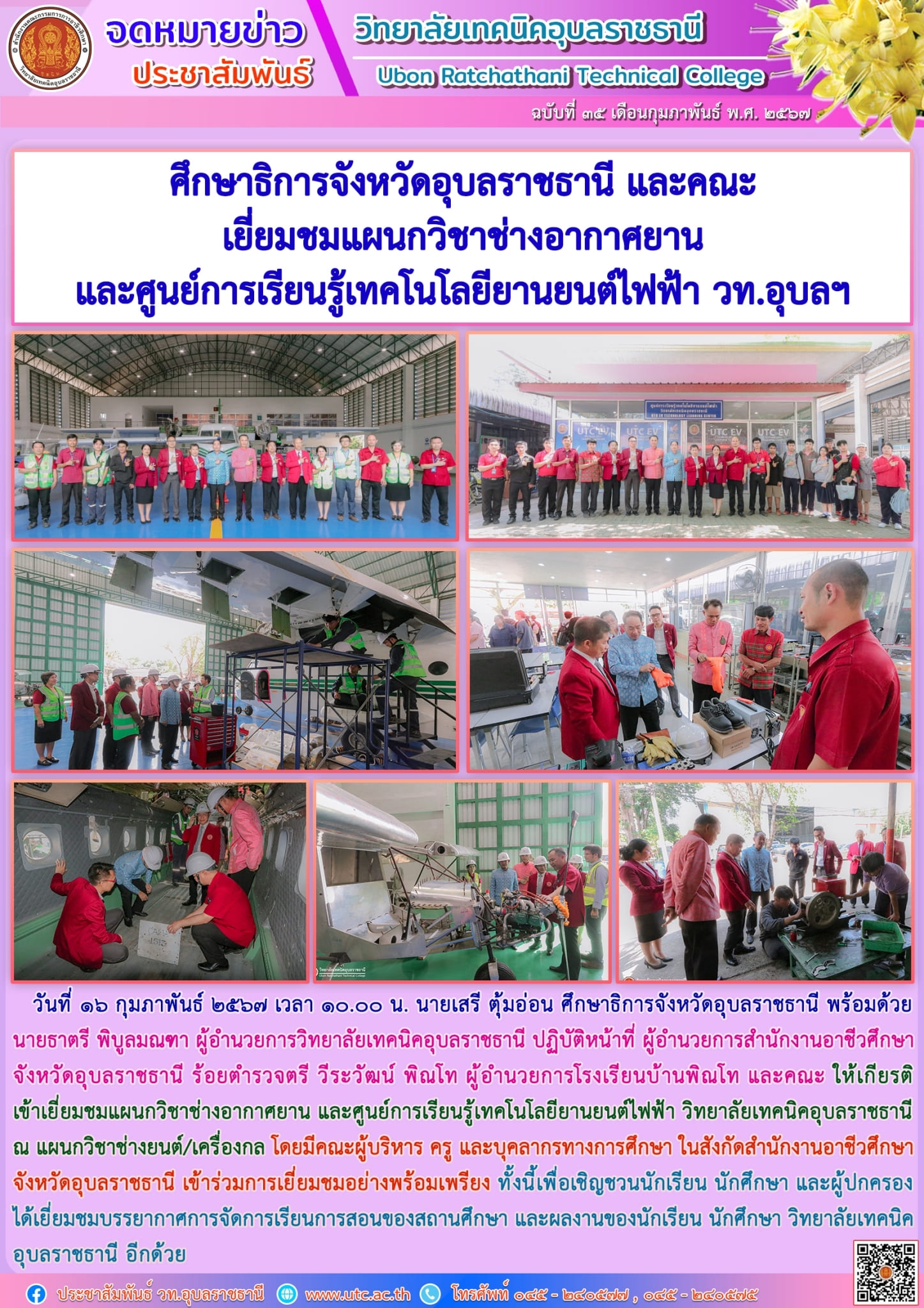 วันที่ ๑๖ กุมภาพันธ์ ๒๕๖๗ เวลา ๑๐.๐๐ น. นายเสรี ตุ้มอ่อน ศึกษาธิการจังหวัดอุบลราชธานี พร้อมด้วย นายธาตรี พิบูลมณฑา ผู้อำนวยการวิทยาลัยเทคนิคอุบลราชธานี ปฏิบัติหน้าที่ ผู้อำนวยการสำนักงานอาชีวศึกษาจังหวัดอุบลราชธานี ร้อยตำรวจตรี วีระวัฒน์ พิณโท ผู้อำนวยการโรงเรียนบ้านพิณโท และคณะ ให้เกียรติเข้าเยี่ยมชมแผนกวิชาช่างอากาศยาน และศูนย์การเรียนรู้เทคโนโลยียานยนต์ไฟฟ้า วิทยาลัยเทคนิคอุบลราชธานี ณ แผนกวิชาช่างยนต์/เครื่องกล โดยมีคณะผู้บริหาร ครู และบุคลากรทางการศึกษา ในสังกัดสำนักงานอาชีวศึกษาจังหวัดอุบลราชธานี เข้าร่วมการเยี่ยมชมอย่างพร้อมเพรียง ทั้งนี้เพื่อเชิญชวนนักเรียน นักศึกษา และผู้ปกครอง ได้เยี่ยมชมบรรยากาศการจัดการเรียนการสอนของสถานศึกษา และผลงานของนักเรียน นักศึกษา วิทยาลัยเทคนิคอุบลราชธานี อีกด้วย